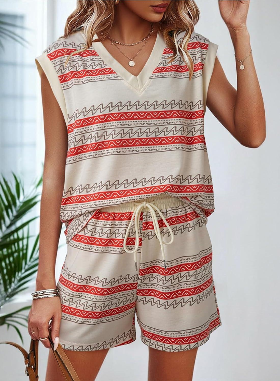 Dokotoo 2 Piece Sets for Women Summer V Neck Sleeveless Top Tie Waist Shorts Striped Casual Outfits with Pockets(Apricot Stripe)