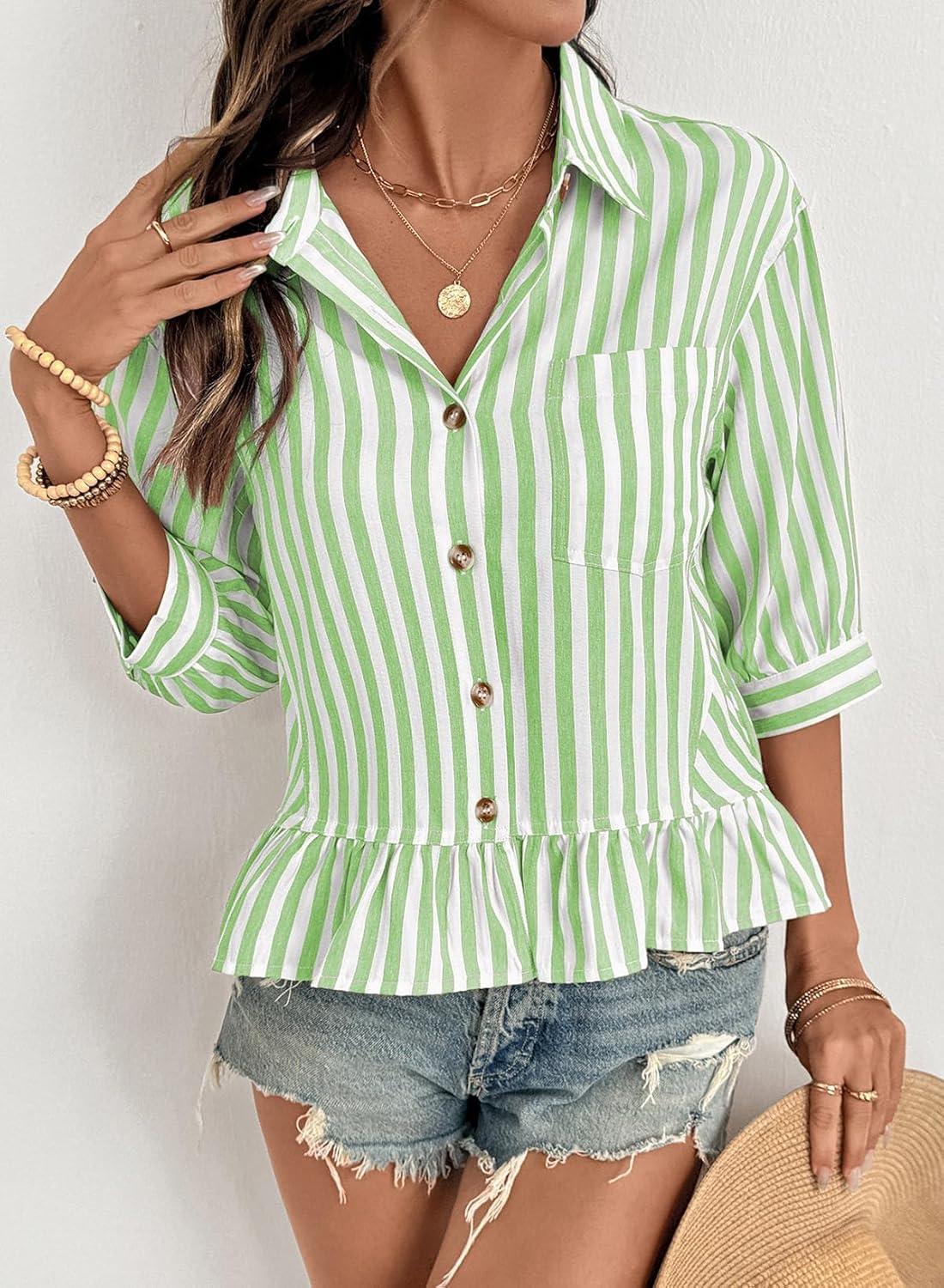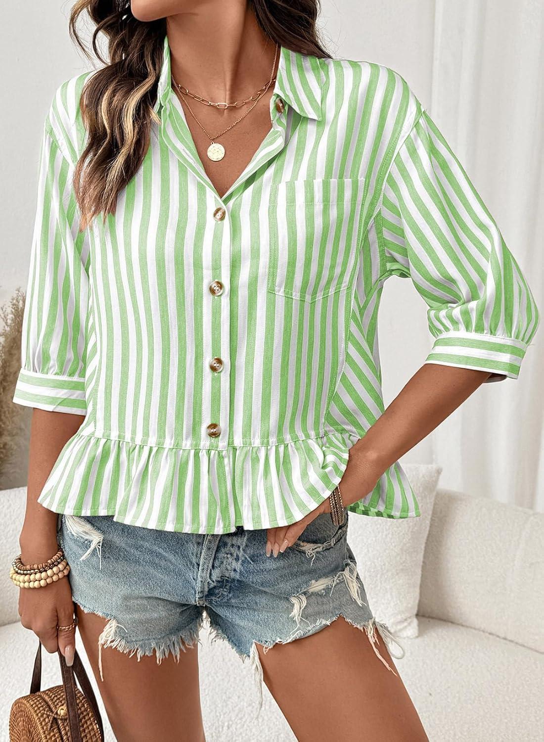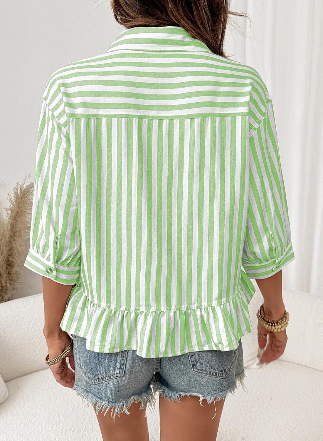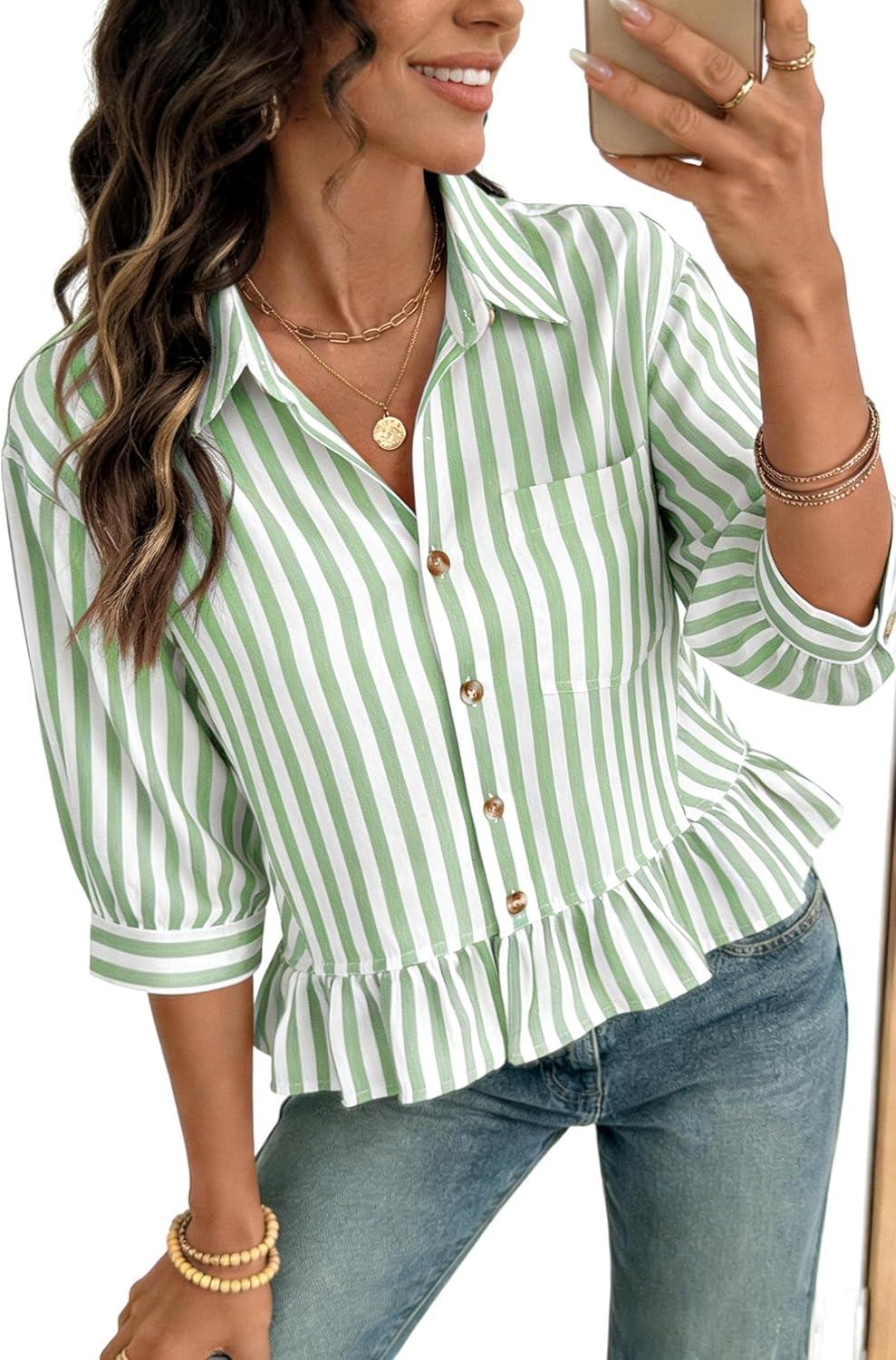 Dokotoo 3/4 Length Sleeve Womens Tops Dressy Casual Blouses Babydoll Tops Button Down Striped Shirt(A Green Stripe)