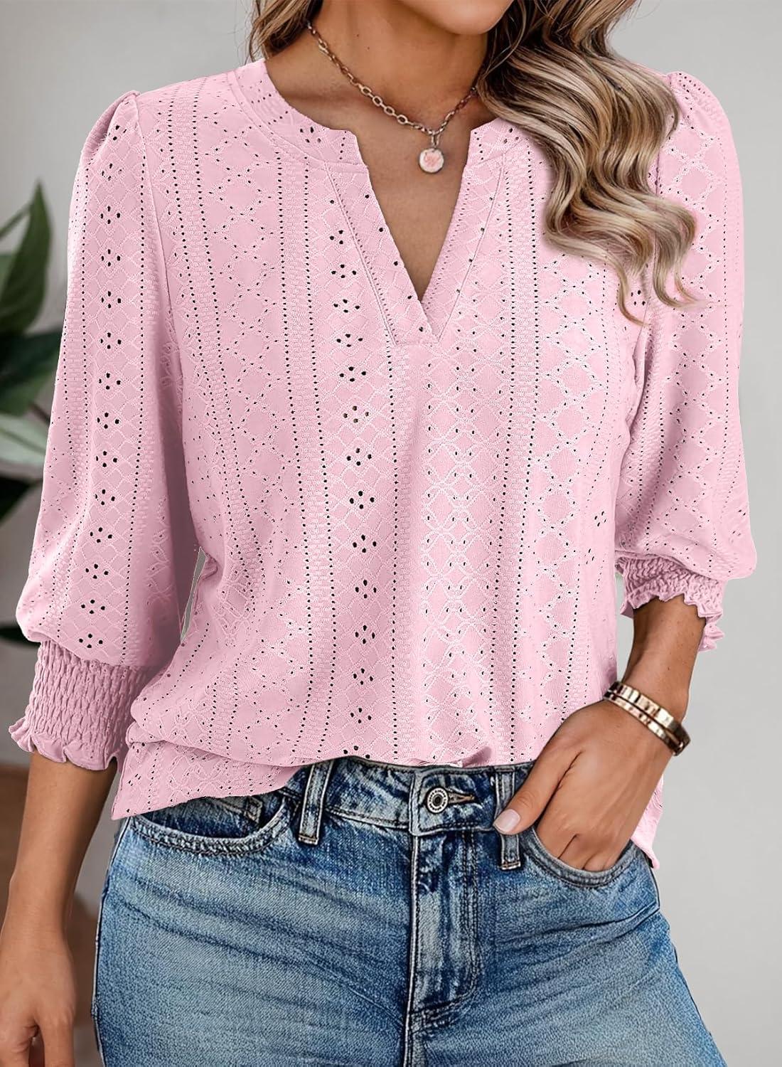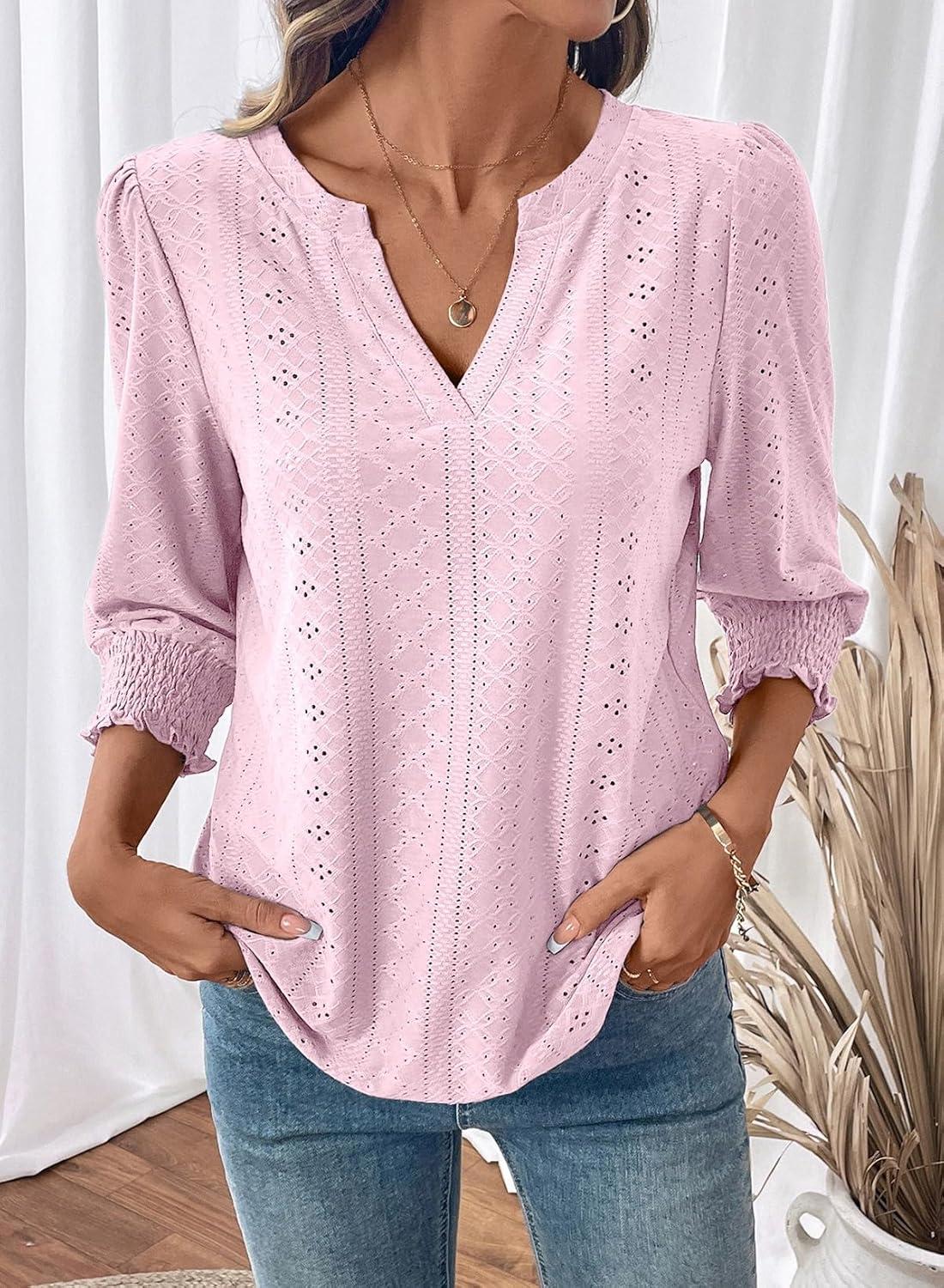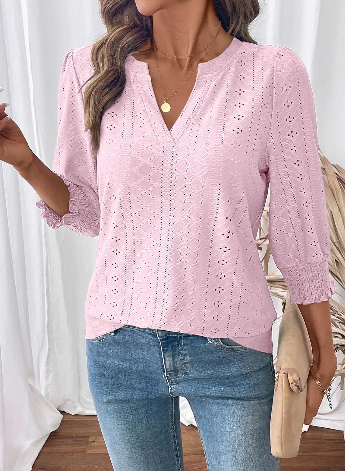 Dokotoo 3/4 Length Sleeve Womens Tops Dressy Casual V Neck Cute T-Shirts Hollow Out Blouses(Light Pink)