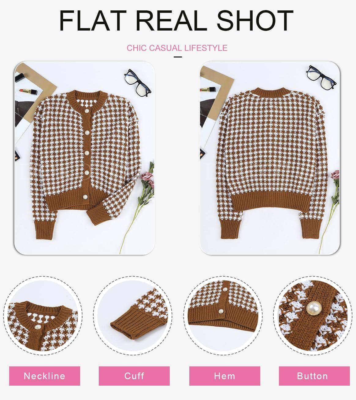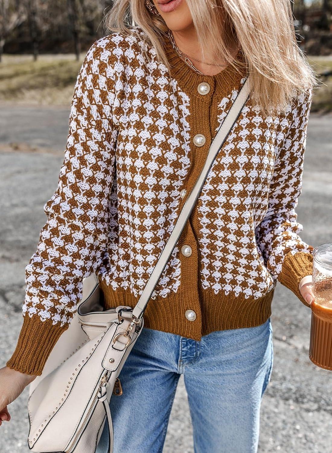 Dokotoo Cardigan Sweaters for Women V Neck Button Down Long Sleeve Plaid Knit Cardigans Sweater Tops(Brown)