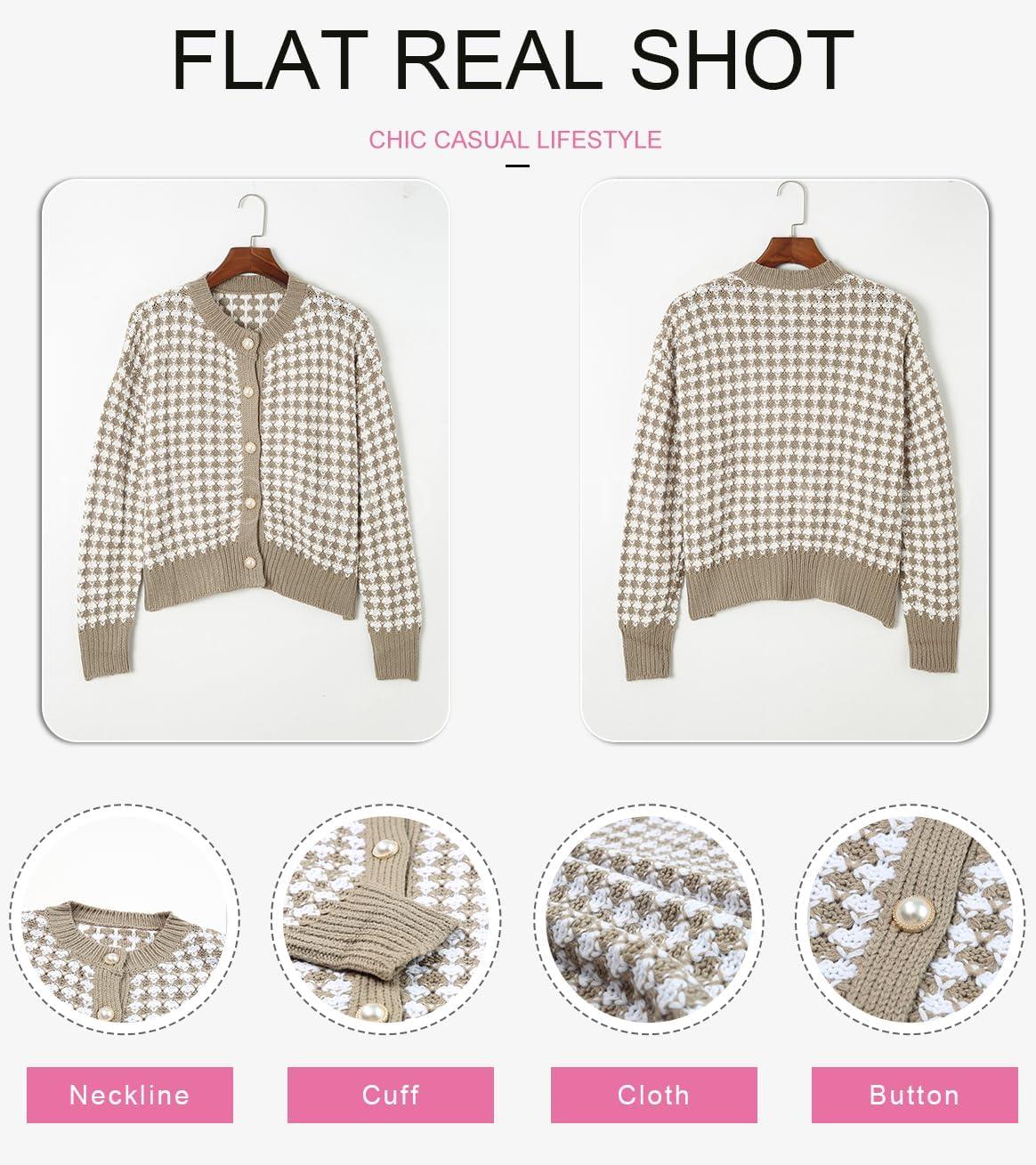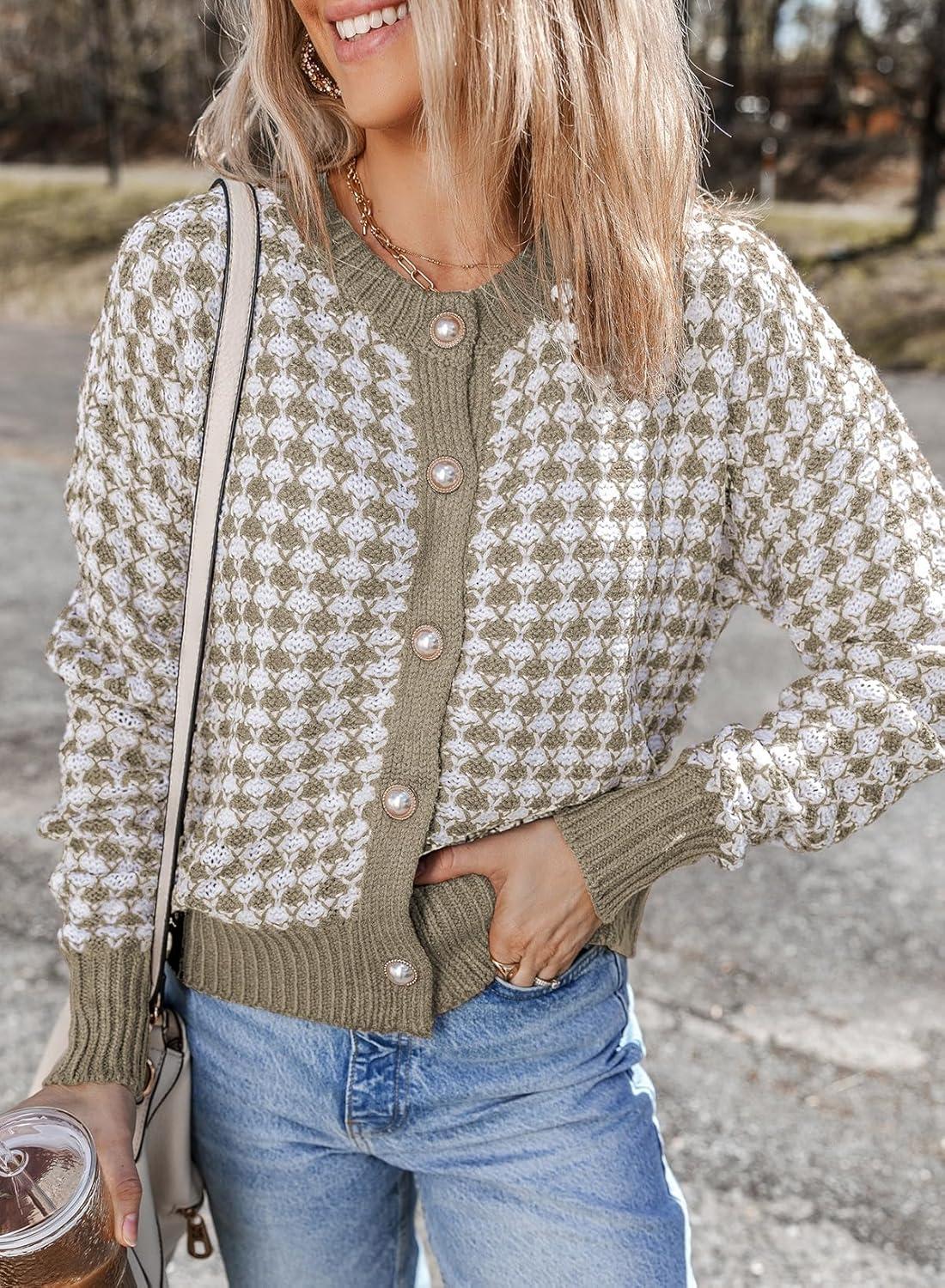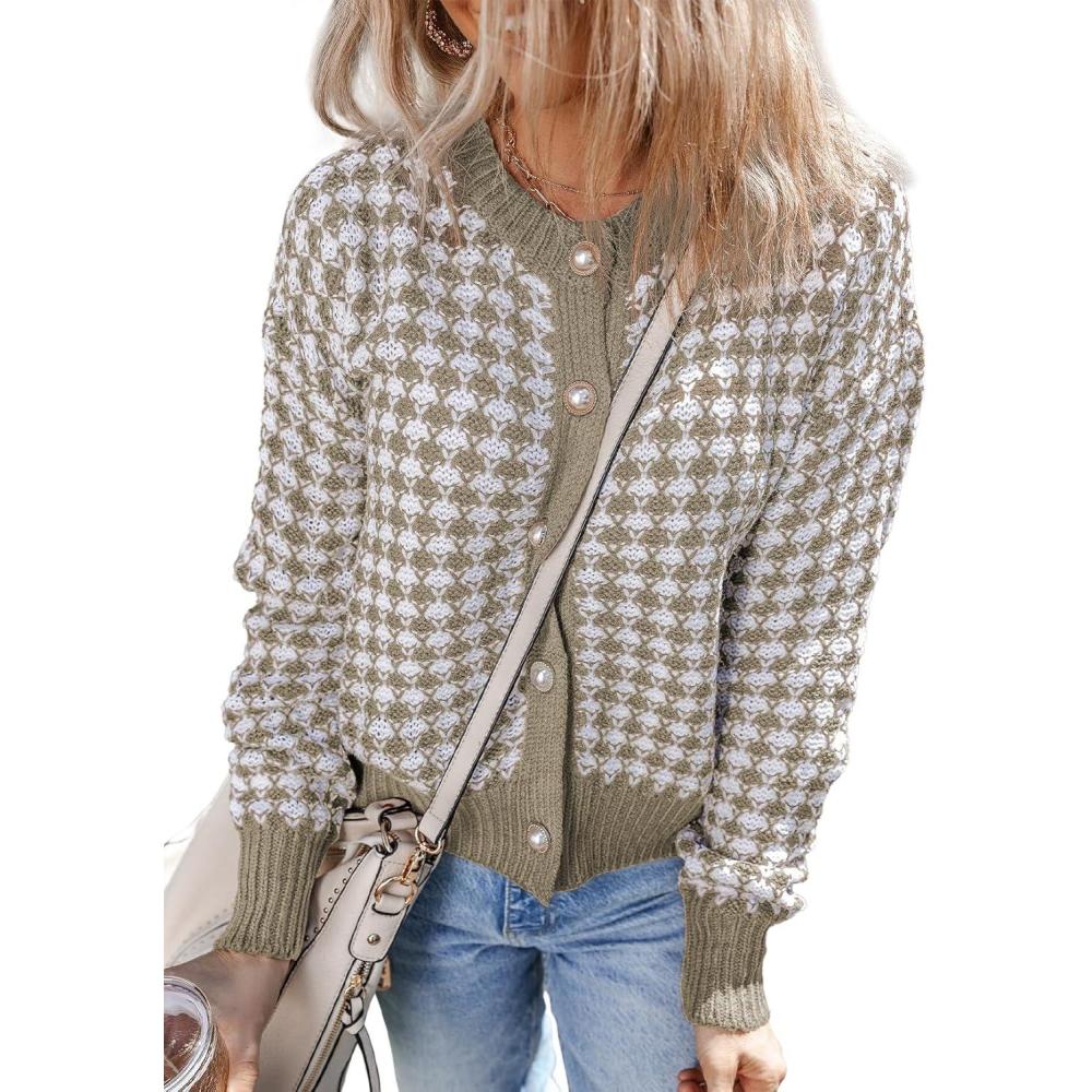 Dokotoo Cardigan Sweaters for Women V Neck Button Down Long Sleeve Plaid Knit Cardigans Sweater Tops(Khaki)