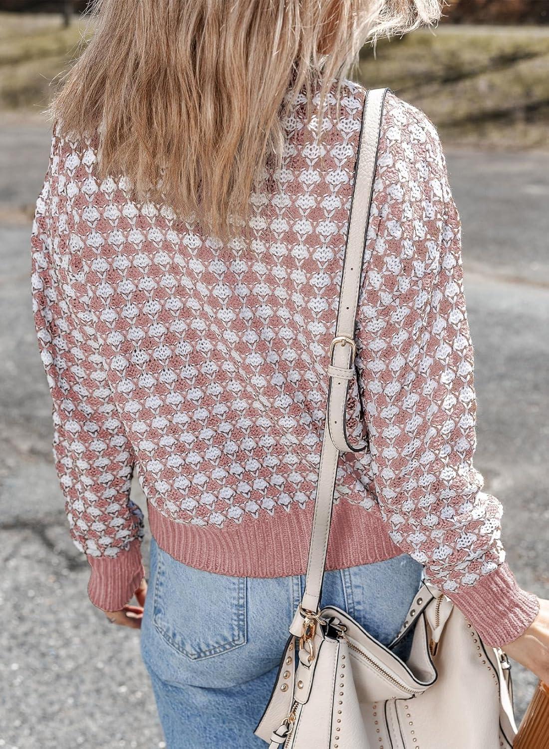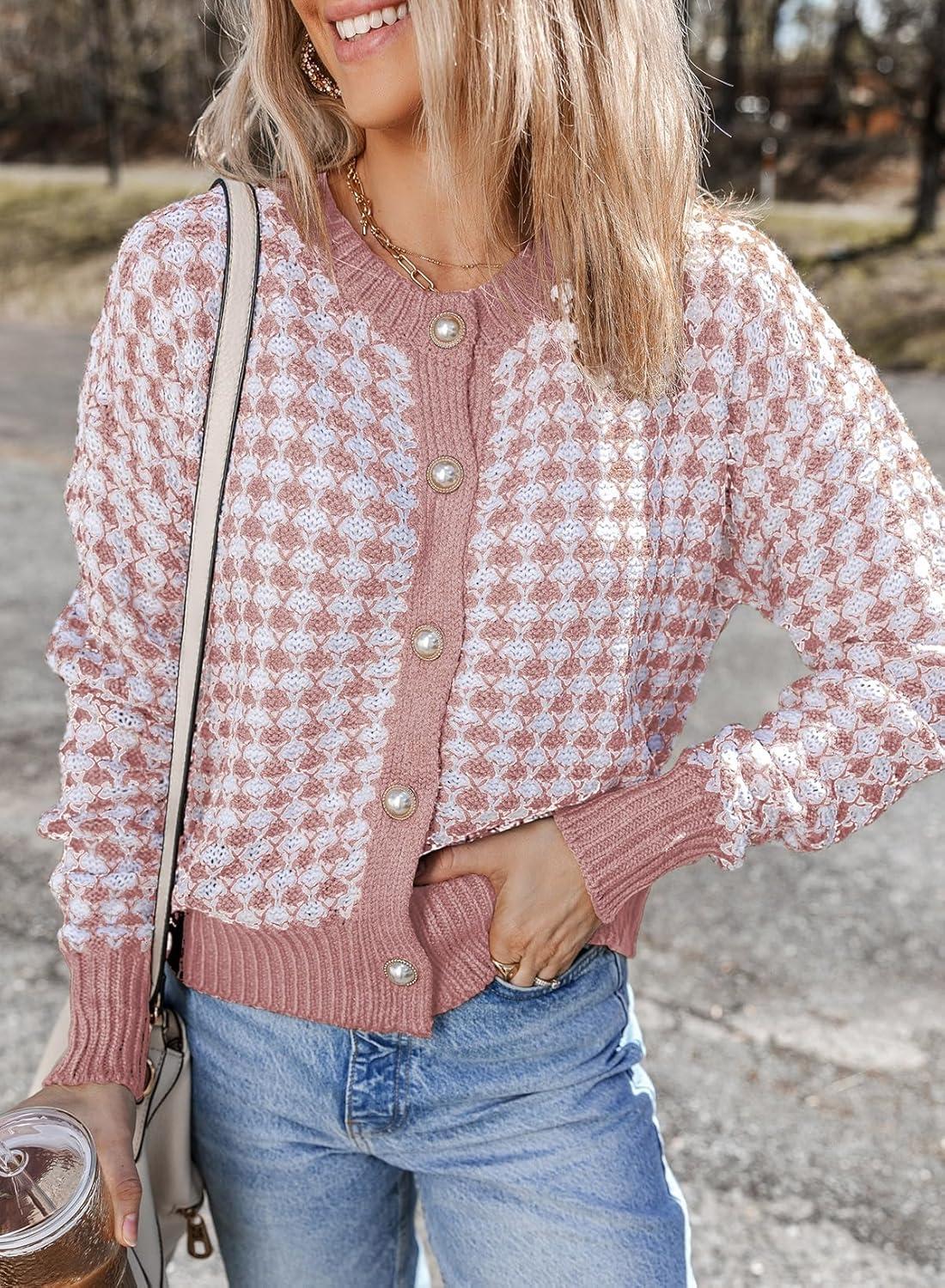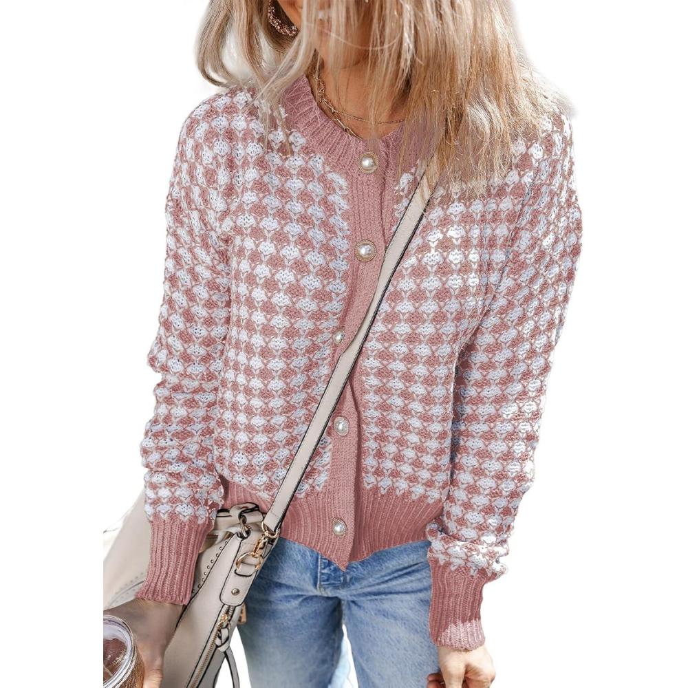 Dokotoo Cardigan Sweaters for Women V Neck Button Down Long Sleeve Plaid Knit Cardigans Sweater Tops(Pink)