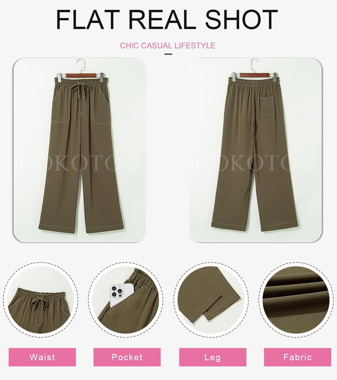 Dokotoo Casual Pants for Women Loose Elastic High Waisted Drawstring Wide Leg Pants with Pockets(Khaki)