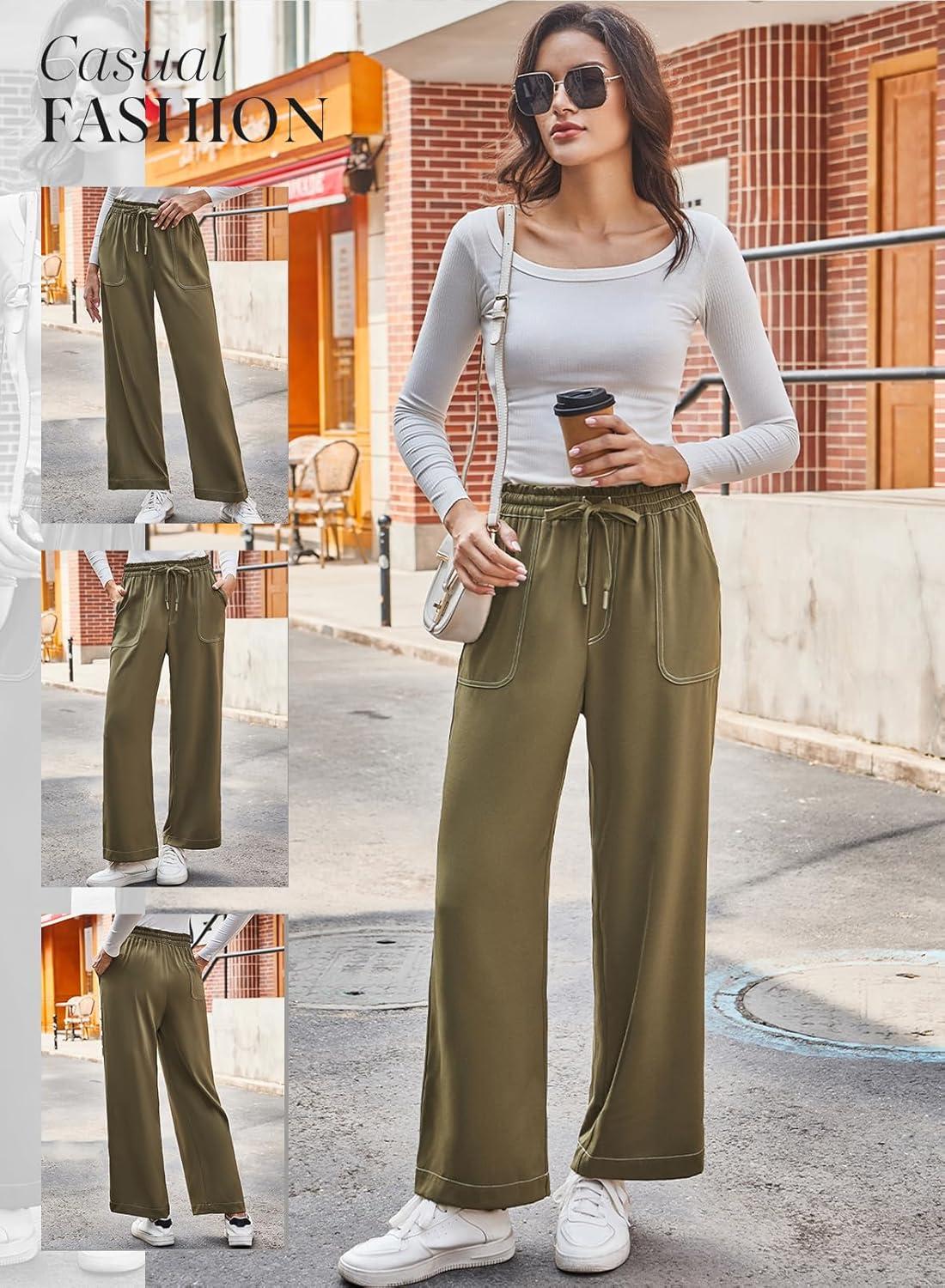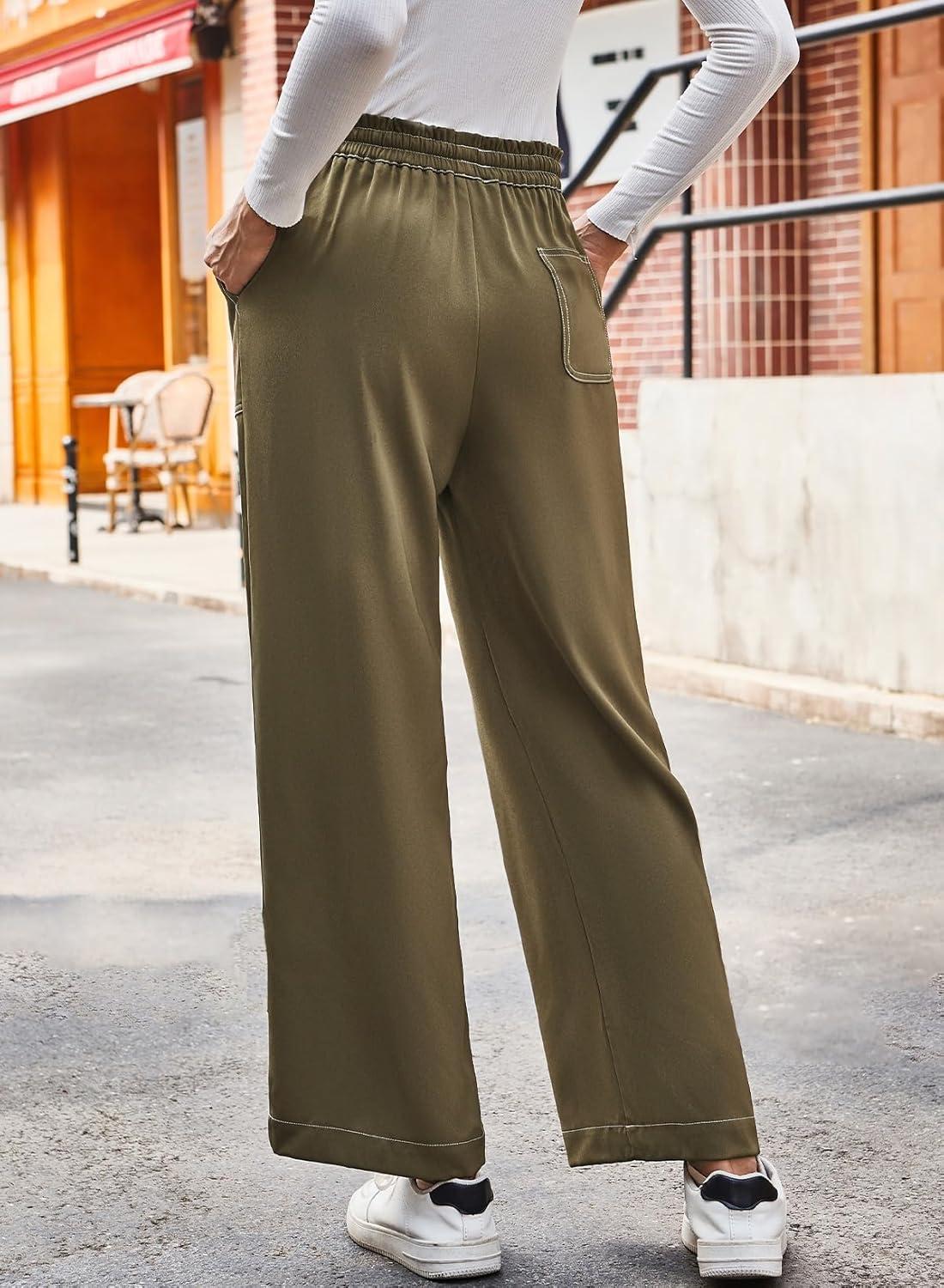 Dokotoo Casual Pants for Women Loose Elastic High Waisted Drawstring Wide Leg Pants with Pockets(Jungle Green)