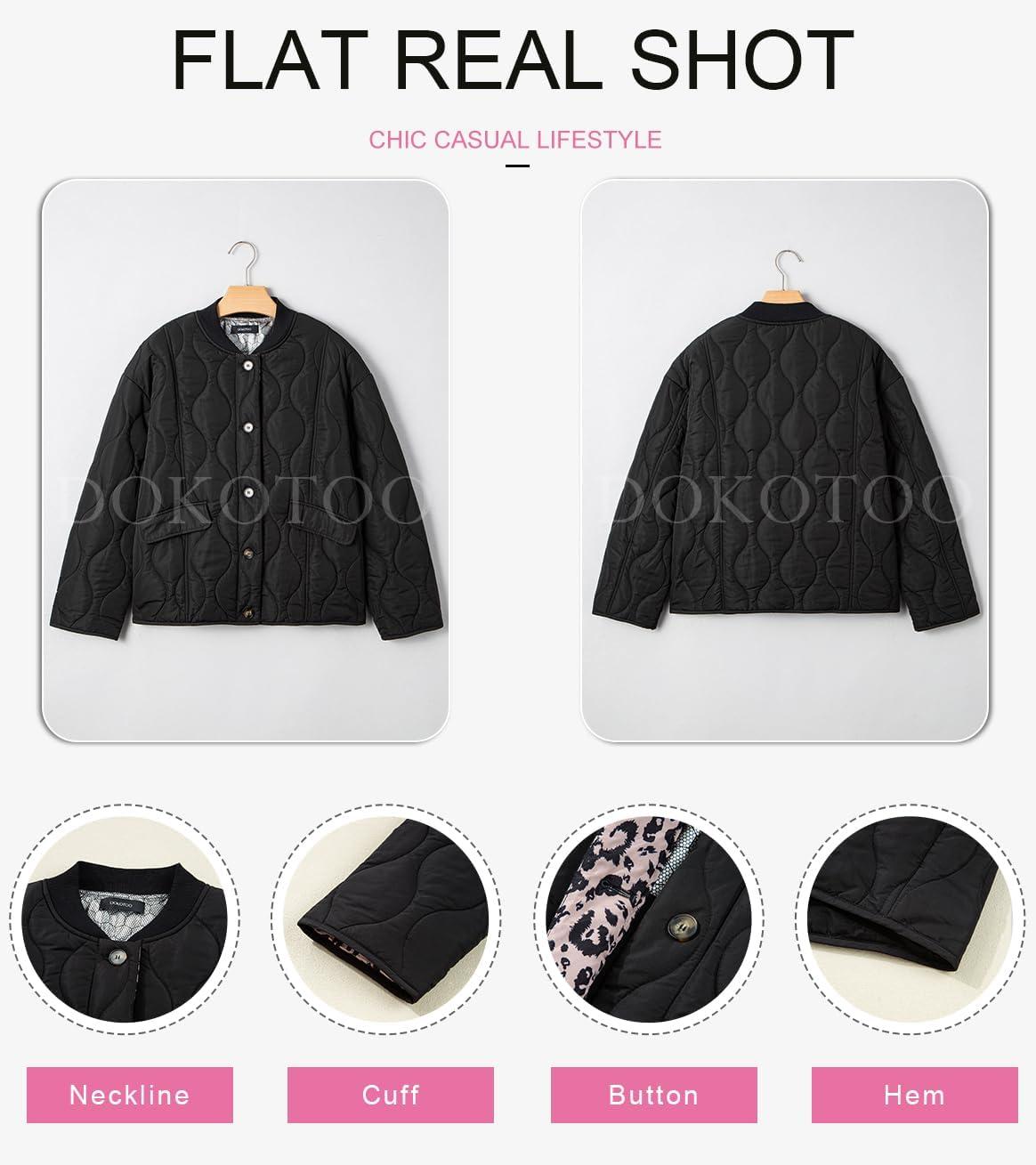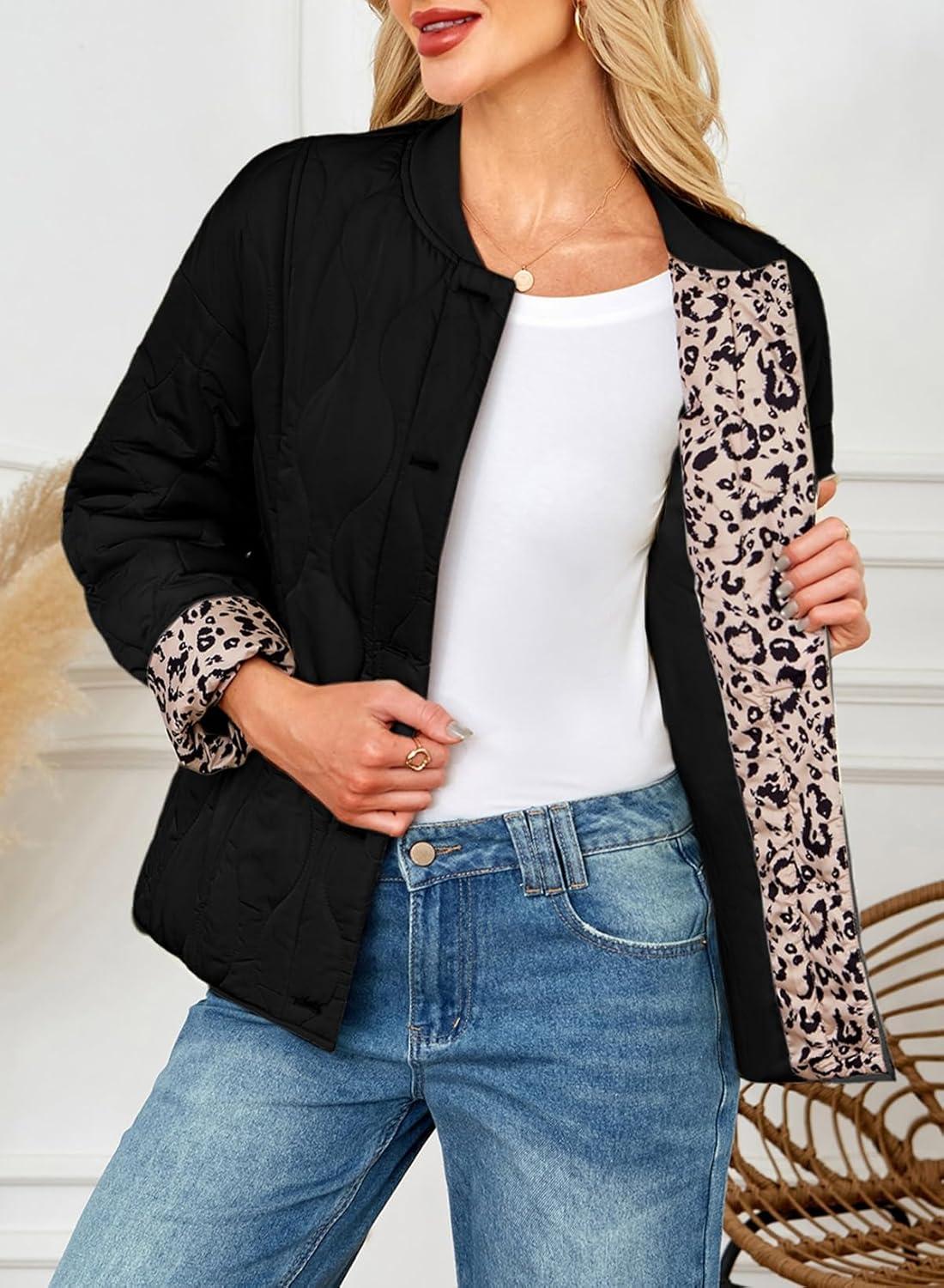 Dokotoo Casual Quilted Jackets for Women Button Down Leopard Puffer Jacket Womens Winter Coats with Pockets(Black)