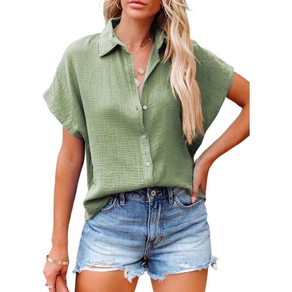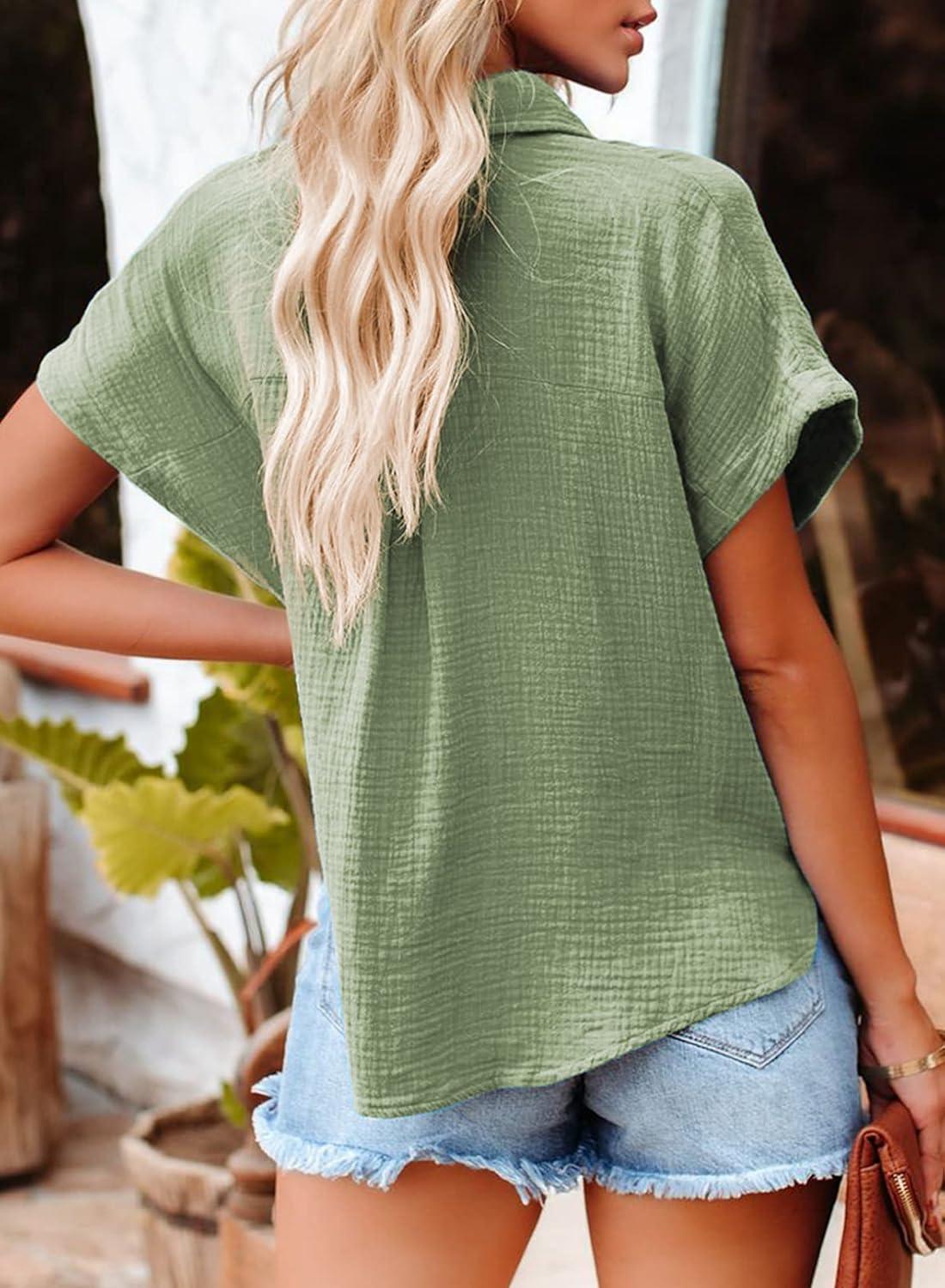 Dokotoo Casual V Neck Button Down Shirts for Women Solid Short Sleeve Blouse Tops(1 Green)