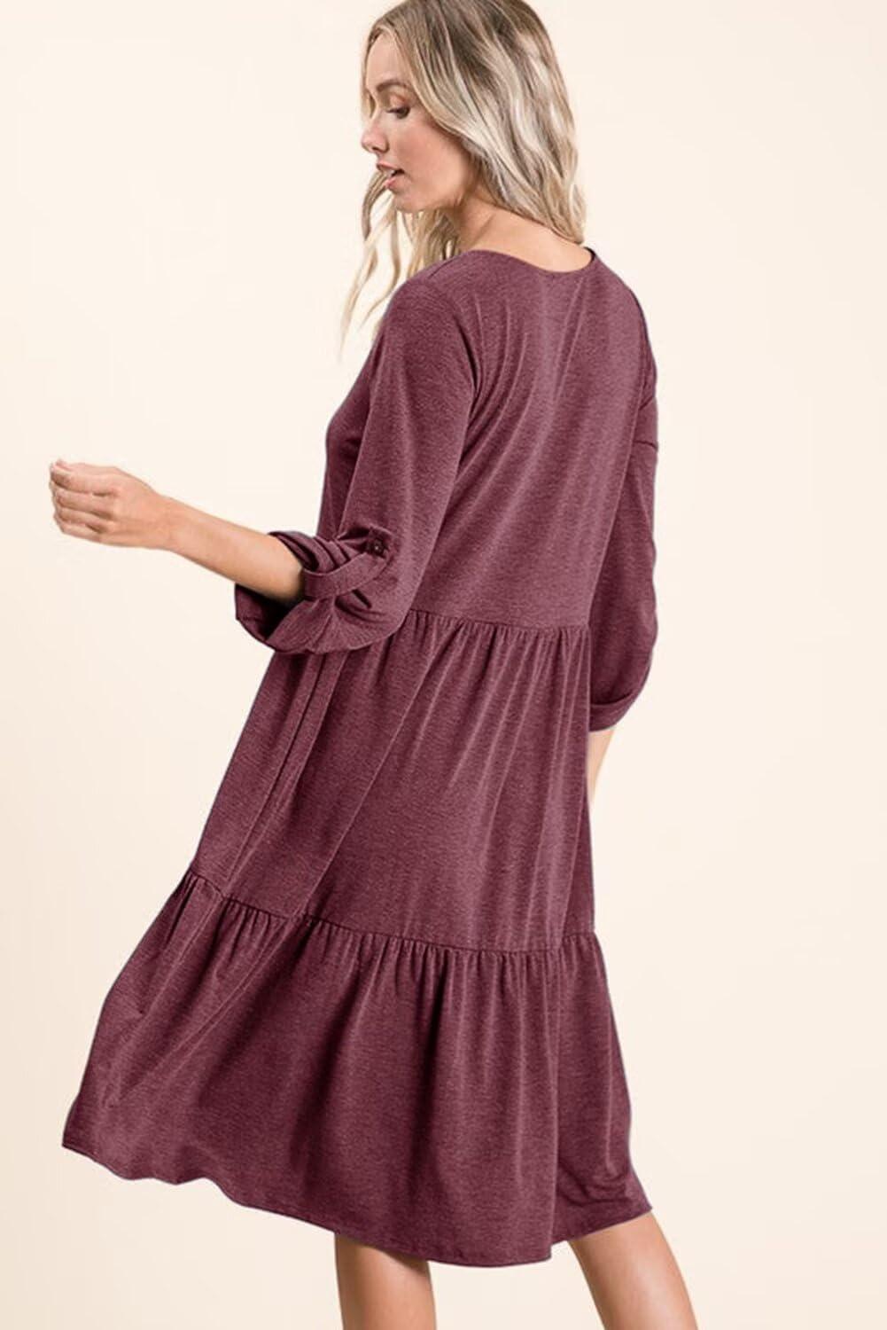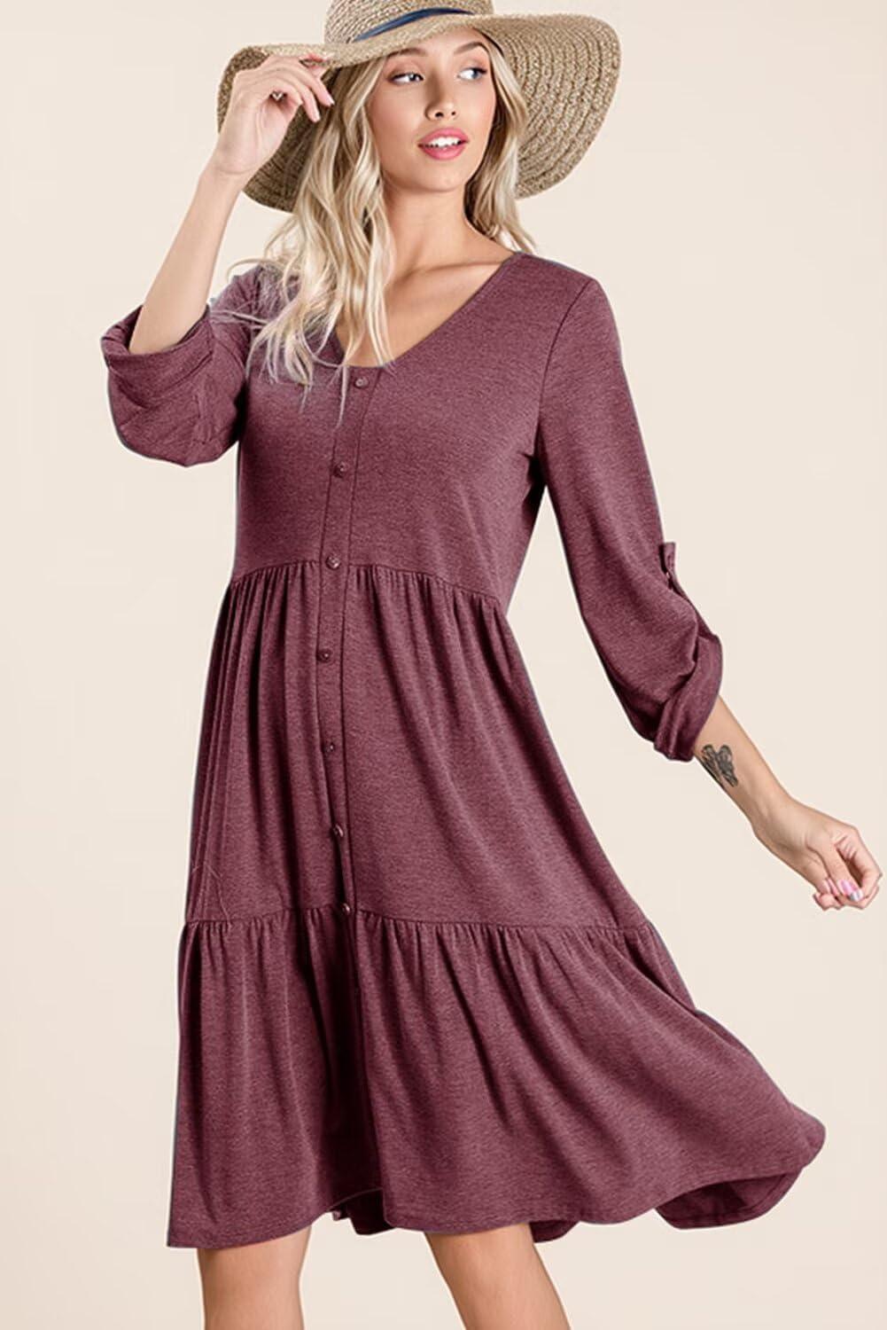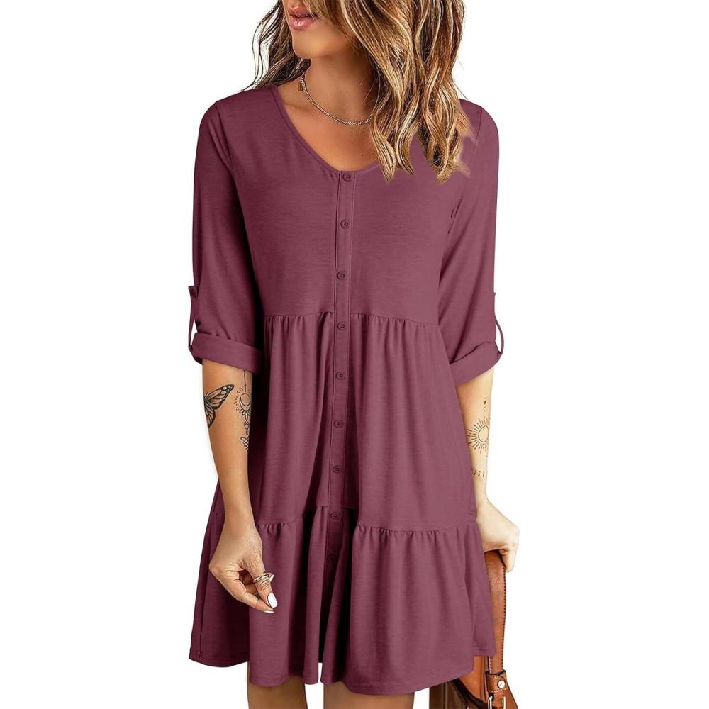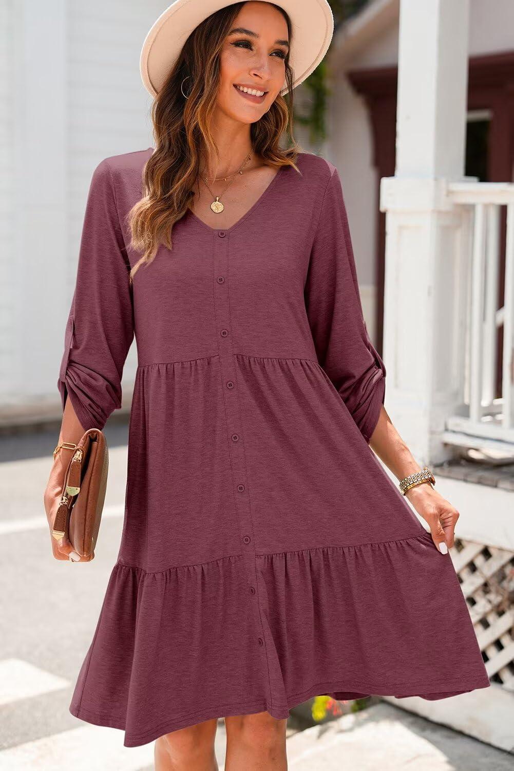 Dokotoo Dresses for Women 2025 Long Sleeve V Neck Knitted Button Down Elastic Waist Ruffle Tiered Mini Dress with Pockets(Burgundy)