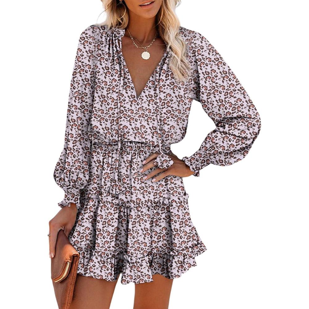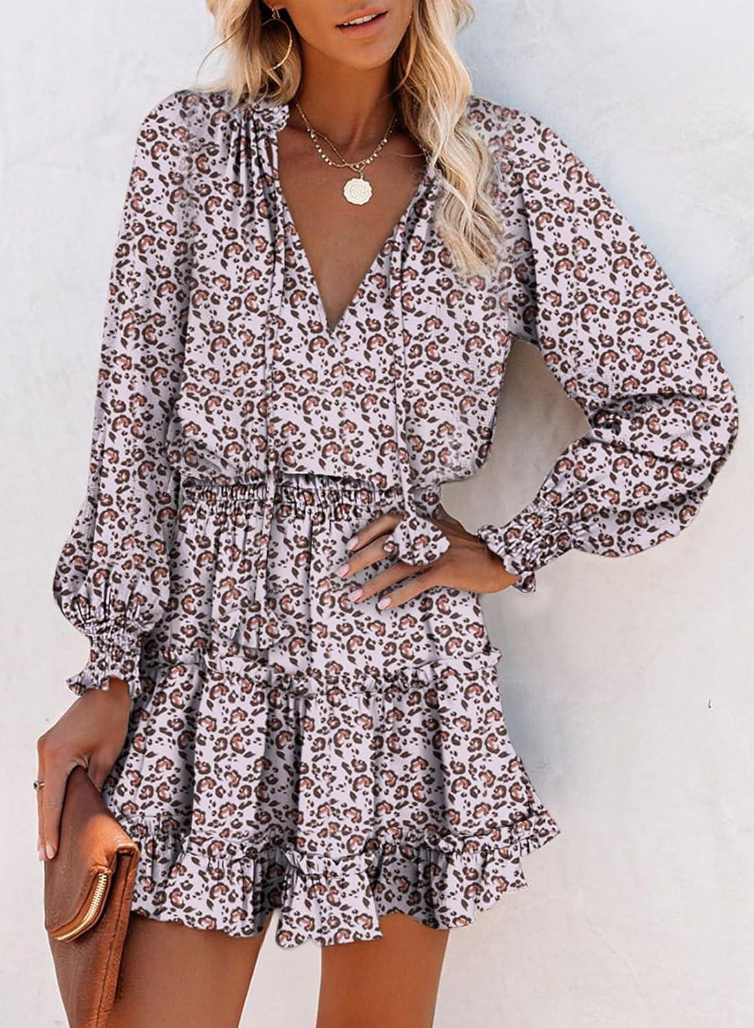 Dokotoo Fall Dresses for Women 2025 Boho Floral Drawstring V Neck Smocked Long Sleeve Ruffle Tiered Chiffon Mini Dress(Z Print Leopard)