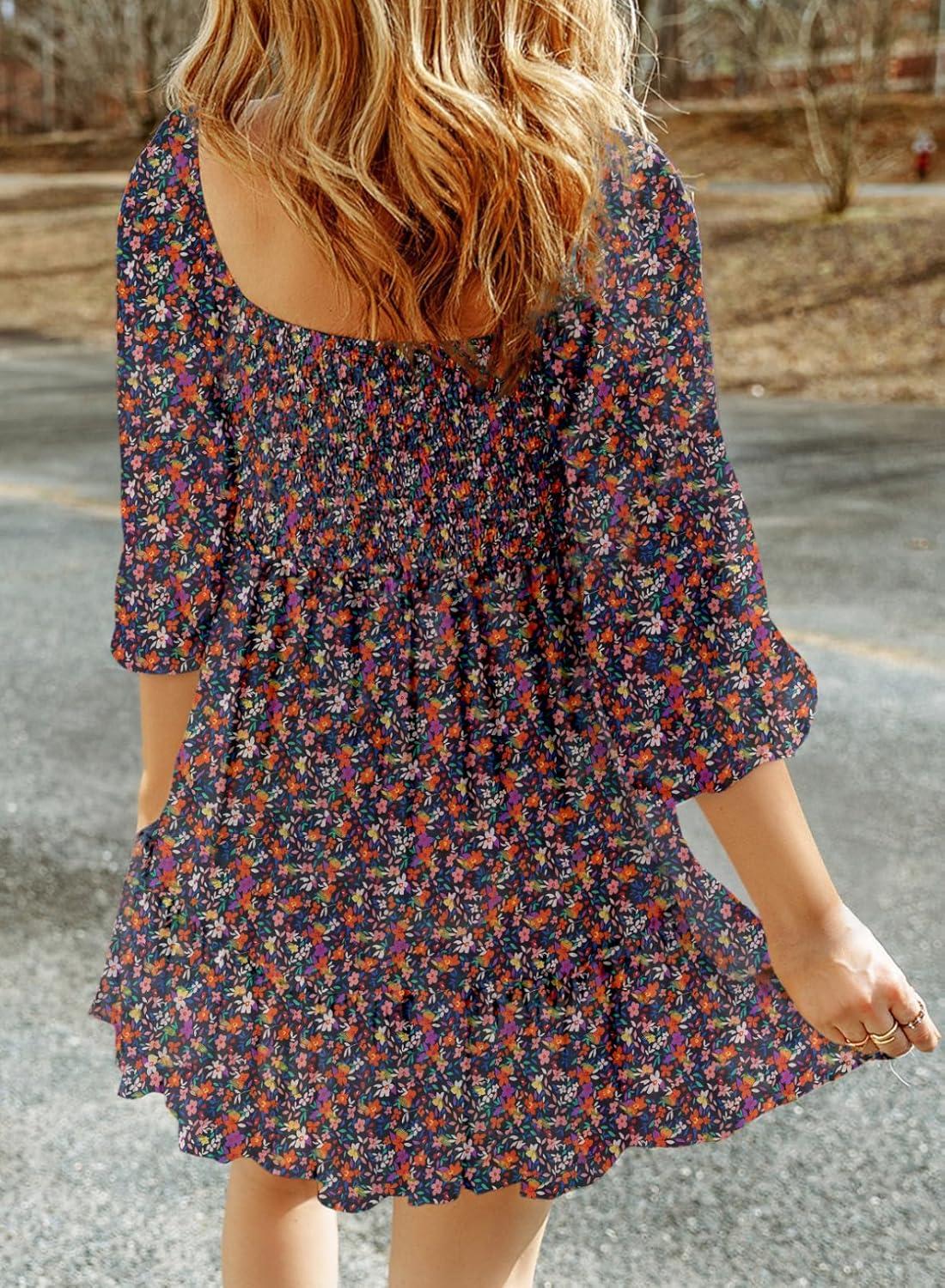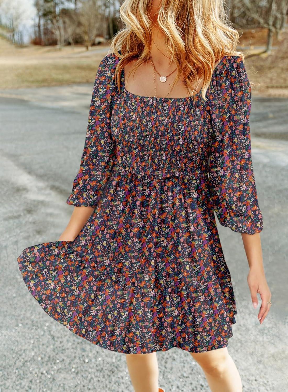 Dokotoo Fall Dresses for Women 2025 Boho Floral Square Neck Smocked 3/4 Sleeve Casual A-Line Swing Mini Dress Sundress(Blue)