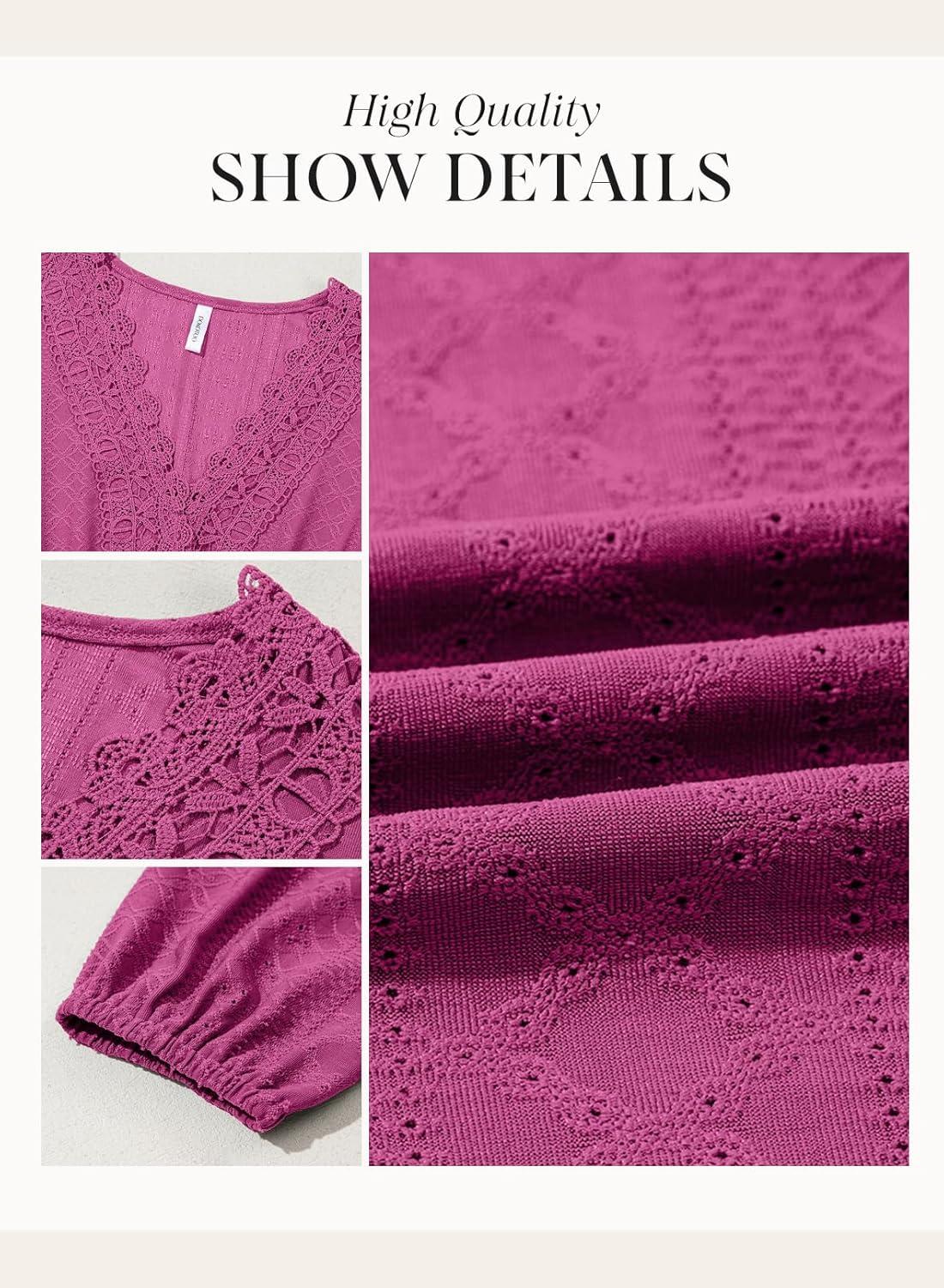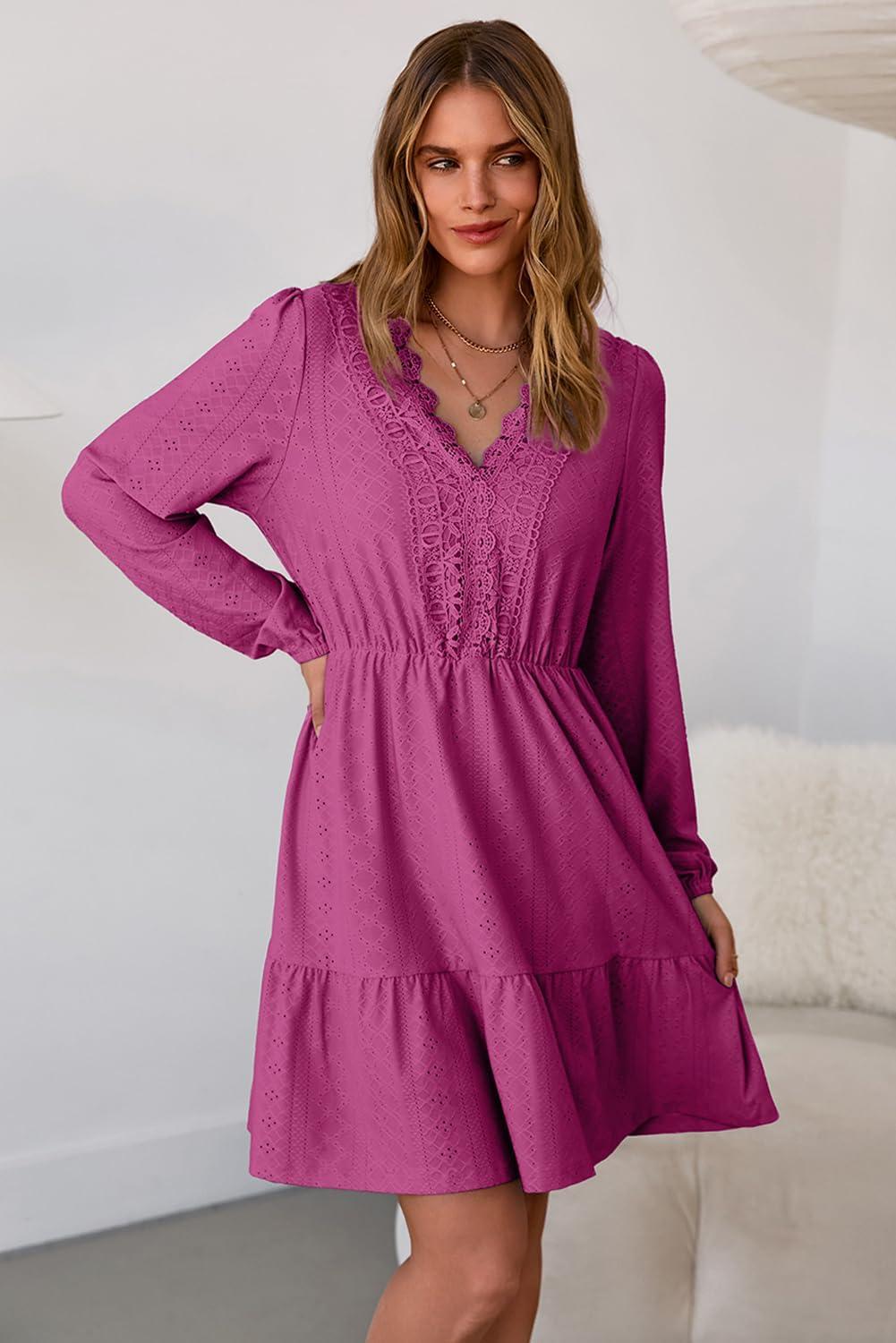 Dokotoo Fall Dresses for Women 2025 Elegant Lace Hollow Out Embroidered V Neck Long Sleeve Casual A-Line Swing Mini Dress(Rosy)