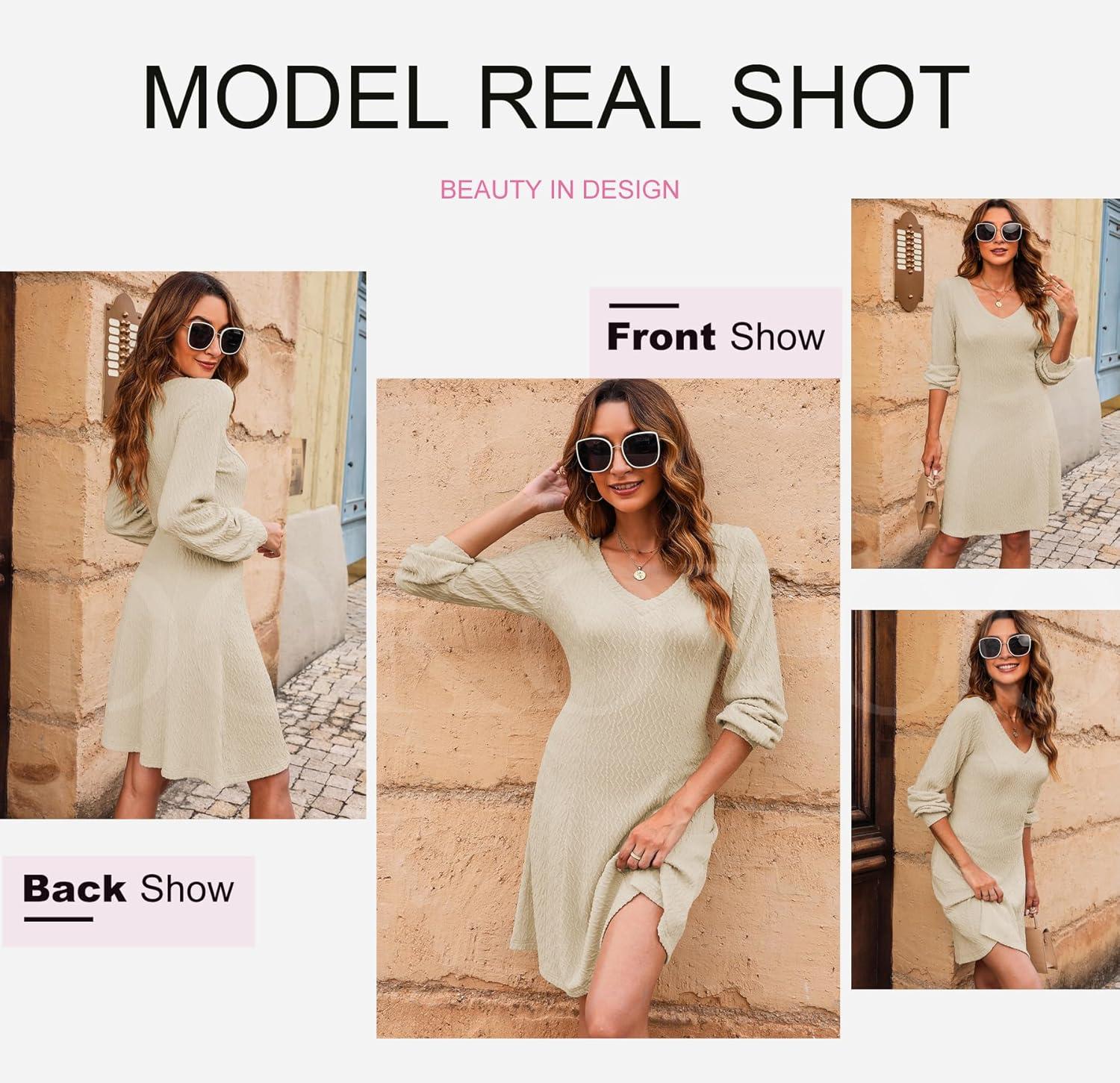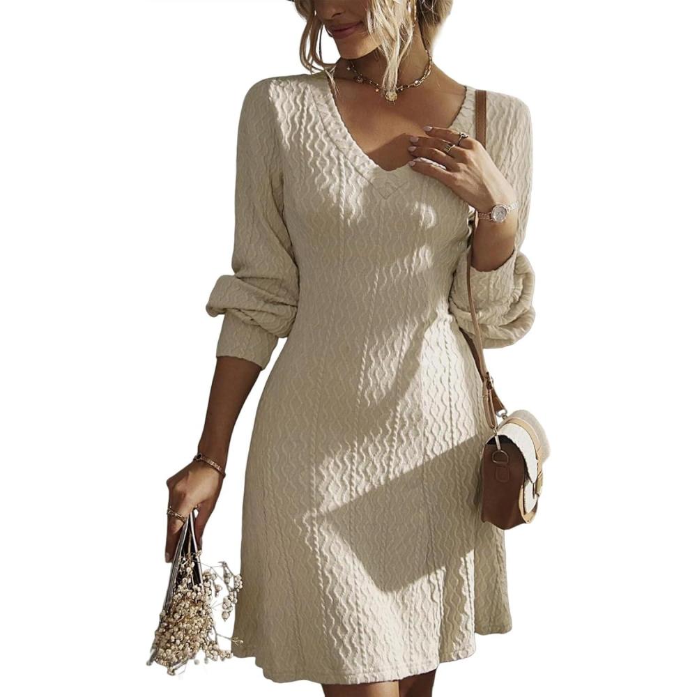 Dokotoo Fall Wedding Guest Dresses for Women 2025 Trendy V Neck Knit A Line Long Sleeve Dress Sweater Dress(A1 Apricot)