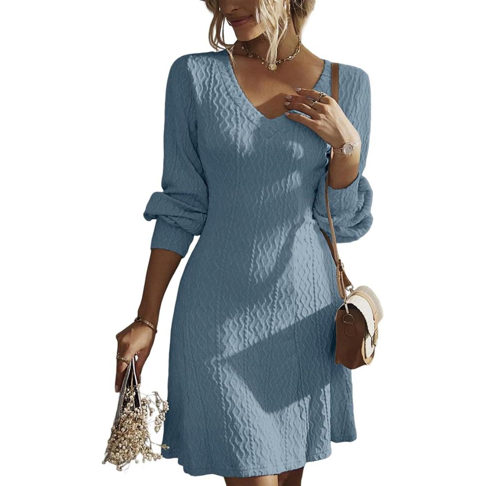 Dokotoo Fall Wedding Guest Dresses for Women 2025 Trendy V Neck Knit A Line Long Sleeve Dress Sweater Dress(Ashleigh Blue)