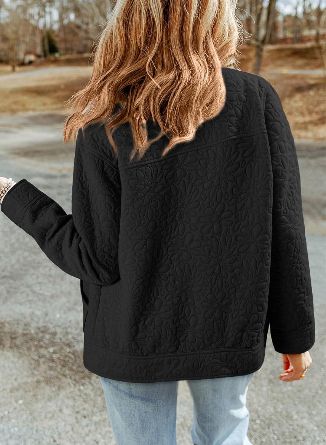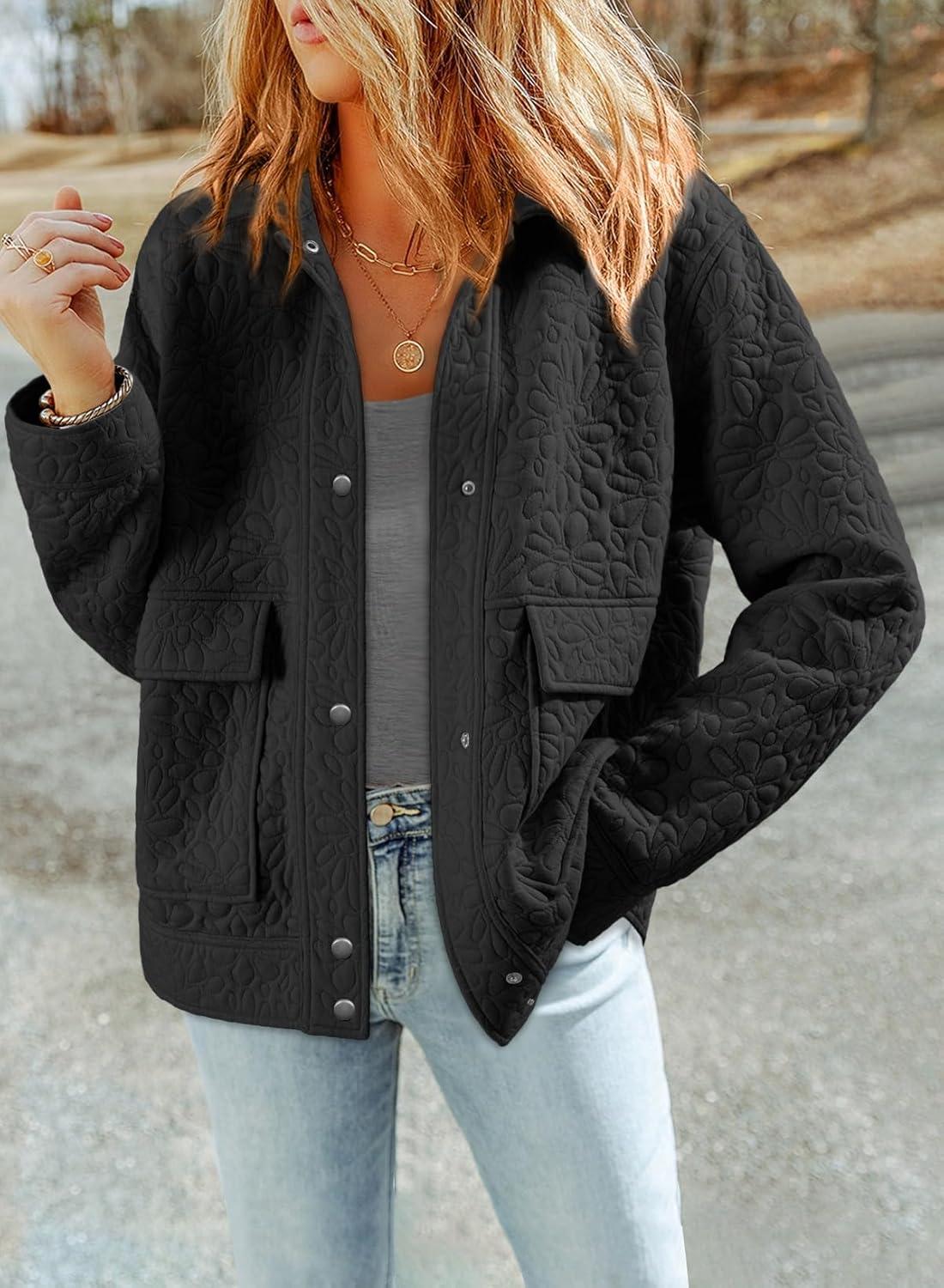 Dokotoo Jackets for Women Casual Long Sleeve Collared Jacquard Coats Trendy Button Down Shacket Jacket with Pockets(Black)