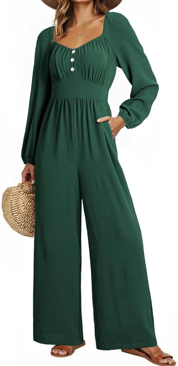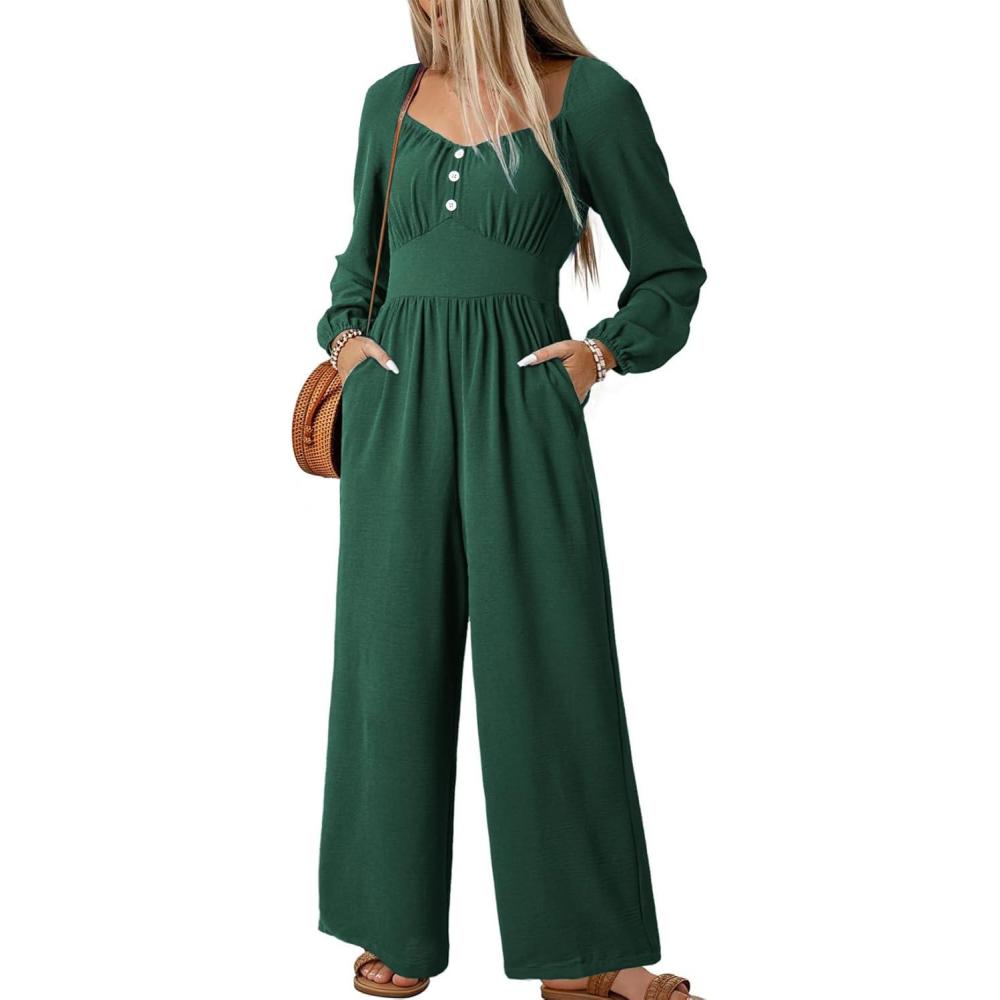 Dokotoo Jumpsuits for Women 2025 Fall Long Sleeves Square Neck Button Decoration Rompers Overalls with Pockets(Jungle Green)