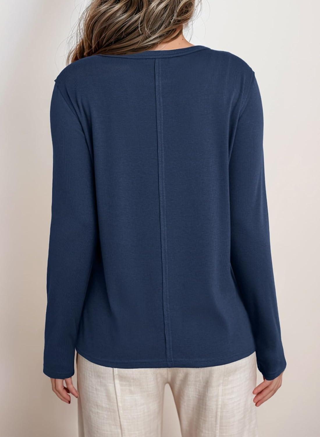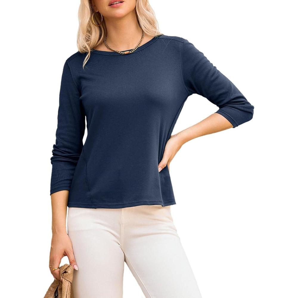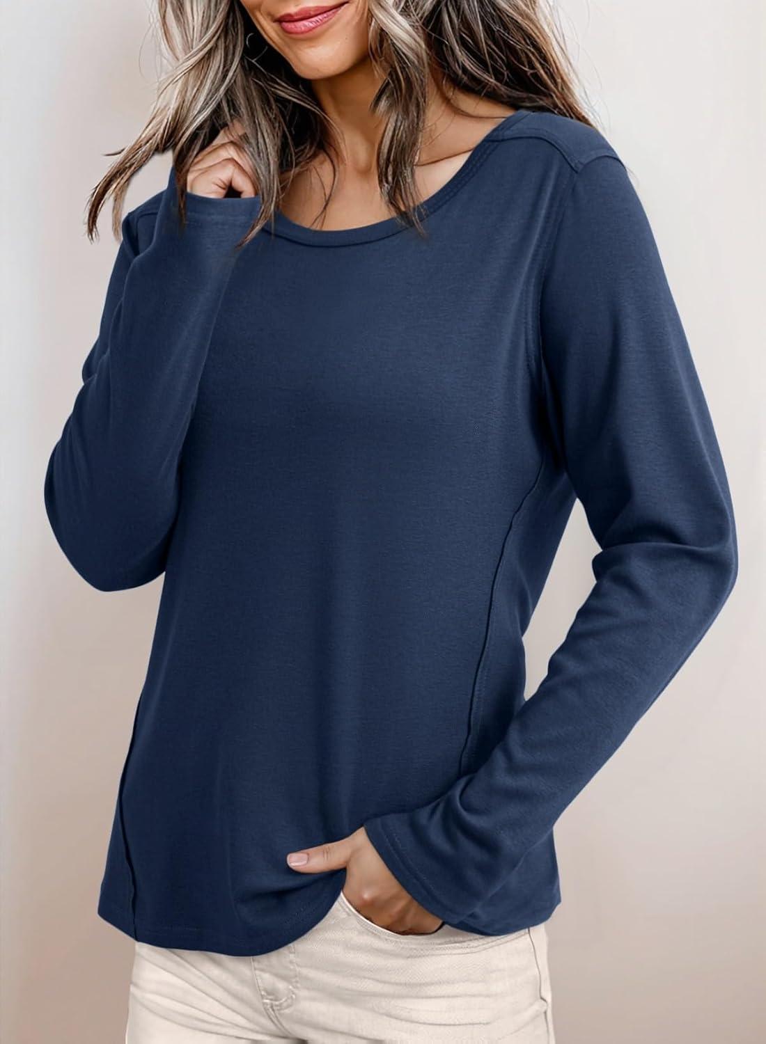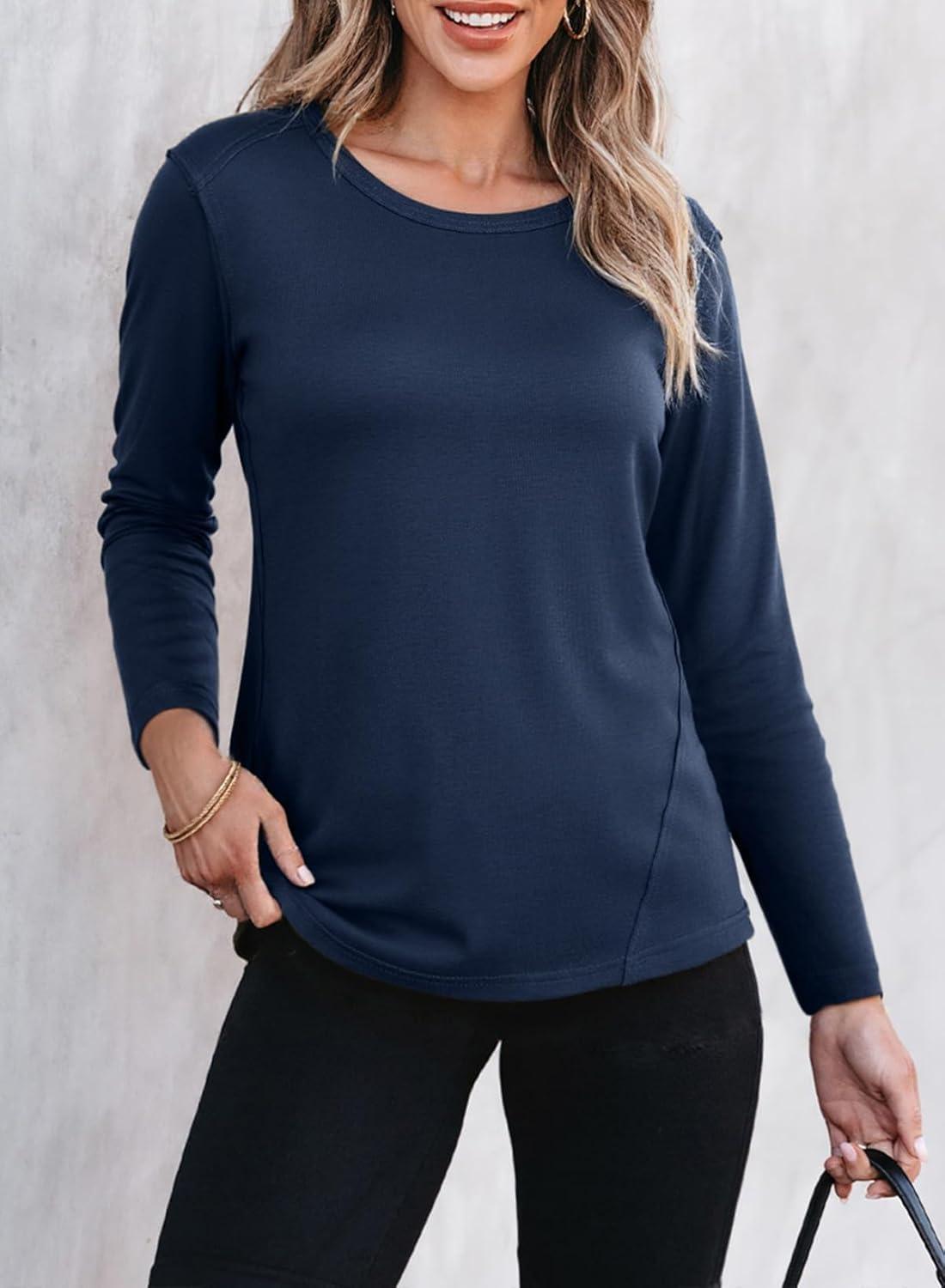 Dokotoo Long Sleeve Shirts Crewneck Womens Tops 2025 Fall Outfits Comfort Basic Tees Fashion Clothing(Dark Blue)