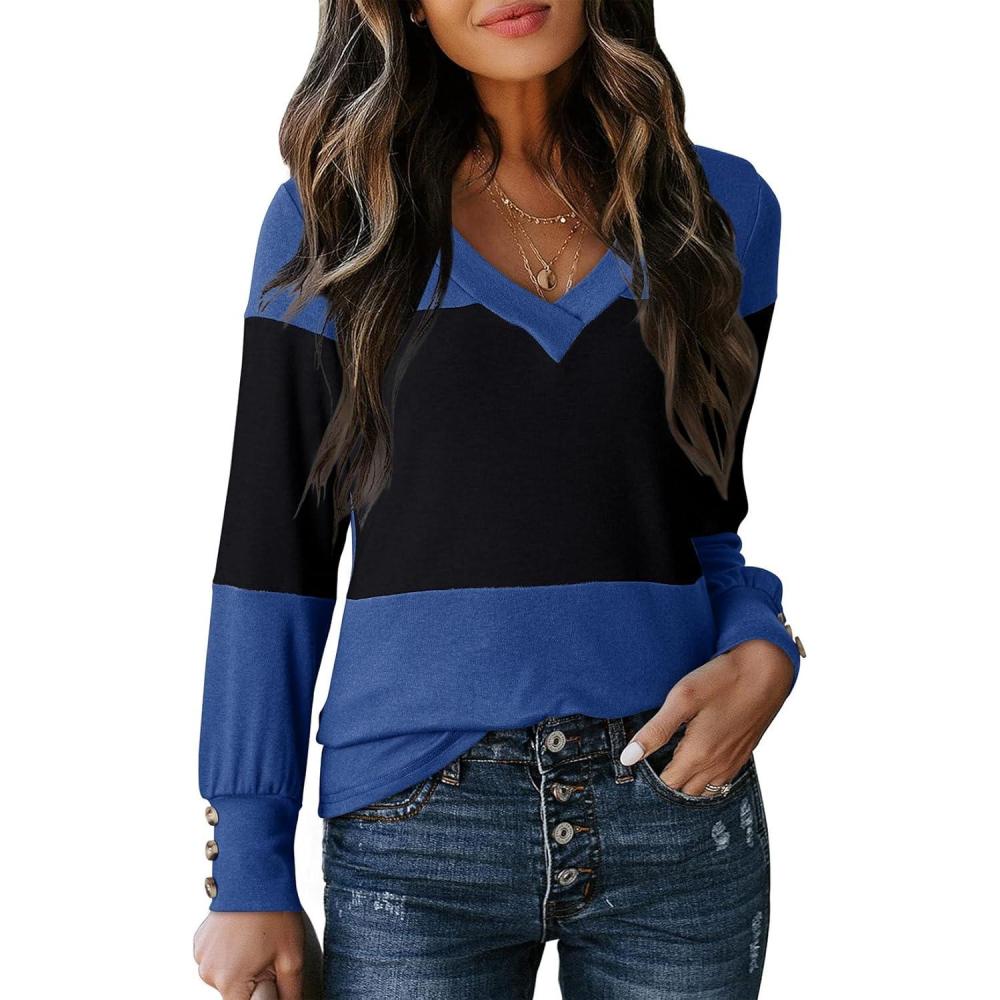Dokotoo Long Sleeve Shirts for Women Fall Outfits V Neck Shirts Button Tunic Tops Fashion Winter Clothing(Black Blue)