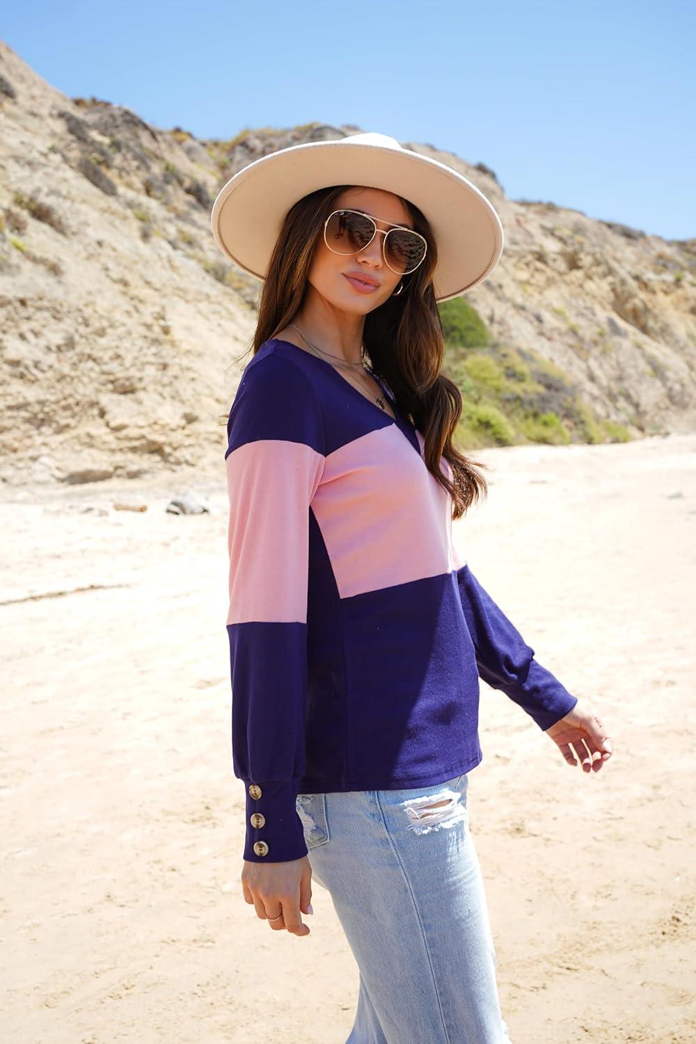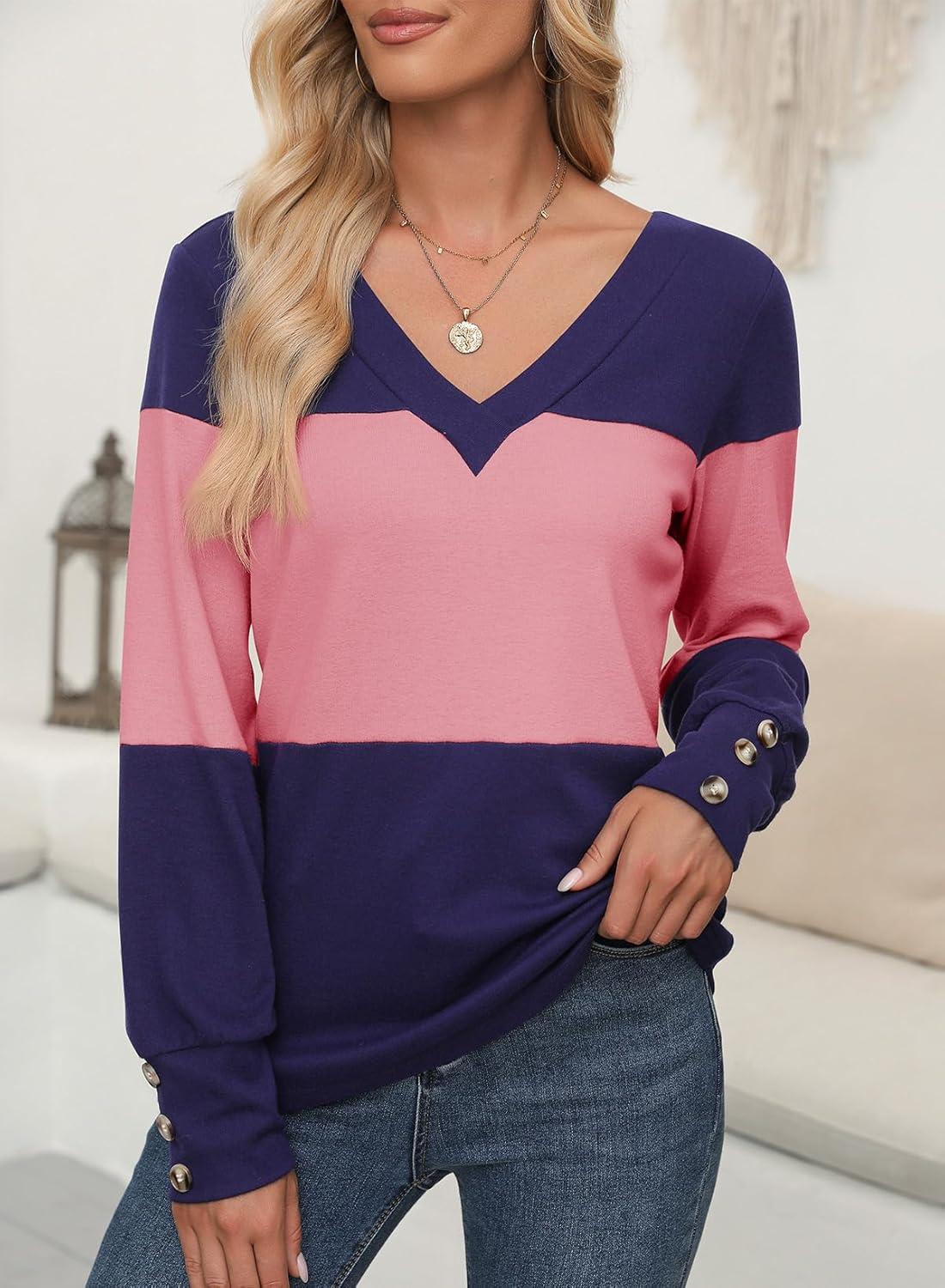Dokotoo Long Sleeve Shirts for Women Fall Outfits V Neck Shirts Button Tunic Tops Fashion Winter Clothing(Blue Stripe)