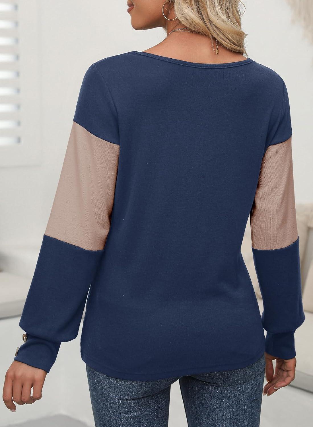 Dokotoo Long Sleeve Shirts for Women Fall Outfits V Neck Shirts Button Tunic Tops Fashion Winter Clothing(Sail Blue)