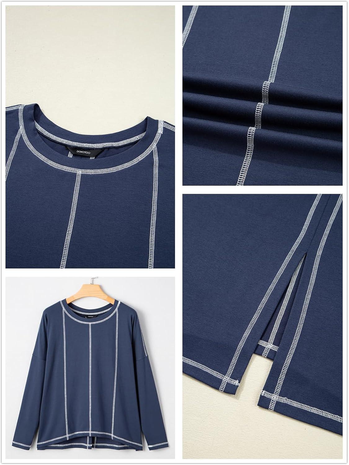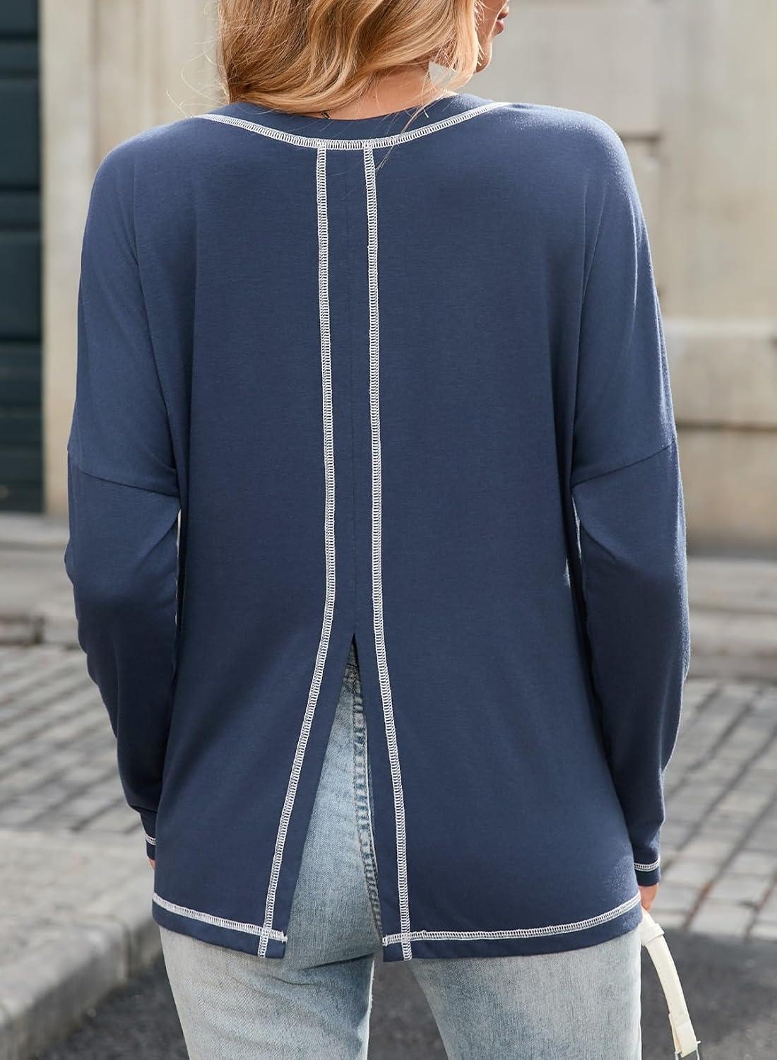 Dokotoo Long Sleeve Shirts Split Back Womens Tops Fall Outfits 2025 Fashion Casual Womens Clothing(Blue)