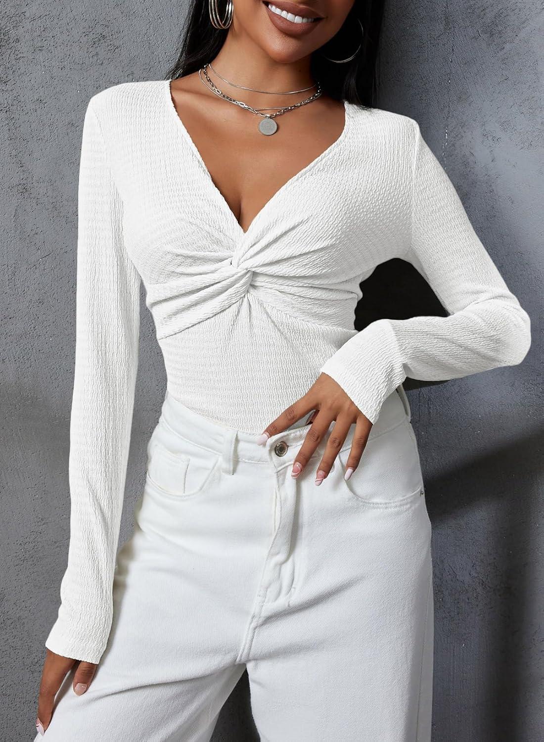 Dokotoo Long Sleeve Tops for Women Spring Fall 2025 Womens V Neck Sexy T Shirts for Women Fitted Shirts Tight Basic Tee(Bright White)