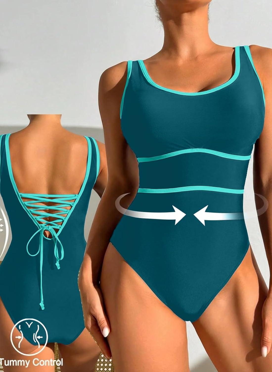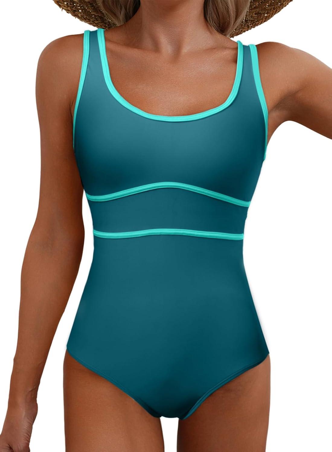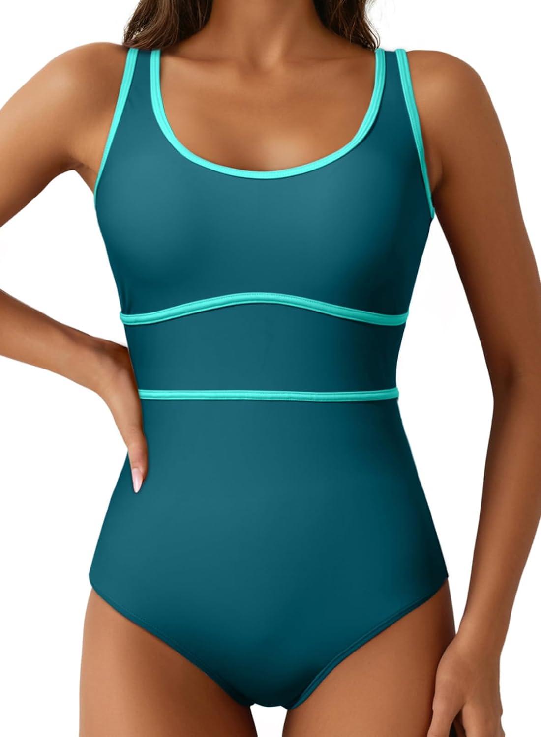Dokotoo One Piece Swimsuit Women Tummy Control Athletic Full Coverage Bathing Swim Suit Color Block Slimming Swimwear(Lake Blue)