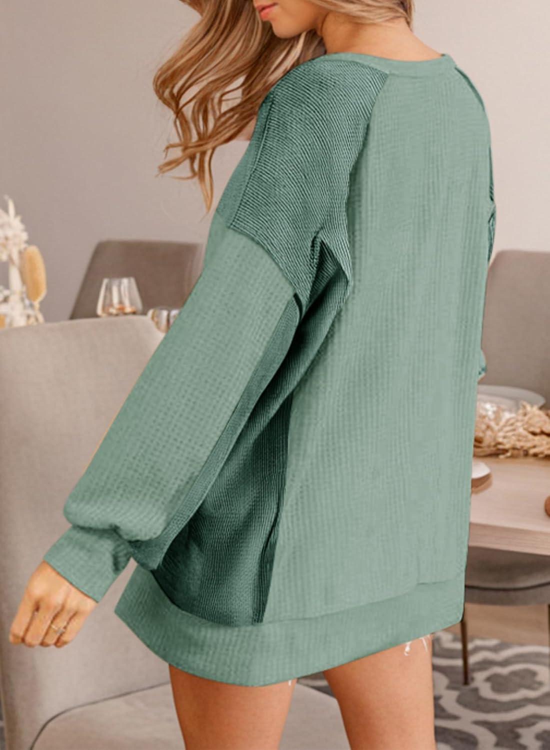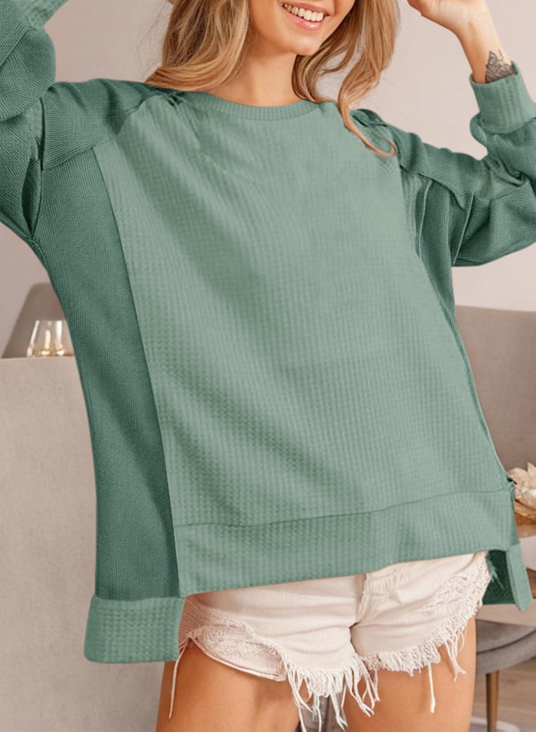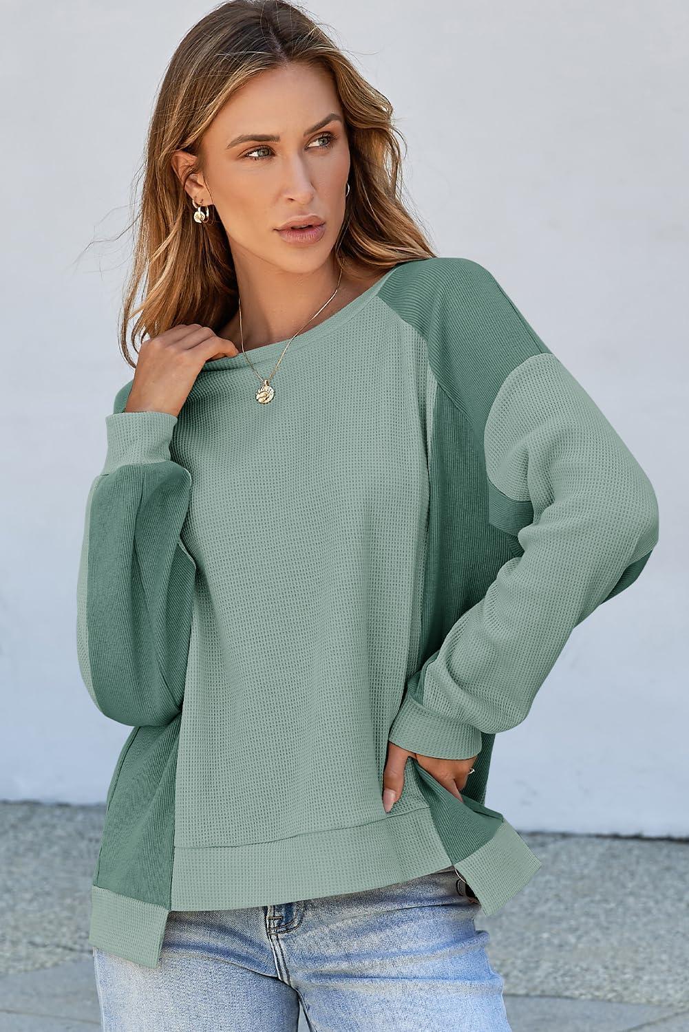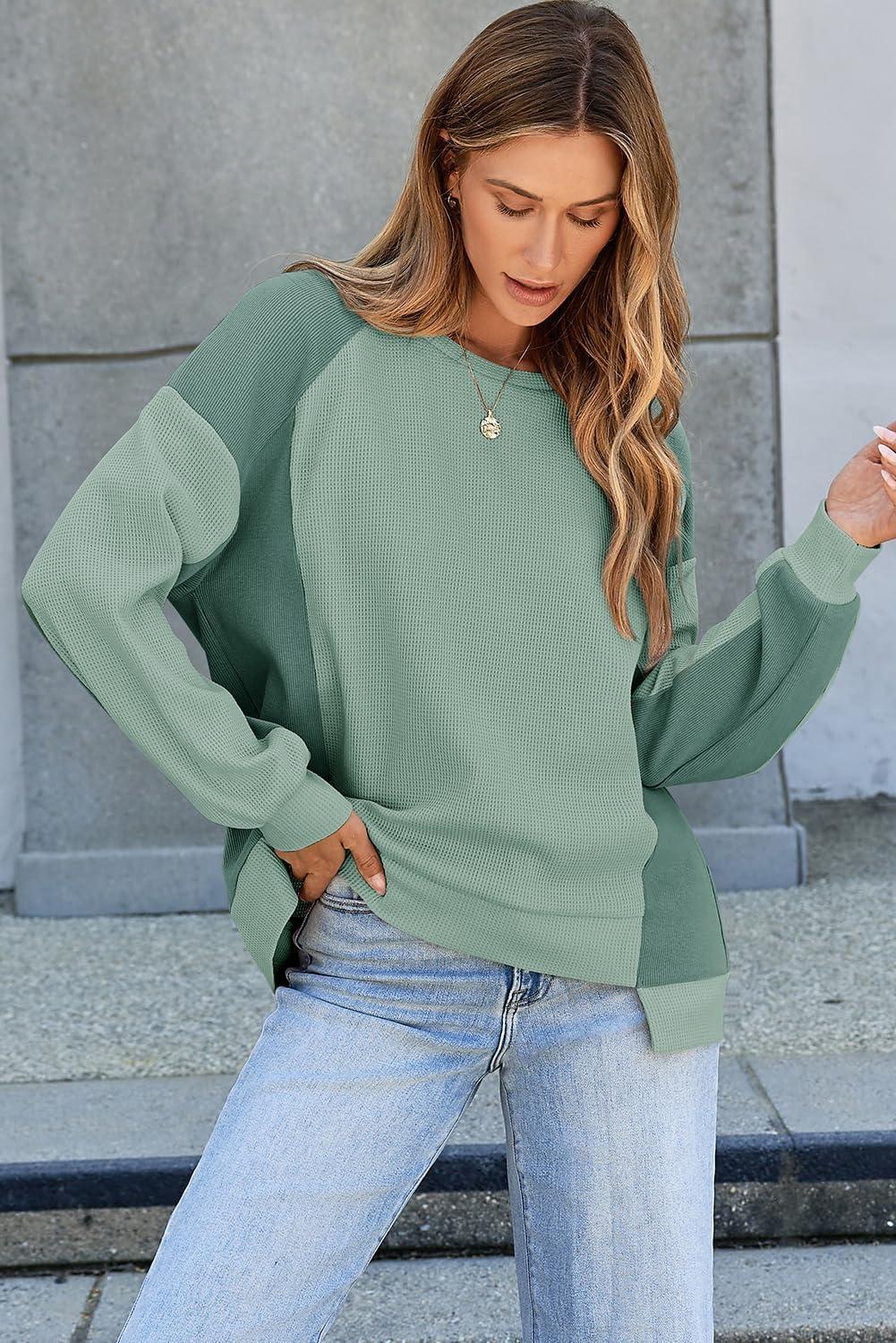Dokotoo Oversized Sweatshirt for Women Waffle Knit Color Block Crewneck Long Sleeve Casual High Low Pullover Sweatshirts Tops(Green)