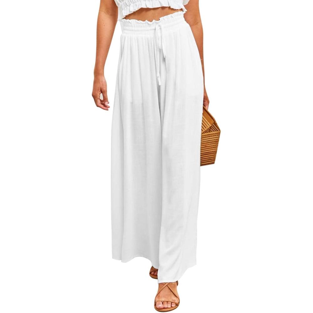 Dokotoo Pants for Women Casual Elastic Waist Wide Leg Pants with Pockets(1 White)