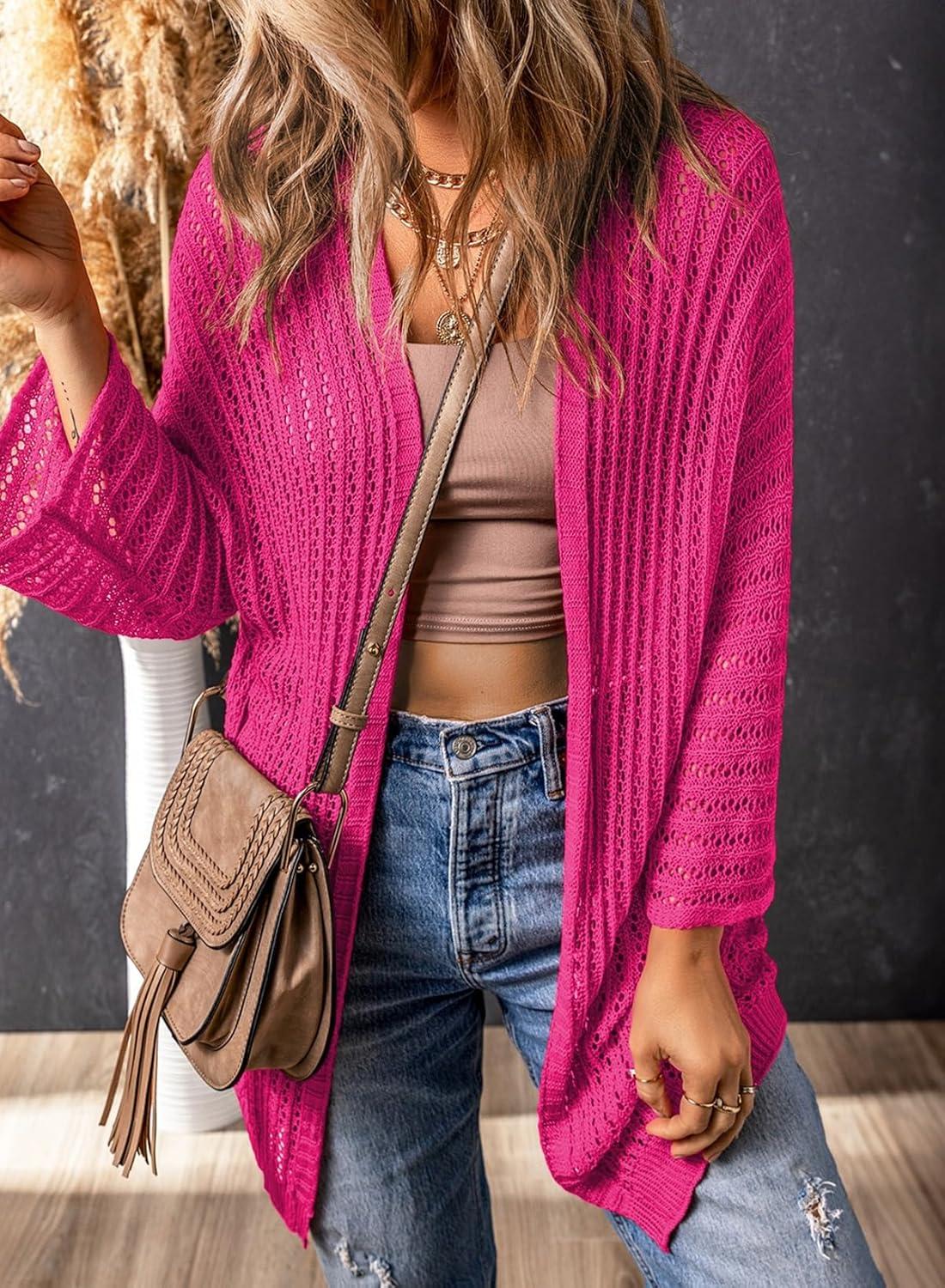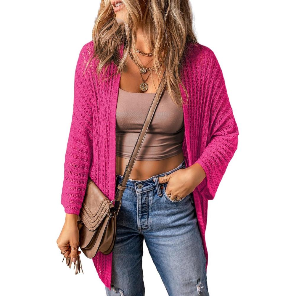Dokotoo Summer Lightweight Cardigan 2024 Spring Fashion 3/4 Length Sleeve Hollow-Out Knit Beach Cover Ups Cardigans(Rose Red)