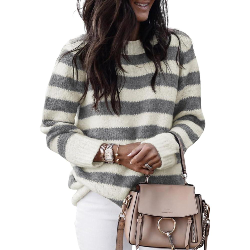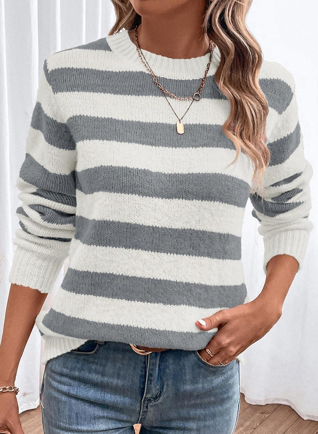 Dokotoo Sweaters for Women 2025 Crewneck Striped Cute Color Block Fall Winter Knitted Pullover Tops(Dark Grey)