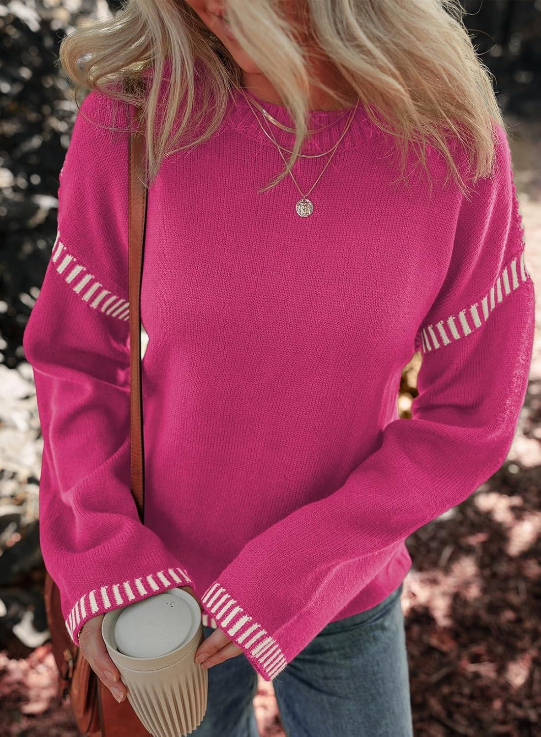 Dokotoo Sweaters for Women Fashion Solid Crewneck Loose Fit Long Sleeve Contrast Cable Knit Pullover Sweater Jumper Tops(Rose Red)