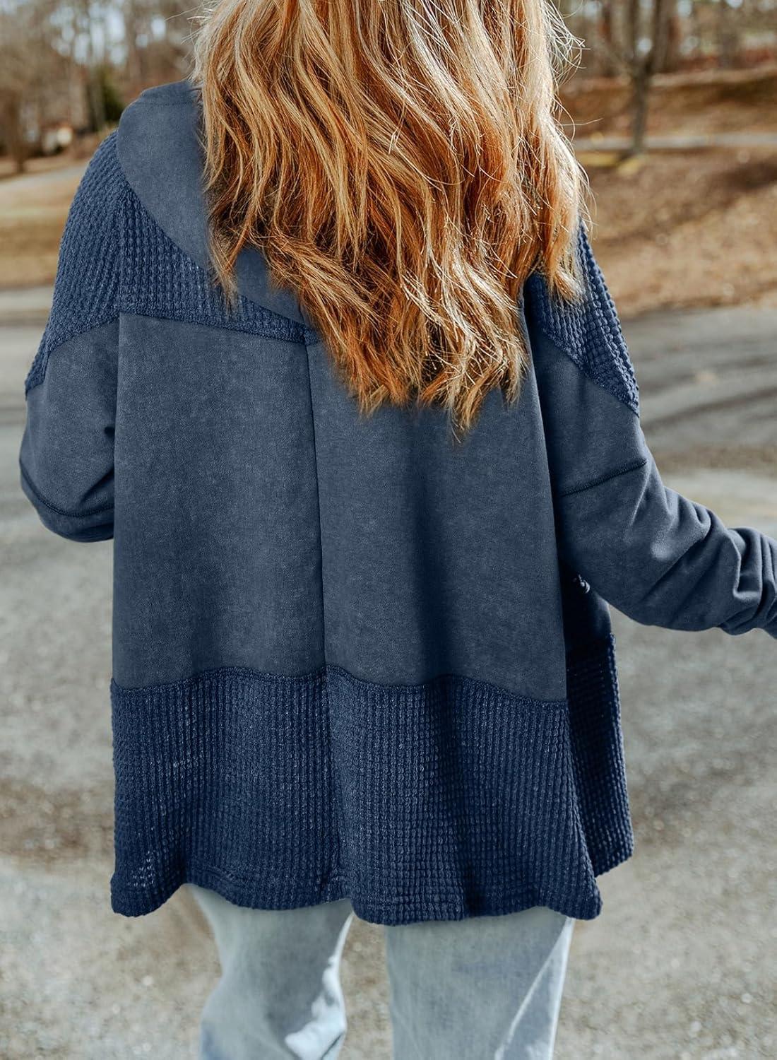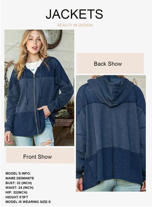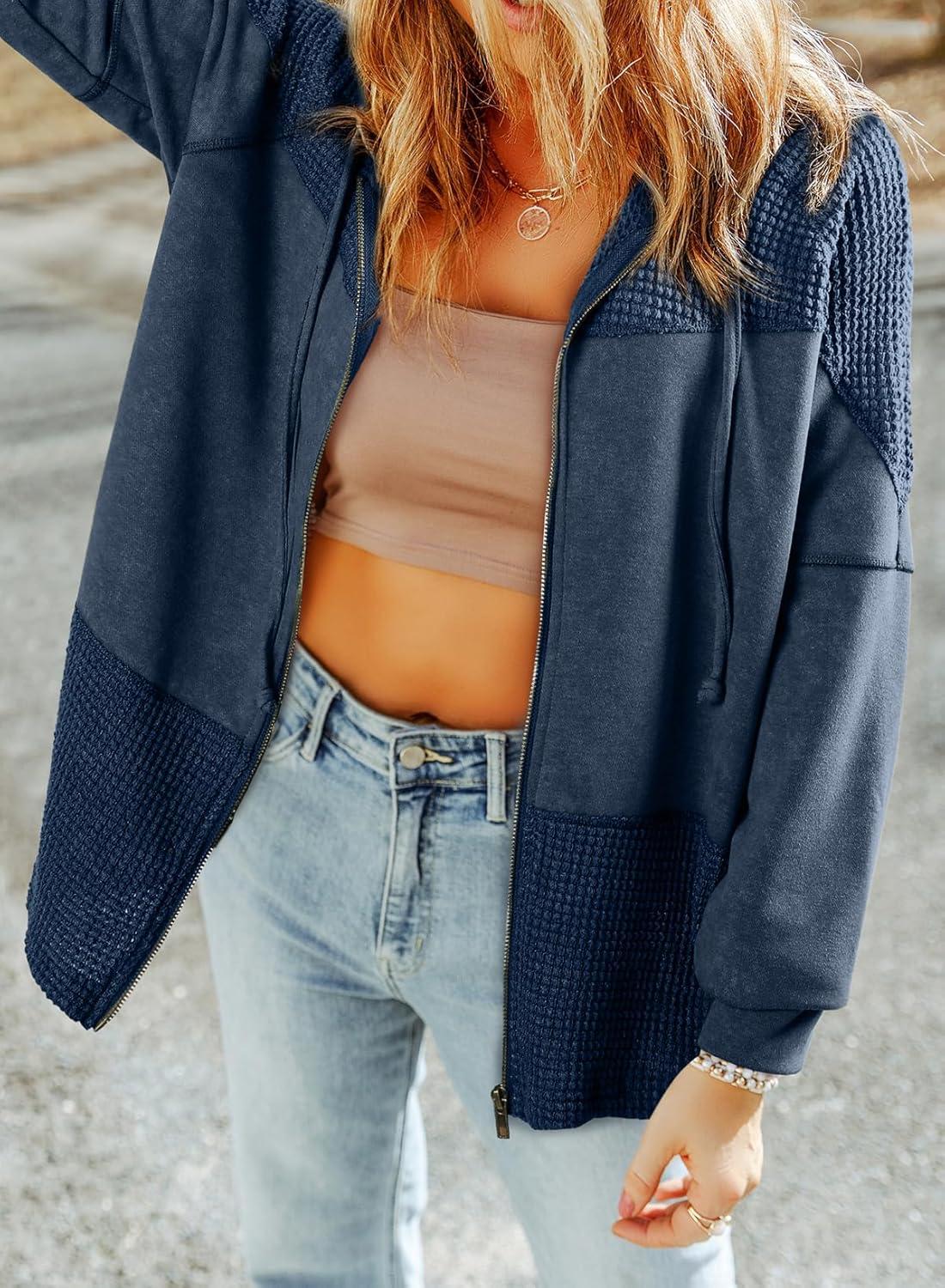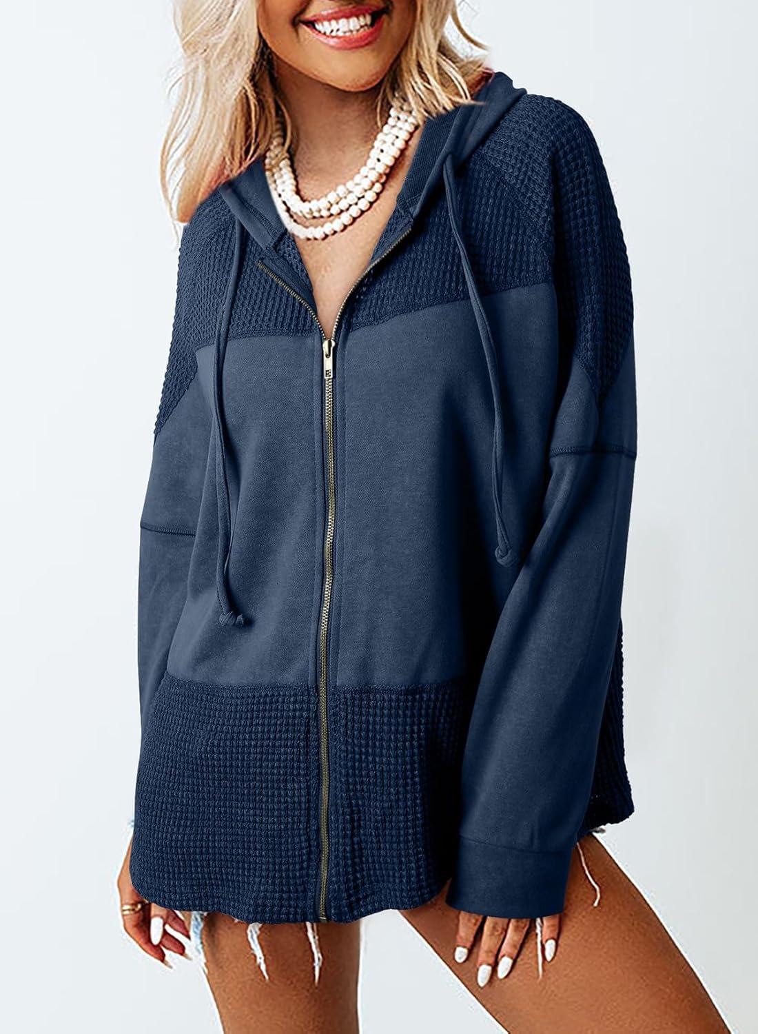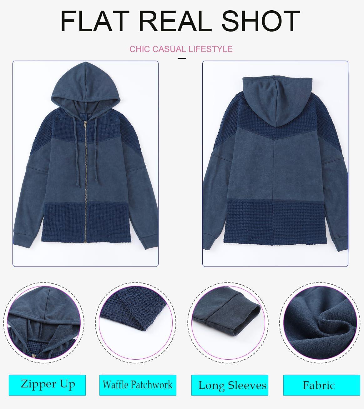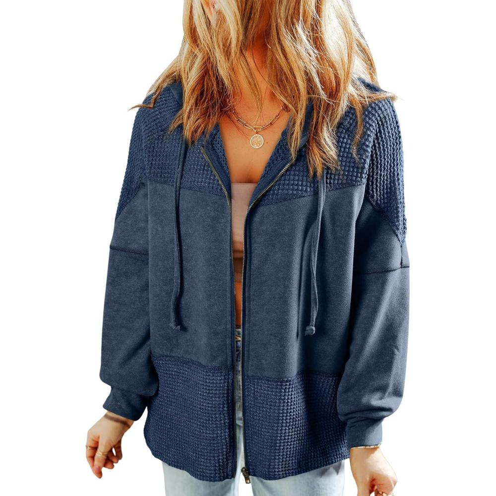 Dokotoo Waffle Knit Hoodies for Womens Zip Up Jackets 2025 Drawstring Fall Casual Jackets(No Pockets-blue)