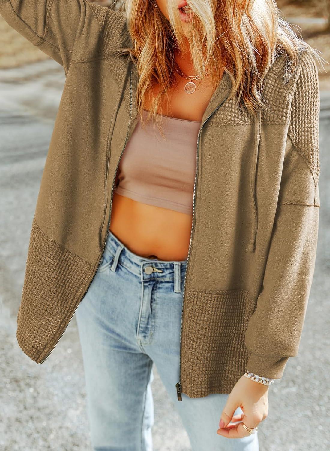 Dokotoo Waffle Knit Hoodies for Womens Zip Up Jackets 2025 Drawstring Fall Casual Jackets(No Pockets-khaki)