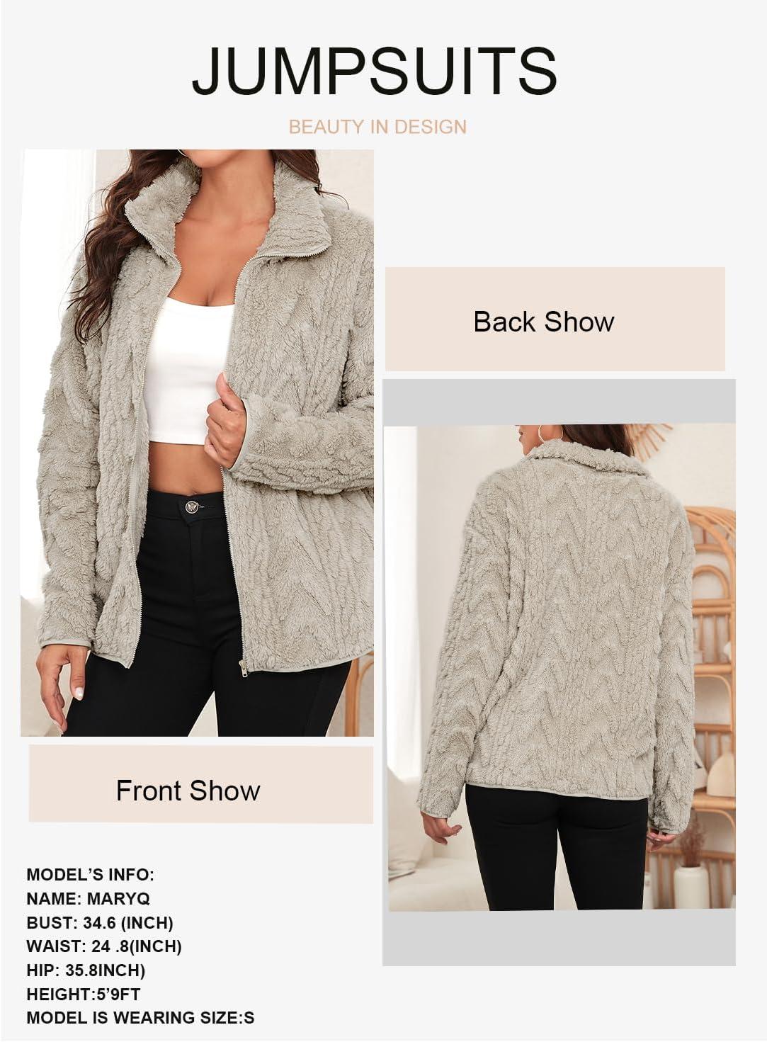 Dokotoo Winter Fleece Jacket for Women 2025 Zipper Stand Collar Casual Coats with Pockets(Light French Beige)