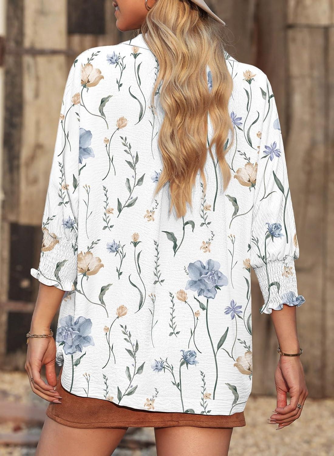 Dokotoo Women Blouses Dressy Casual V Neck 3/4 Length Sleeve Womens Tops Business Work Blouses Office Shirts(Printed White)