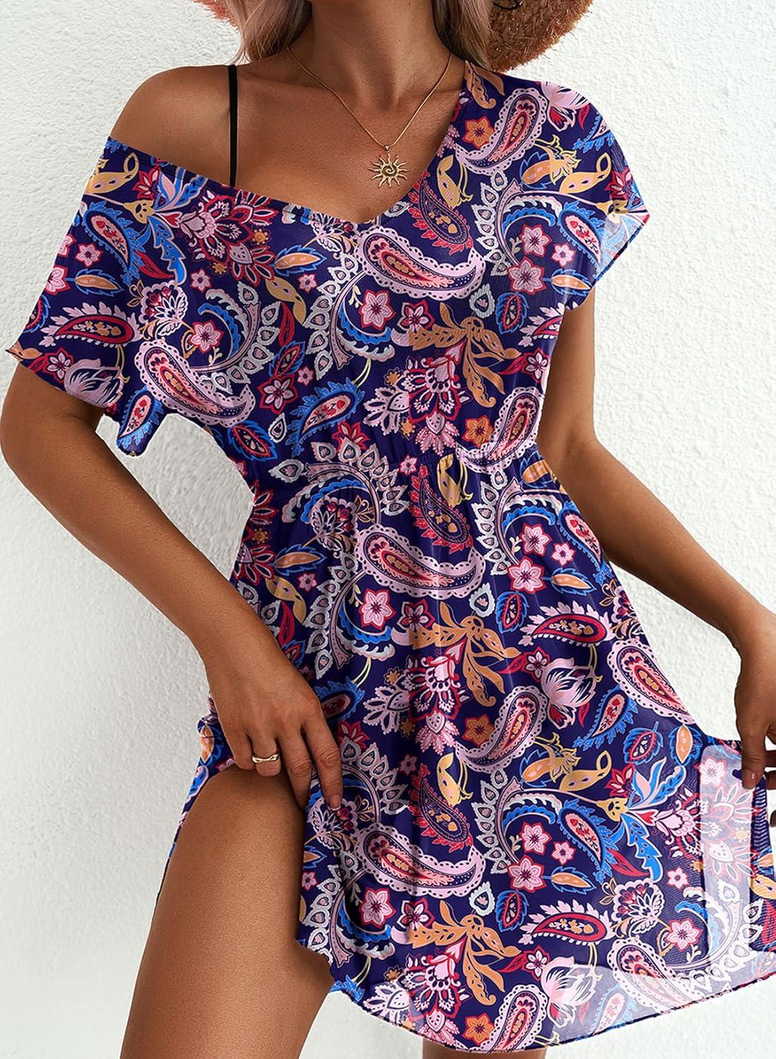 Dokotoo Women Swimsuit Swim Cover Up 2025 Summer Bathing Suit Swimwear Mesh Beach Dress Vacation Outfits(A Floral-purple)