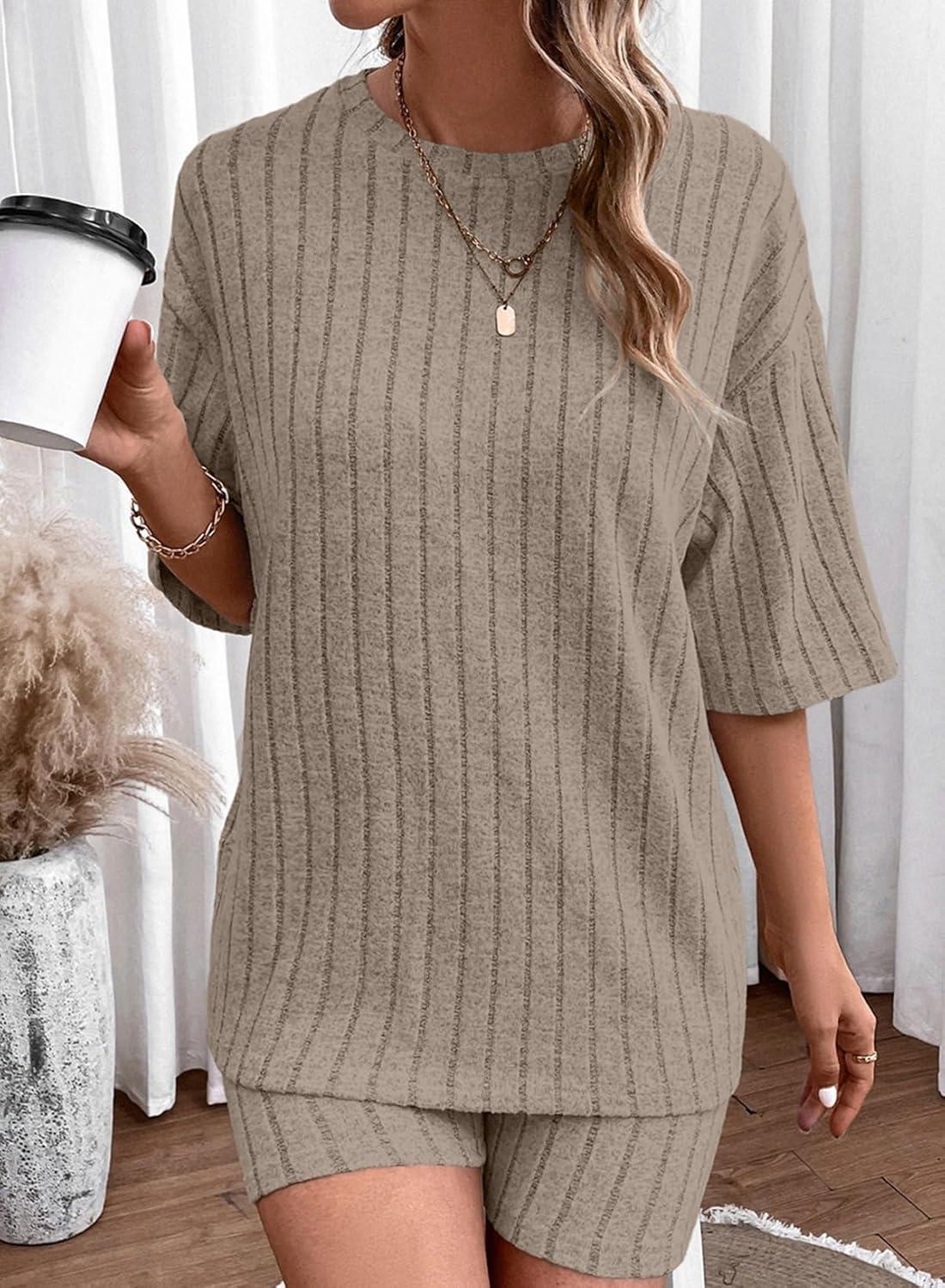 Dokotoo Women’s 2 Piece Outfits Sets Crew Neck Casual Short Sleeve Tops Shorts Pants Lounge Sets(Parchment)