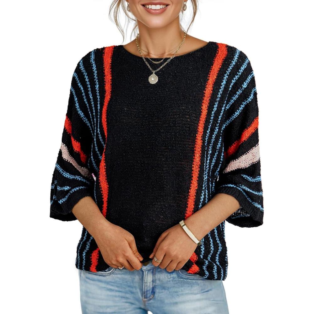 Dokotoo Womens 2025 Fall Casual Crewneck 3/4 Sleeve Striped Lightweight Knit Trendy Boho Tops Pullover Sweaters(B Black 2)