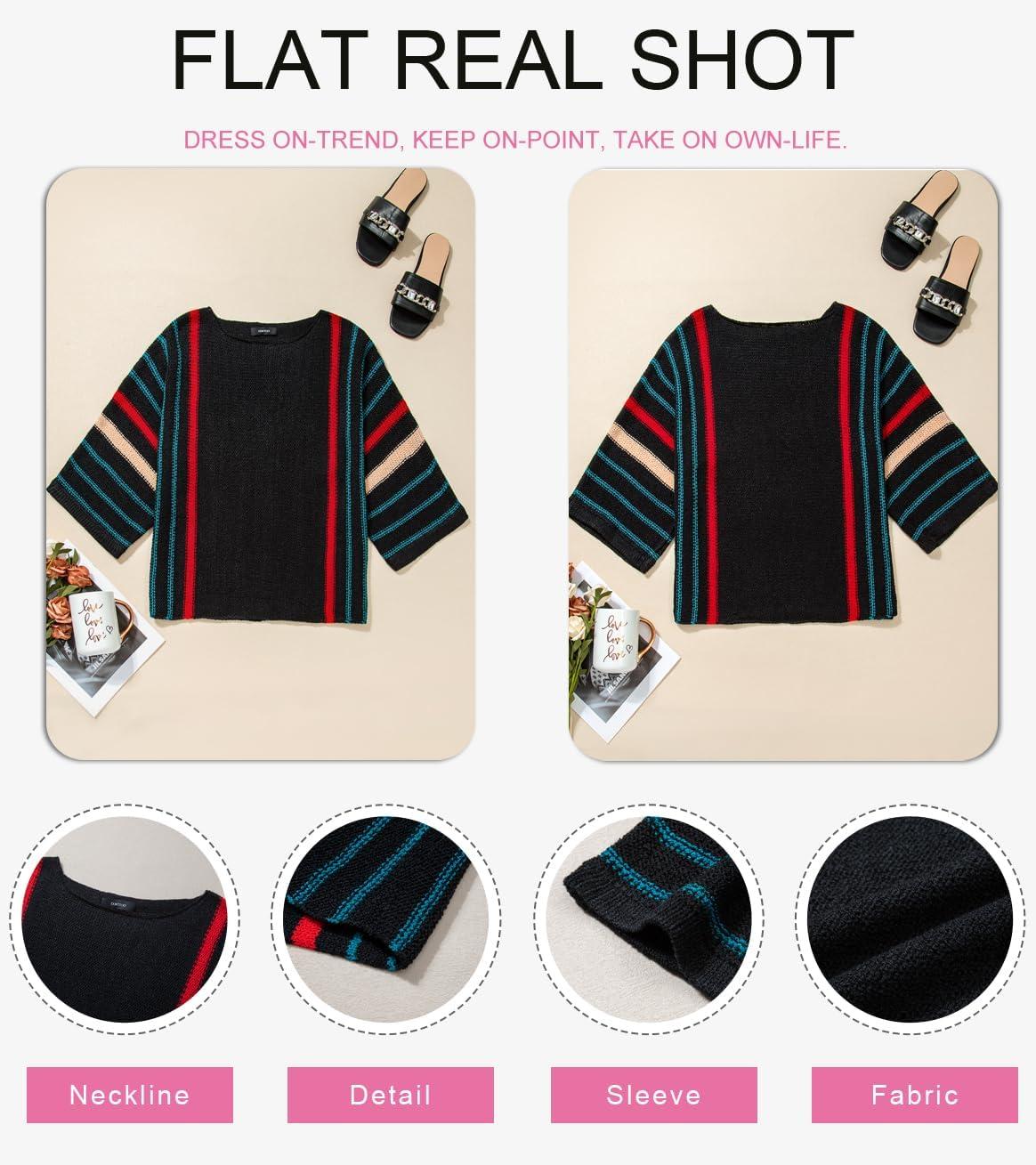 Dokotoo Womens 2025 Fall Casual Crewneck 3/4 Sleeve Striped Lightweight Knit Trendy Boho Tops Pullover Sweaters(H Black)