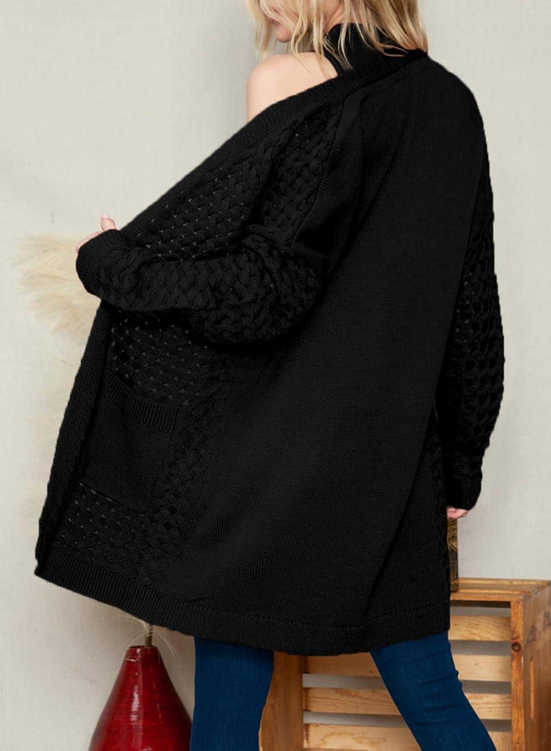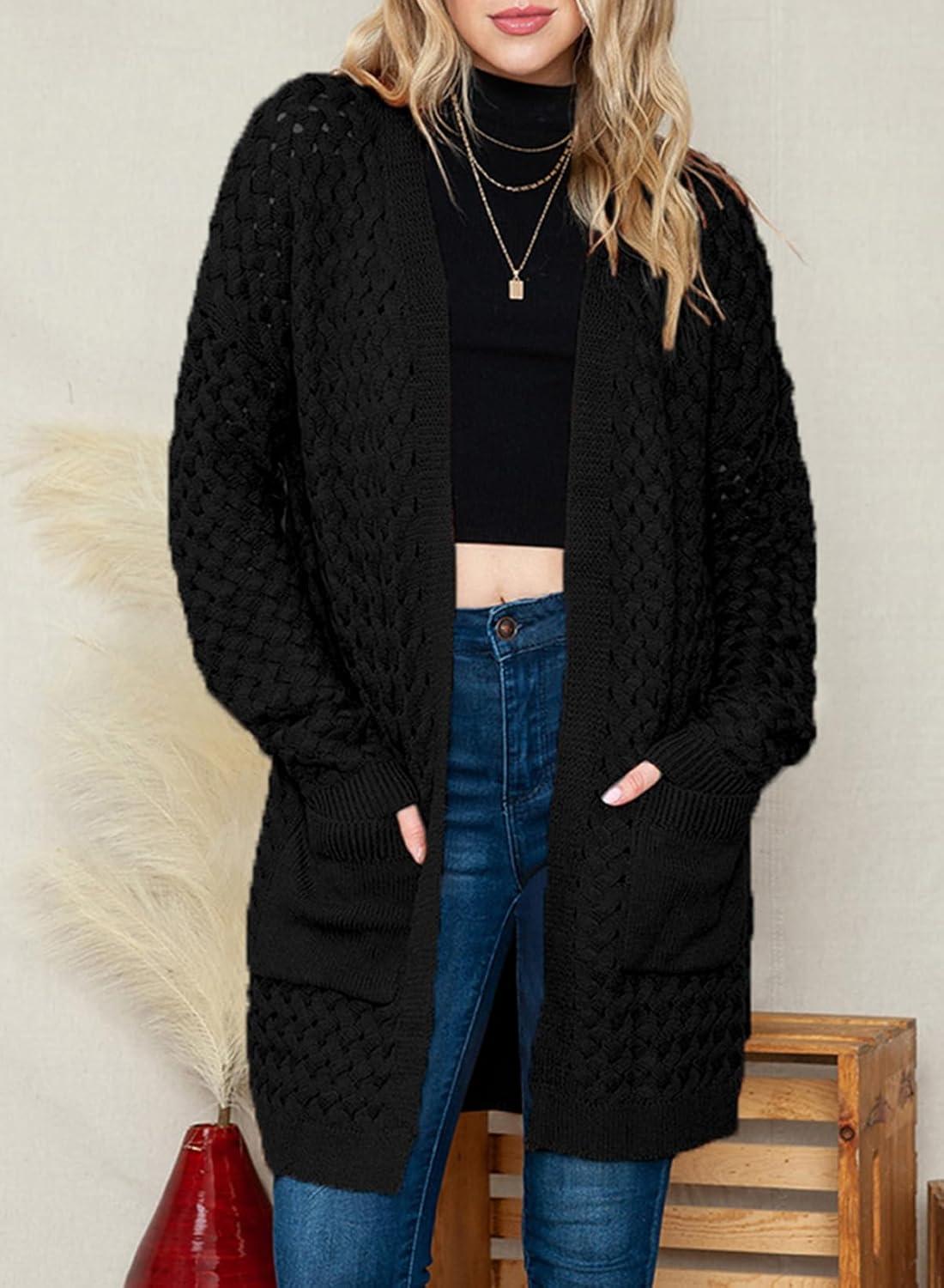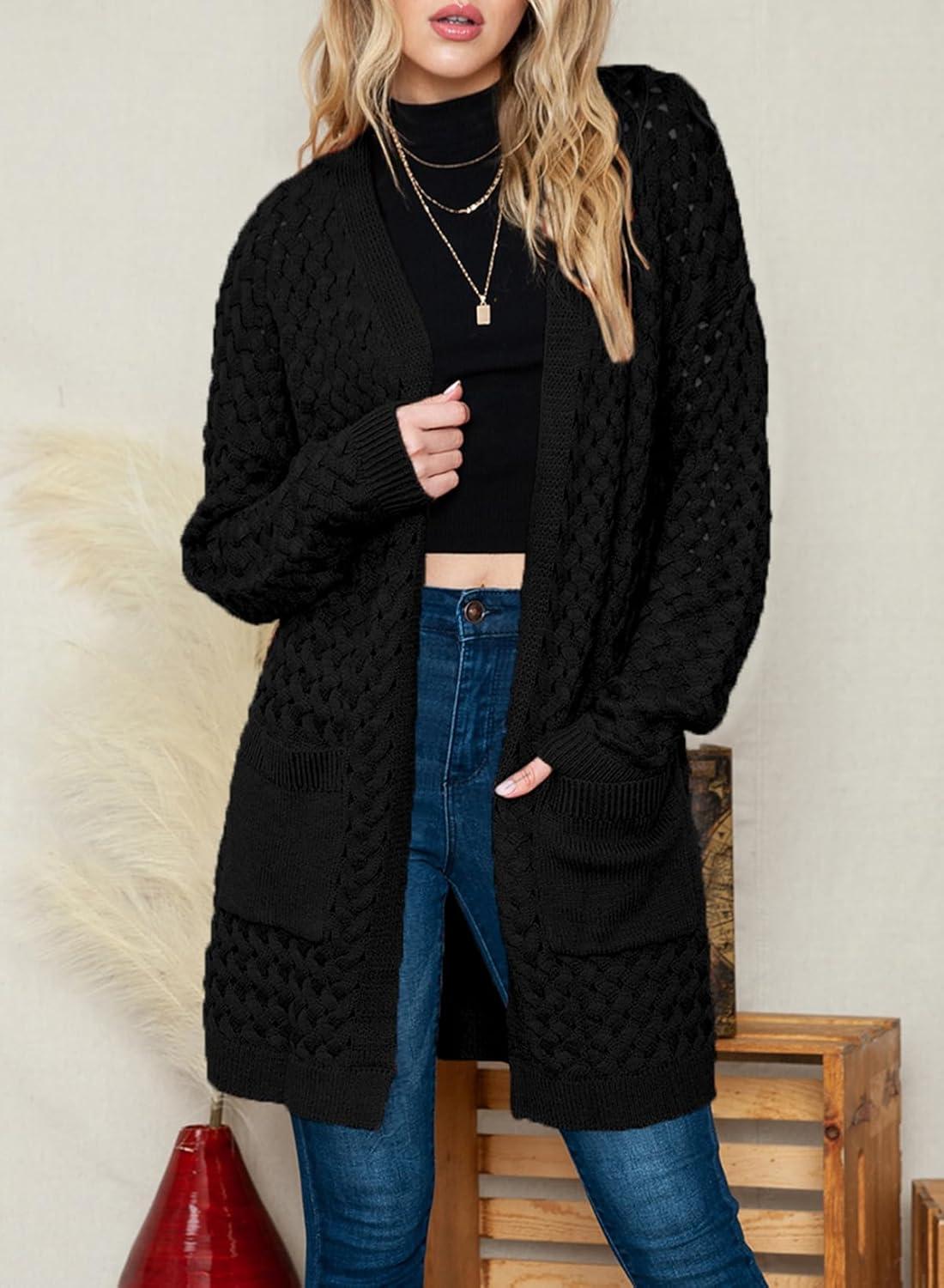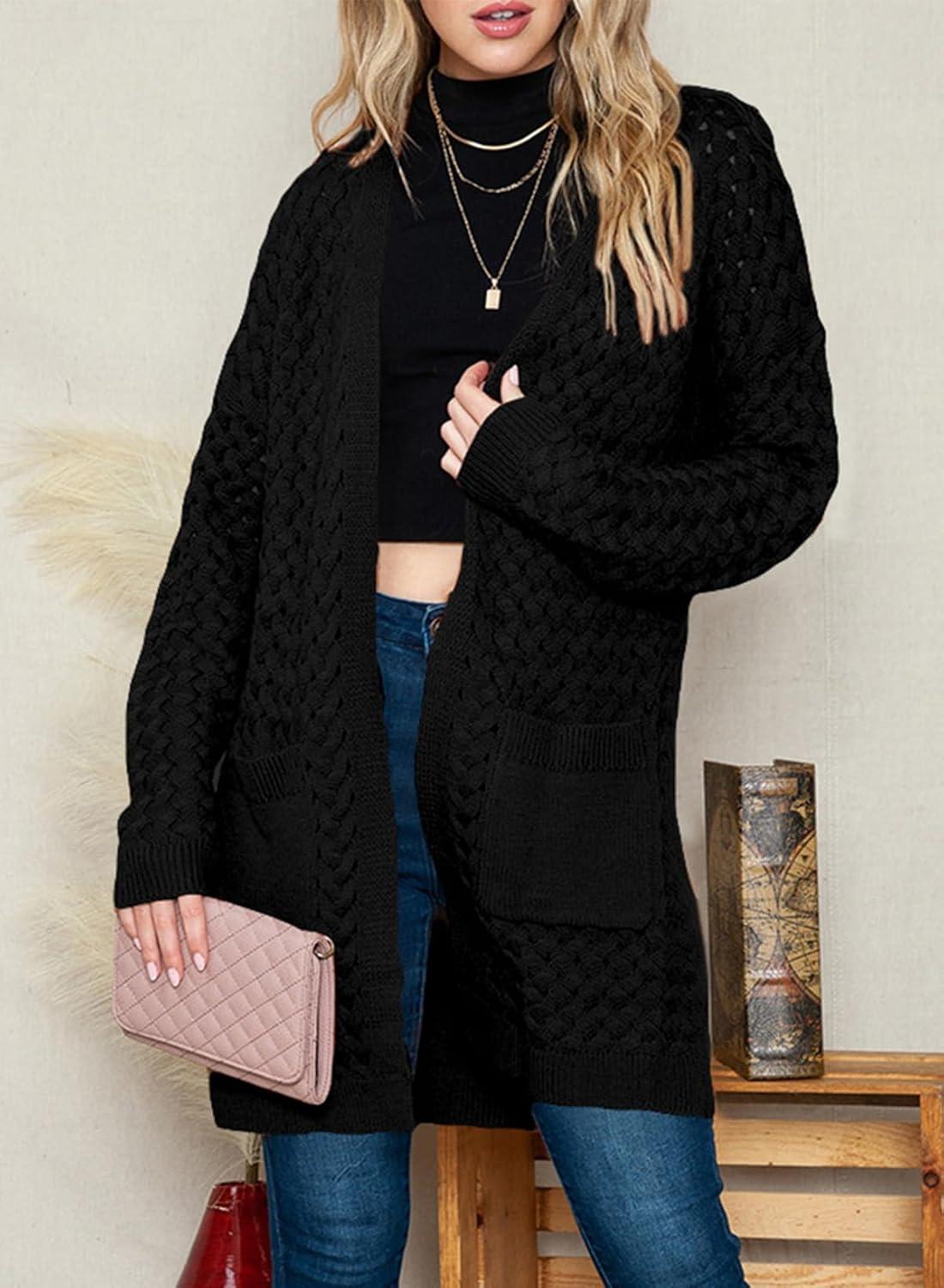 Dokotoo Women’s 2025 Fashion Casual Open Front Long Sleeve Chunky Cable Knit Cardigans Sweaters Outerwear Coats with Pockets(Black)