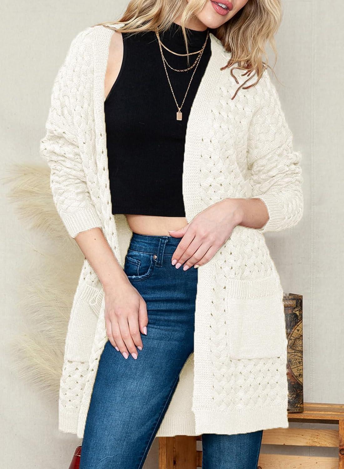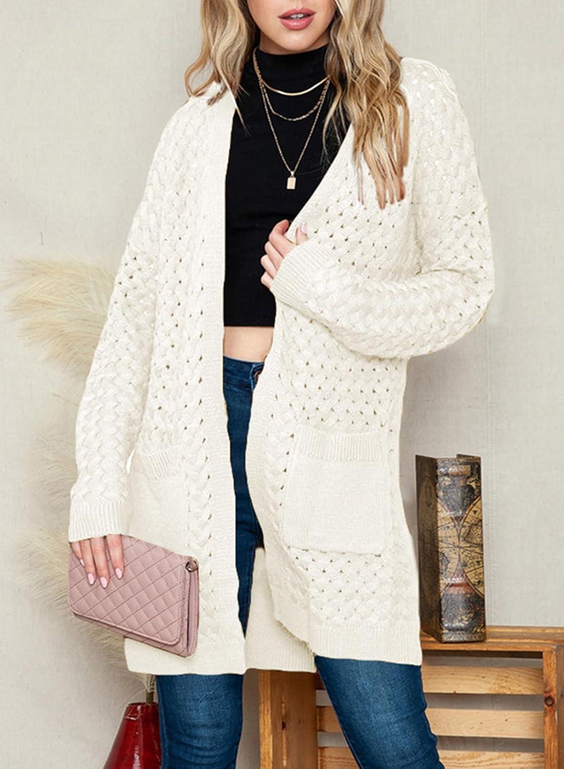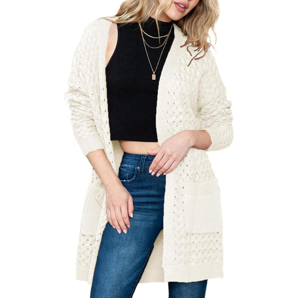Dokotoo Women’s 2025 Fashion Casual Open Front Long Sleeve Chunky Cable Knit Cardigans Sweaters Outerwear Coats with Pockets(White)