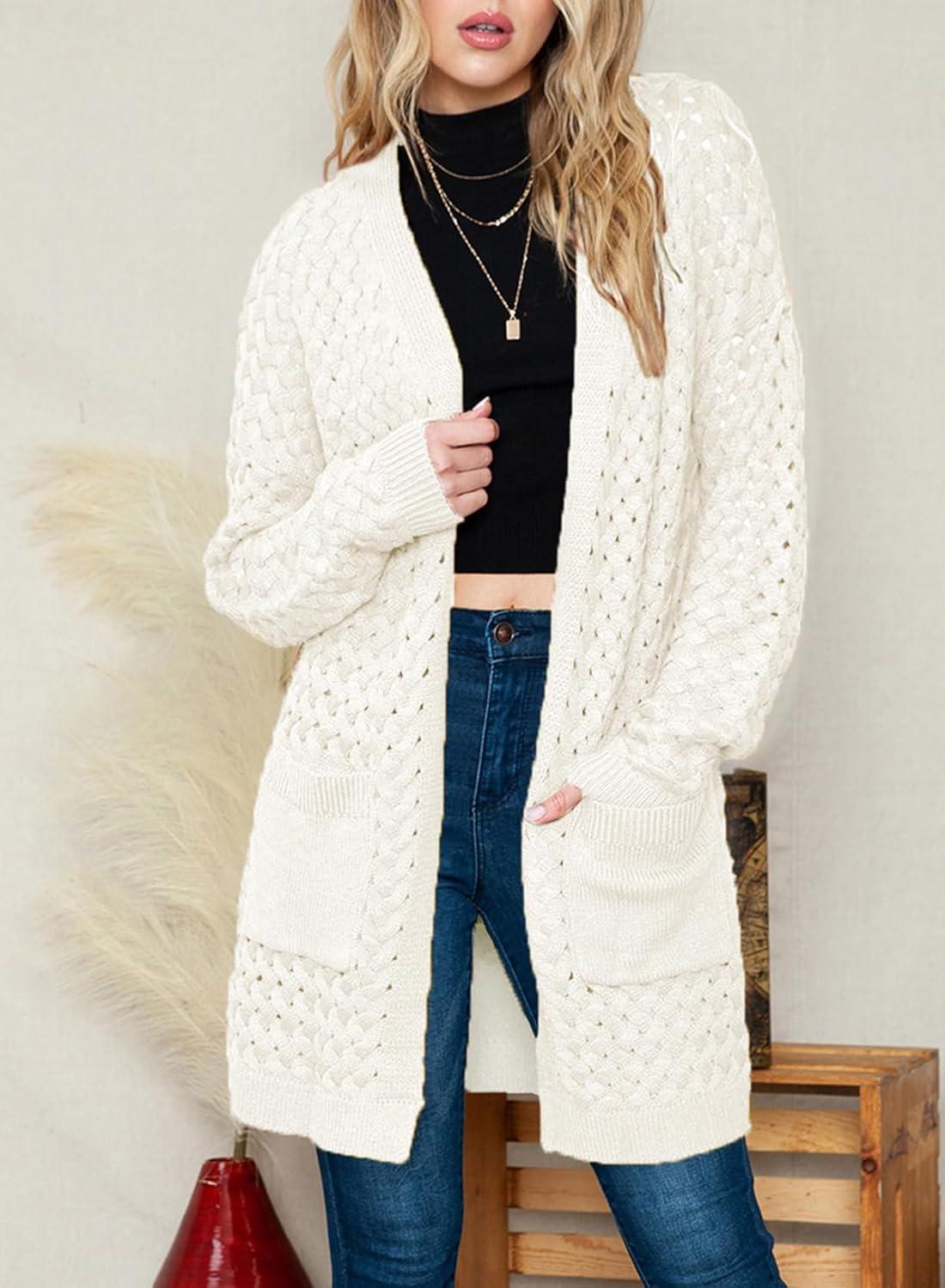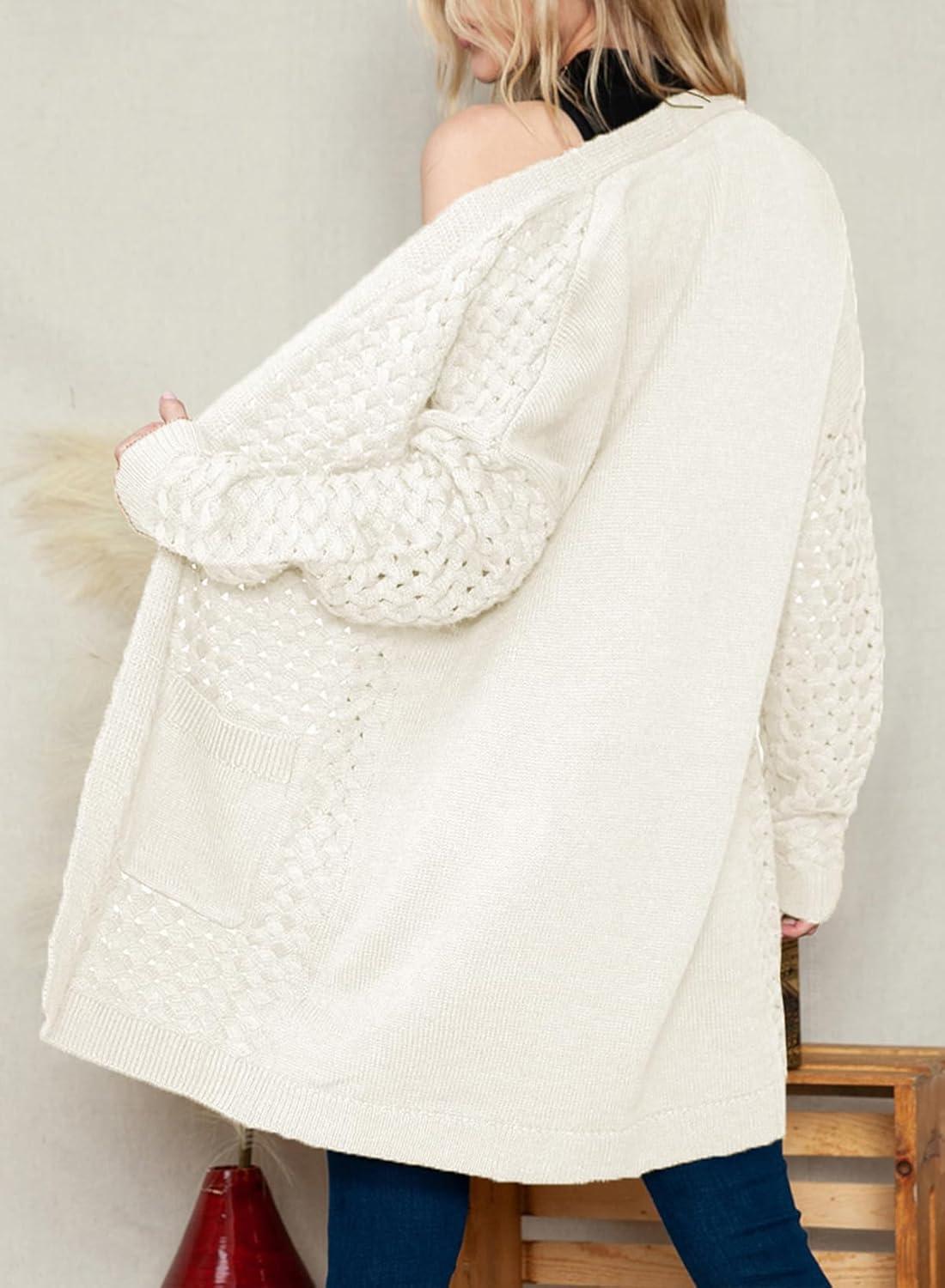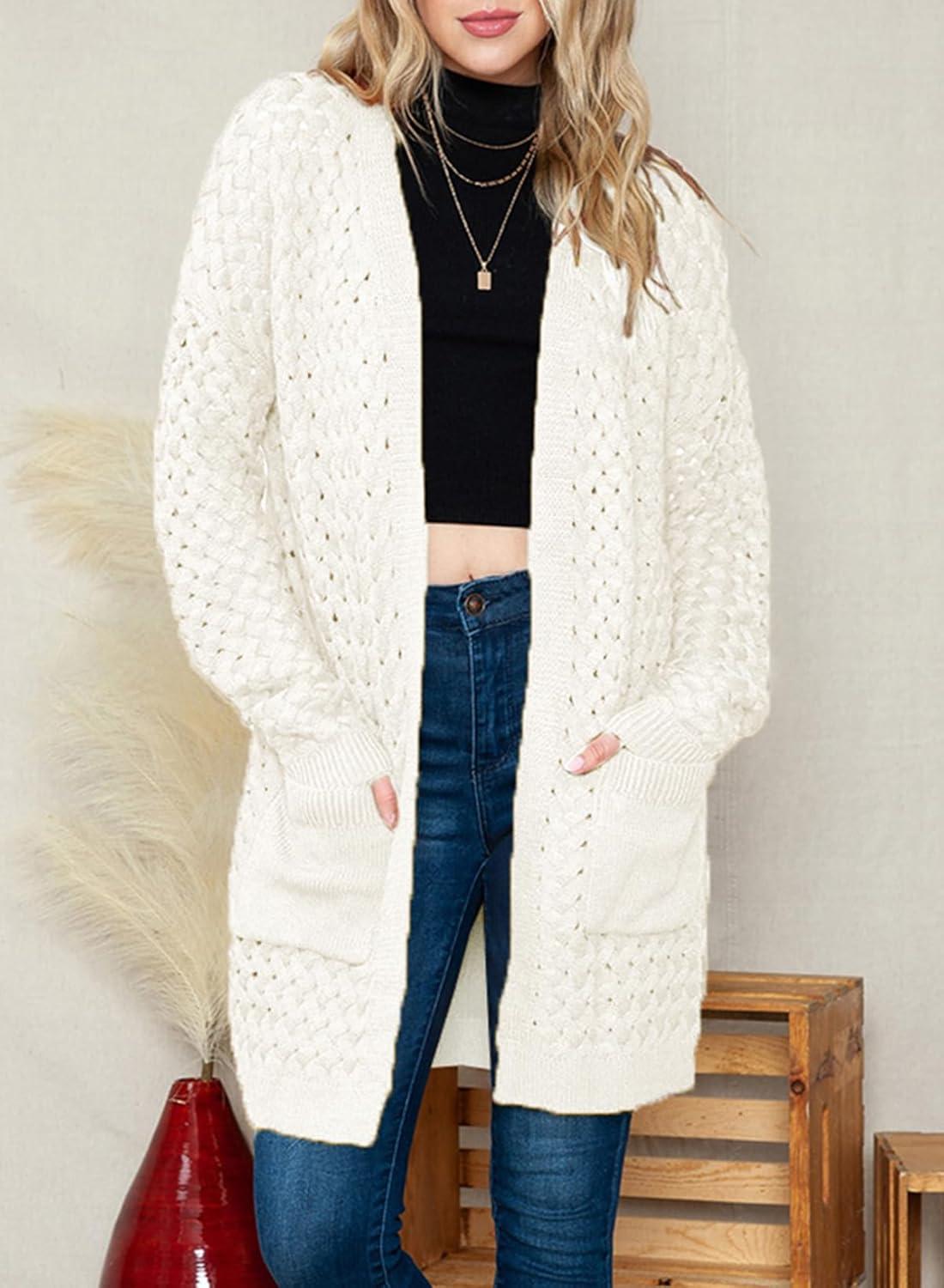 Dokotoo Women’s 2025 Fashion Casual Open Front Long Sleeve Chunky Cable Knit Cardigans Sweaters Outerwear Coats with Pockets(White)