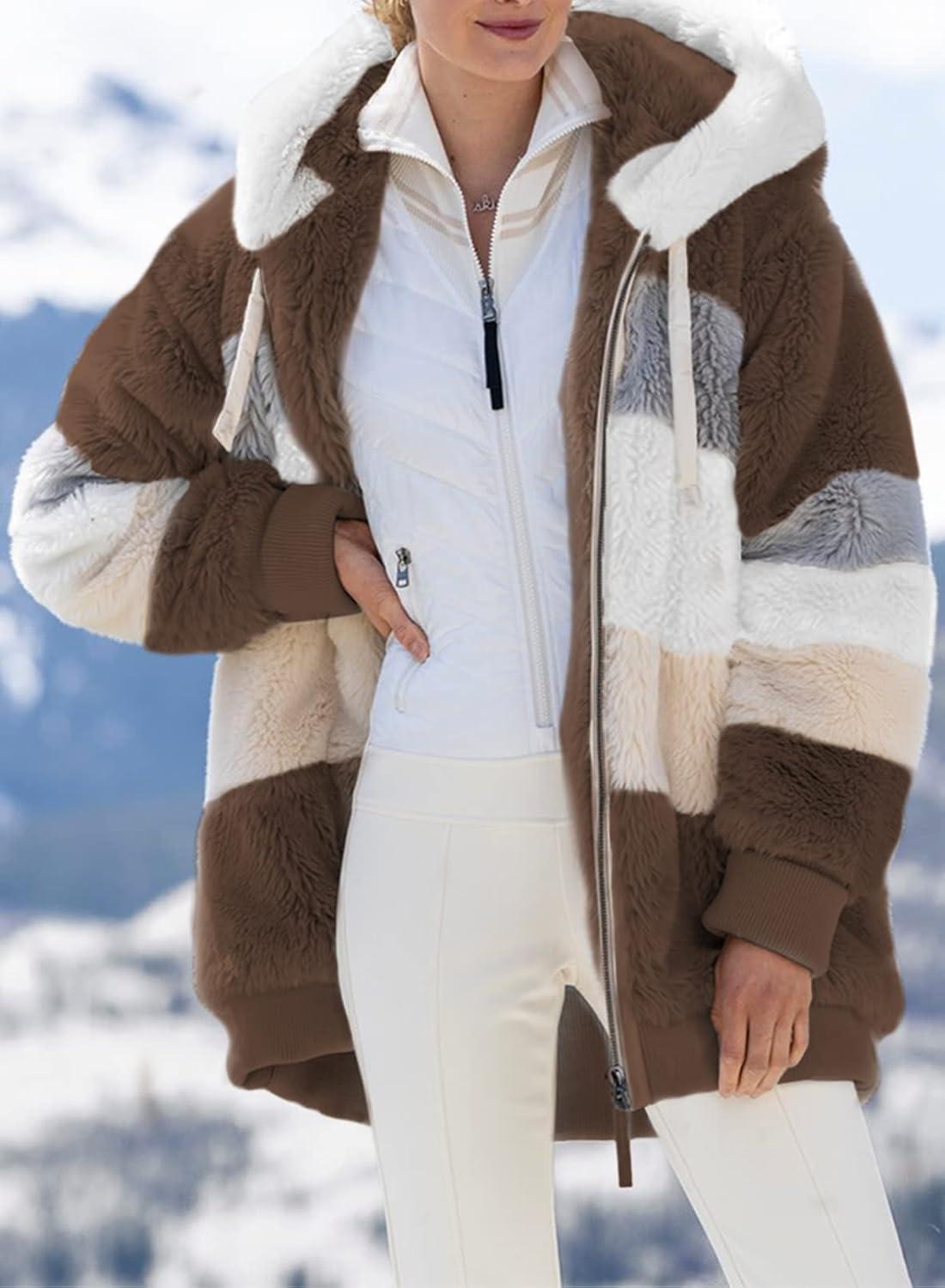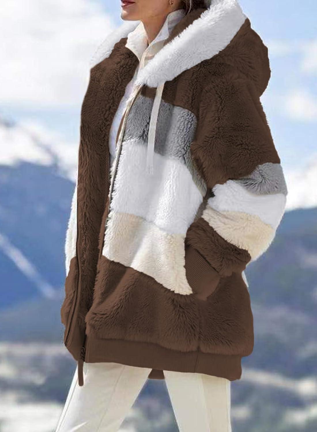 Dokotoo Womens 2025 Winter Fuzzy Fleece Jacket Hooded Color Block Patchwork Cardigan Coats Outerwear with Pockets(A Brown 2)
