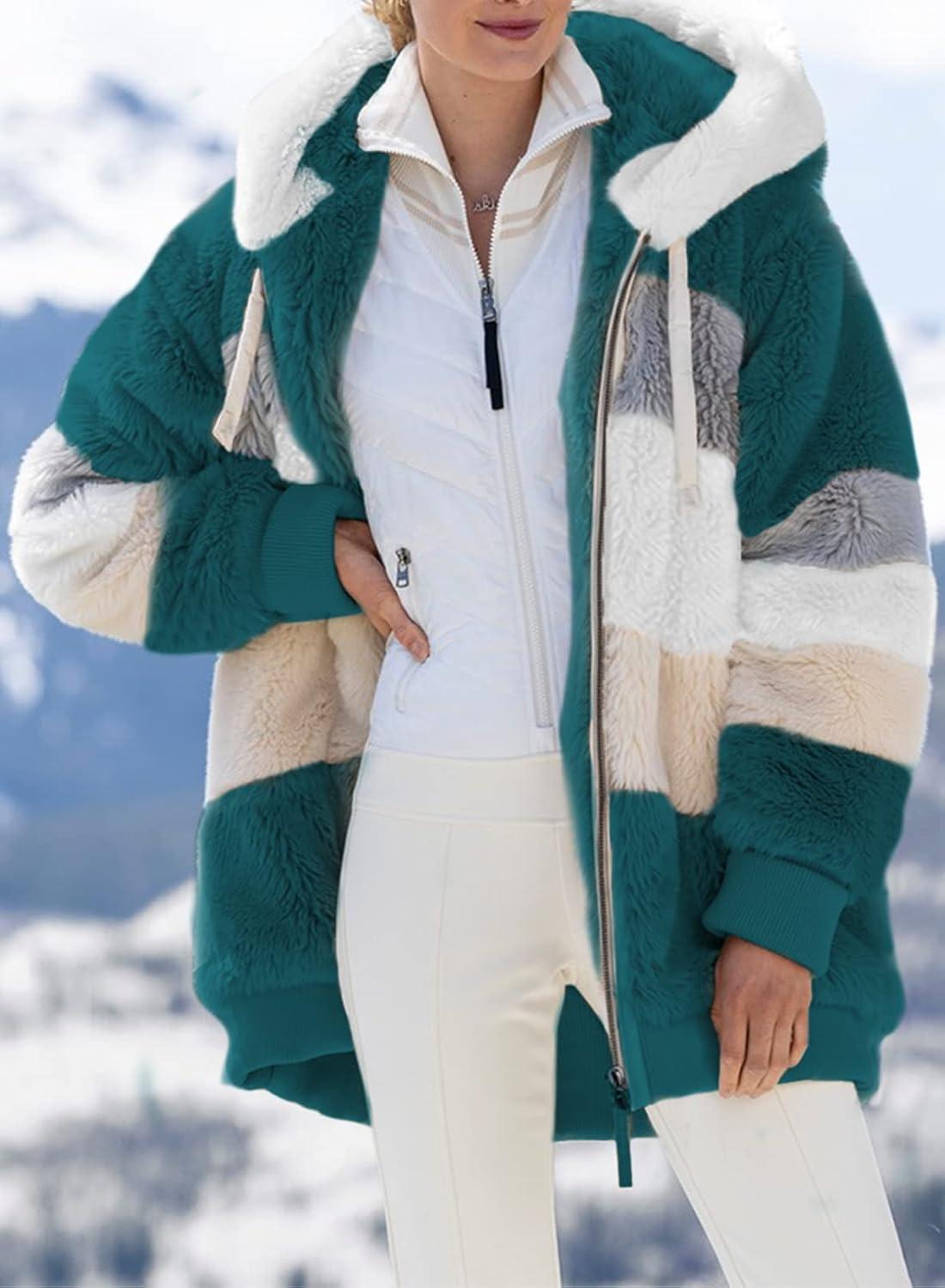 Dokotoo Womens 2025 Winter Fuzzy Fleece Jacket Hooded Color Block Patchwork Cardigan Coats Outerwear with Pockets(A Green 2)