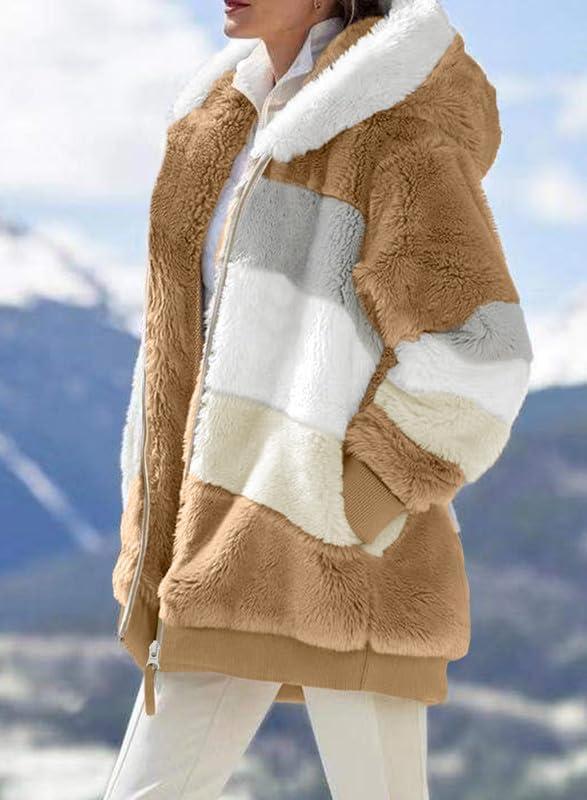 Dokotoo Womens 2025 Winter Fuzzy Fleece Jacket Hooded Color Block Patchwork Cardigan Coats Outerwear with Pockets(A Khaki)