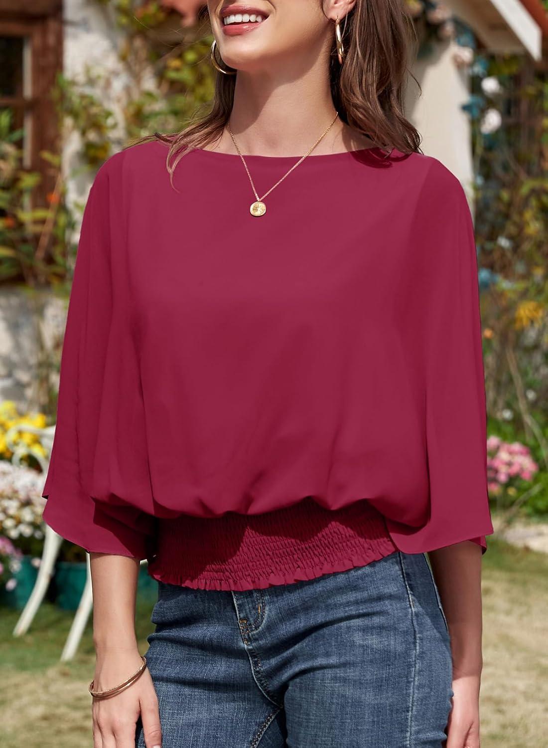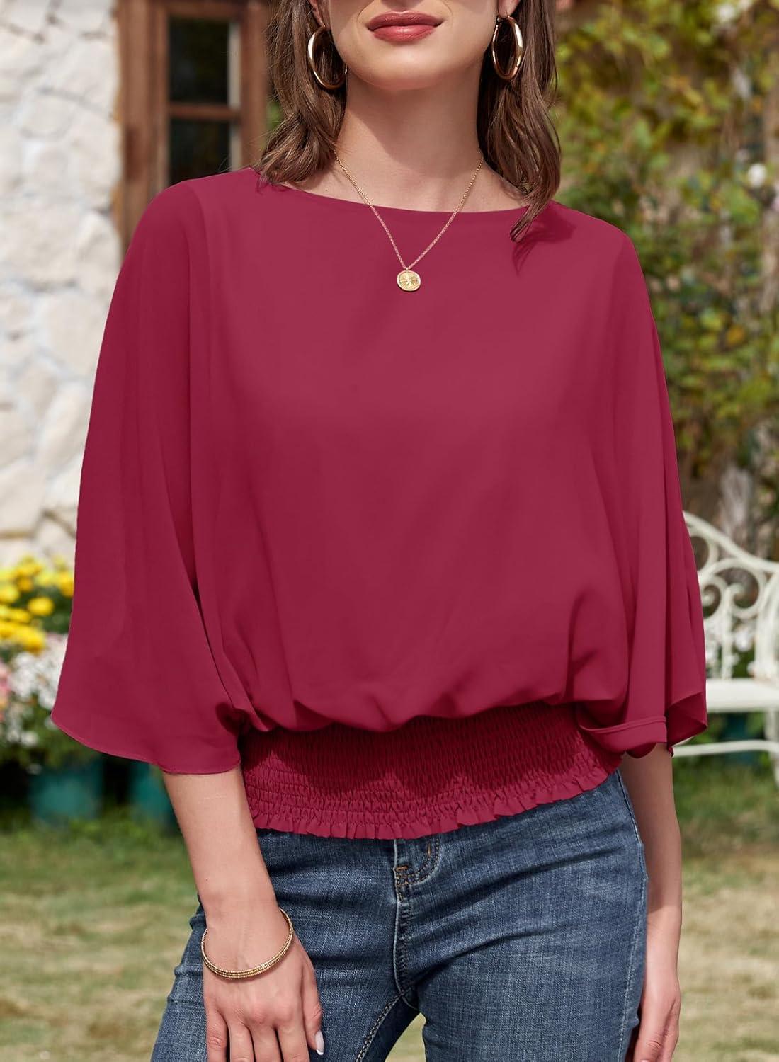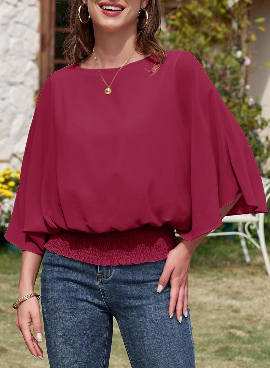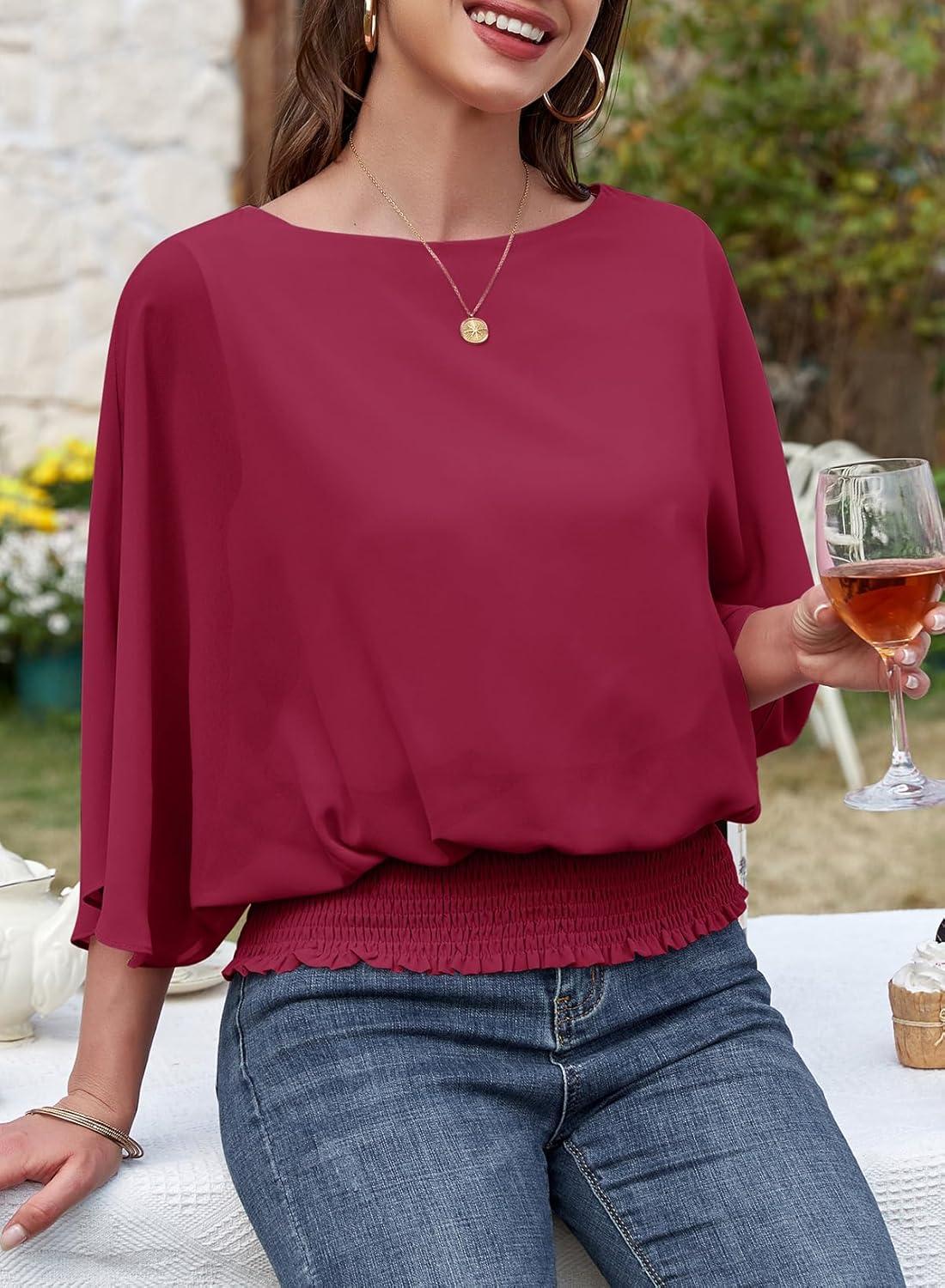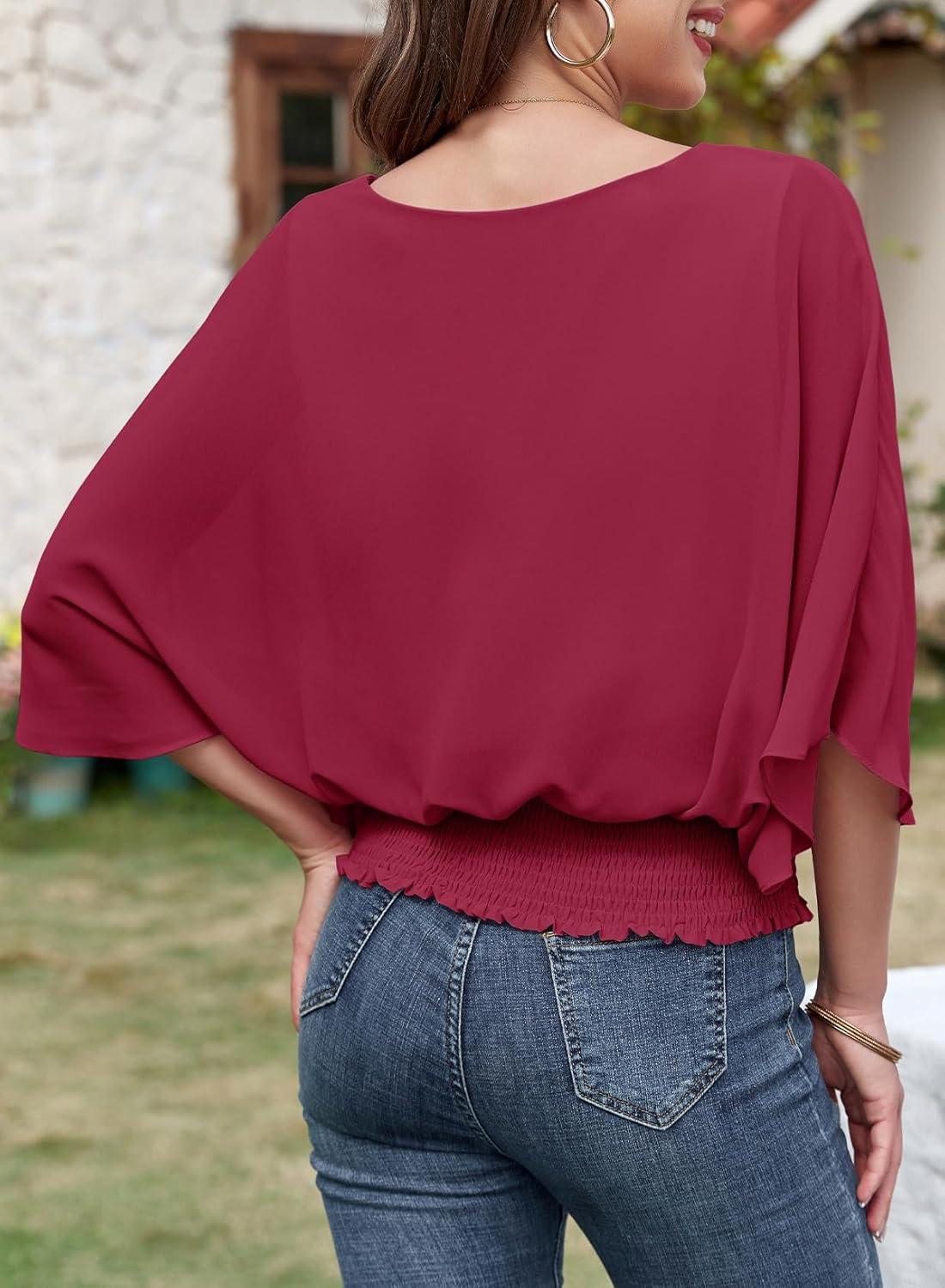 Dokotoo Womens Blouses Dressy Casual Boat Neck Flowy Chiffon Blouses Poncho Batwing Tops(Red Dahlia)