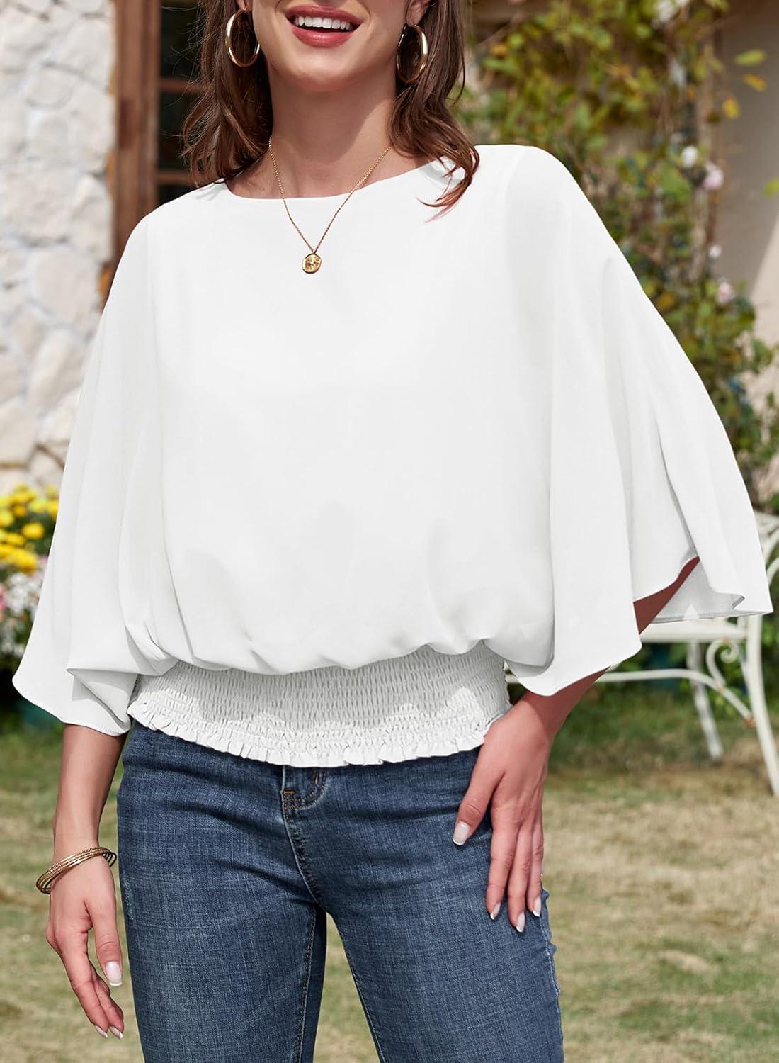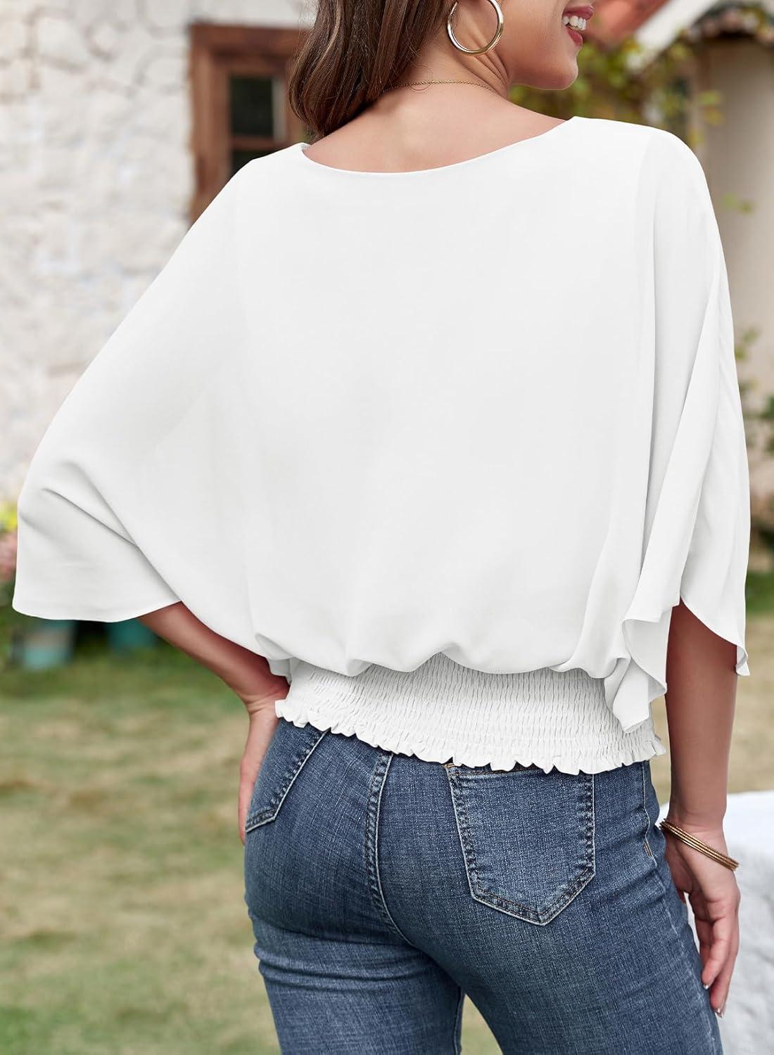 Dokotoo Womens Blouses Dressy Casual Boat Neck Flowy Chiffon Blouses Poncho Batwing Tops(White)