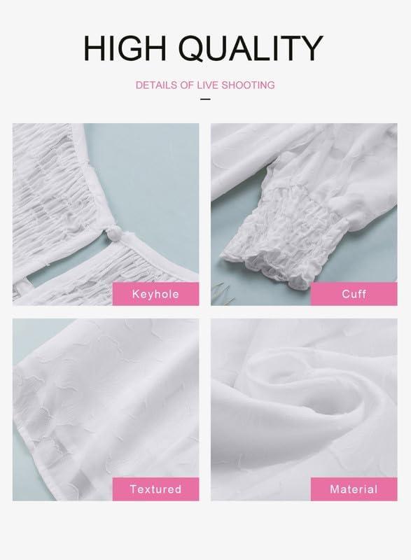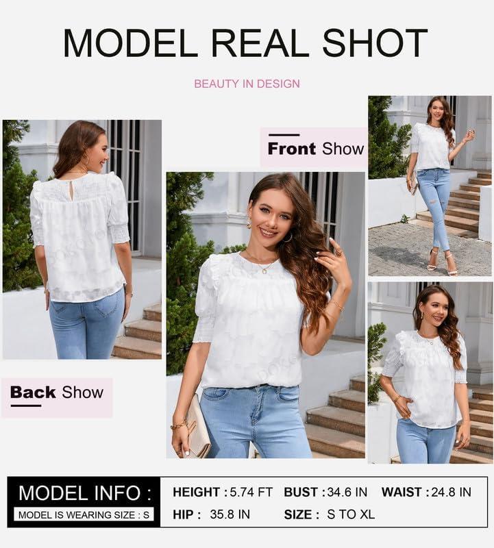 Dokotoo Womens Blouses Half Sleeve Shirred Tops Crewneck Lace Textured Flowy Casual Shirts(White)