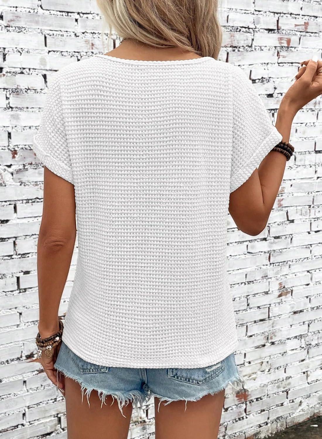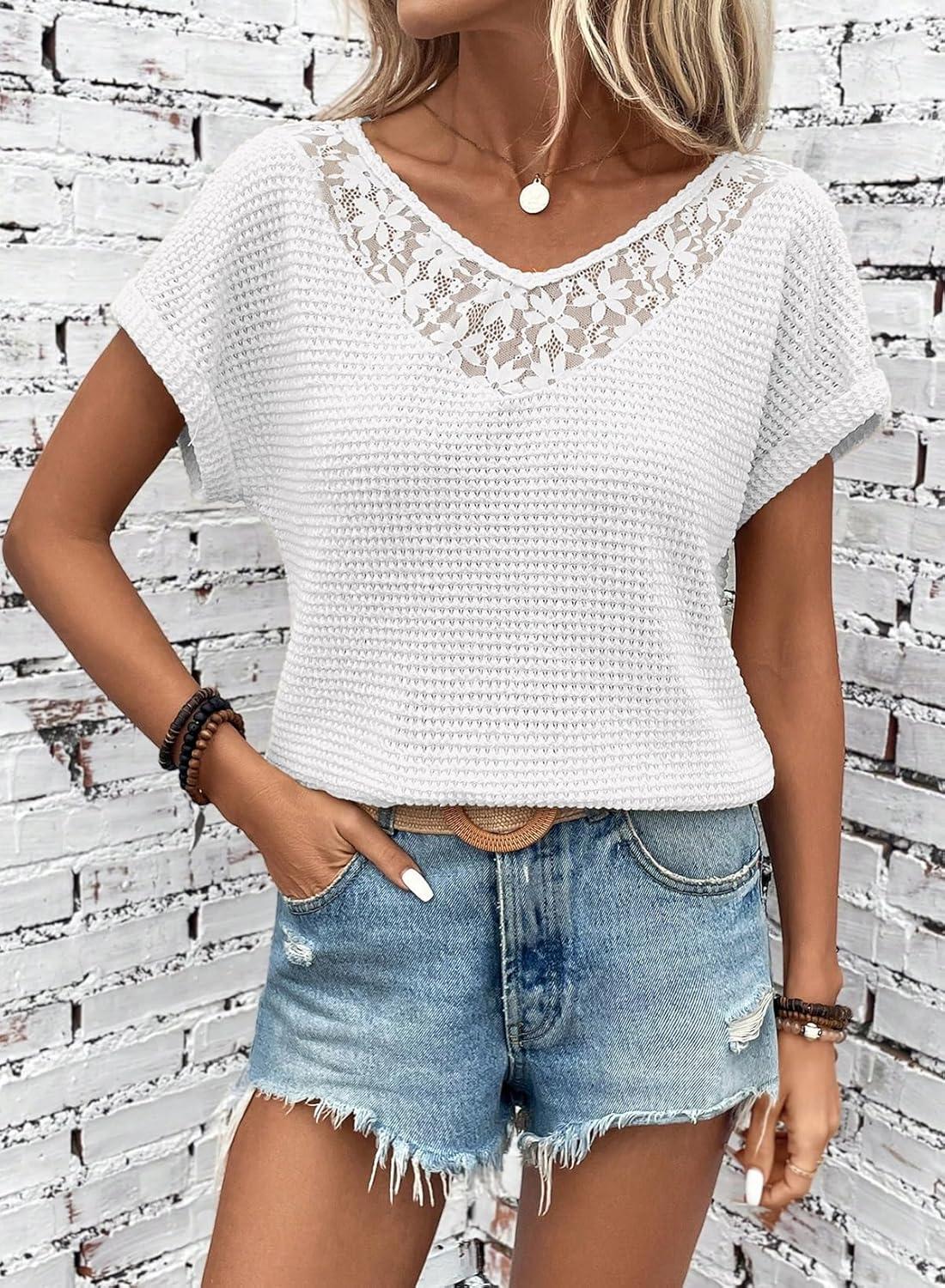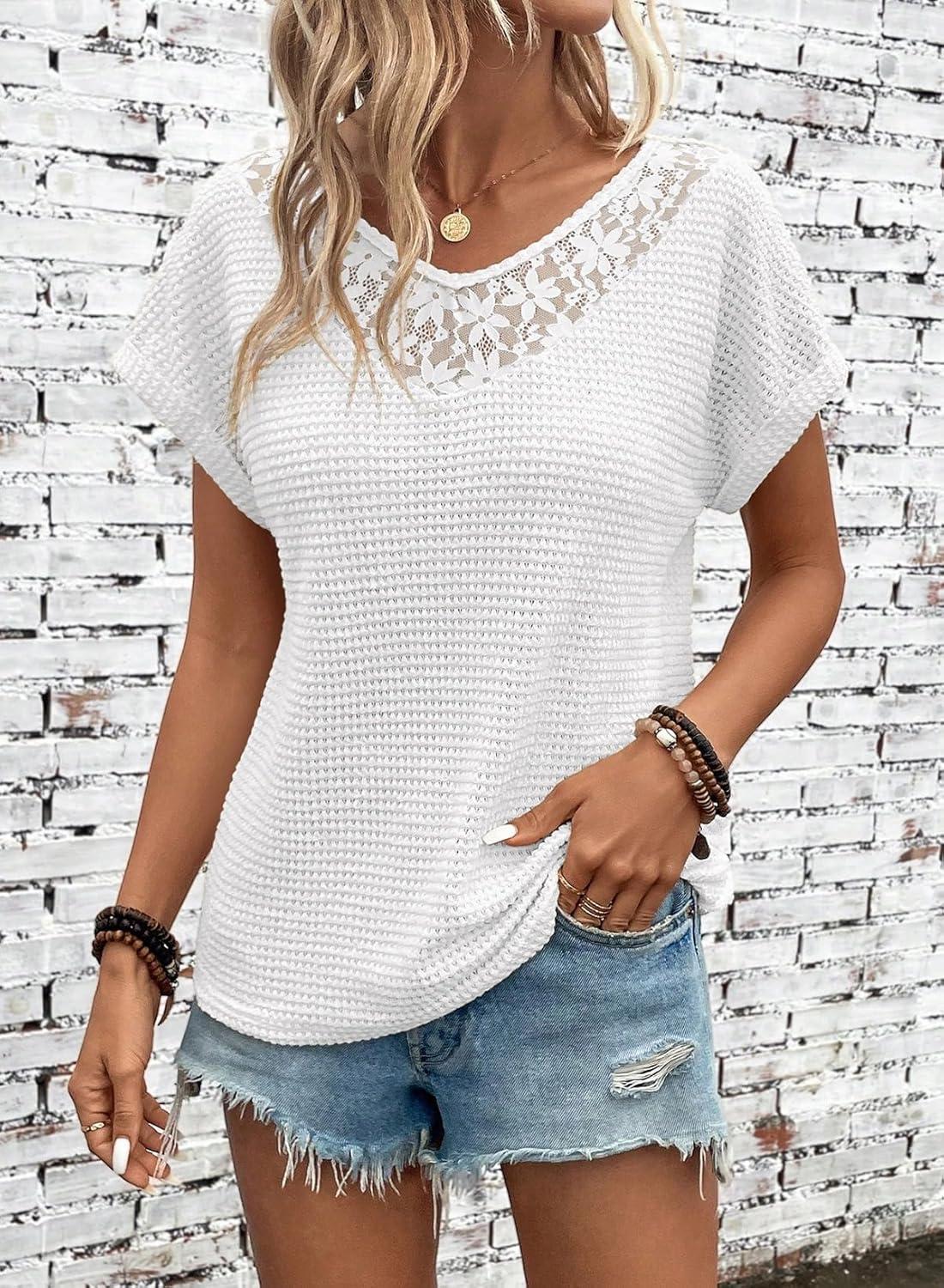 Dokotoo Women’s Casual 2026 Waffle Knit Hollow Out Lace Tops Short Sleeve V Neck Loose Fit Shirts Blouses(White)