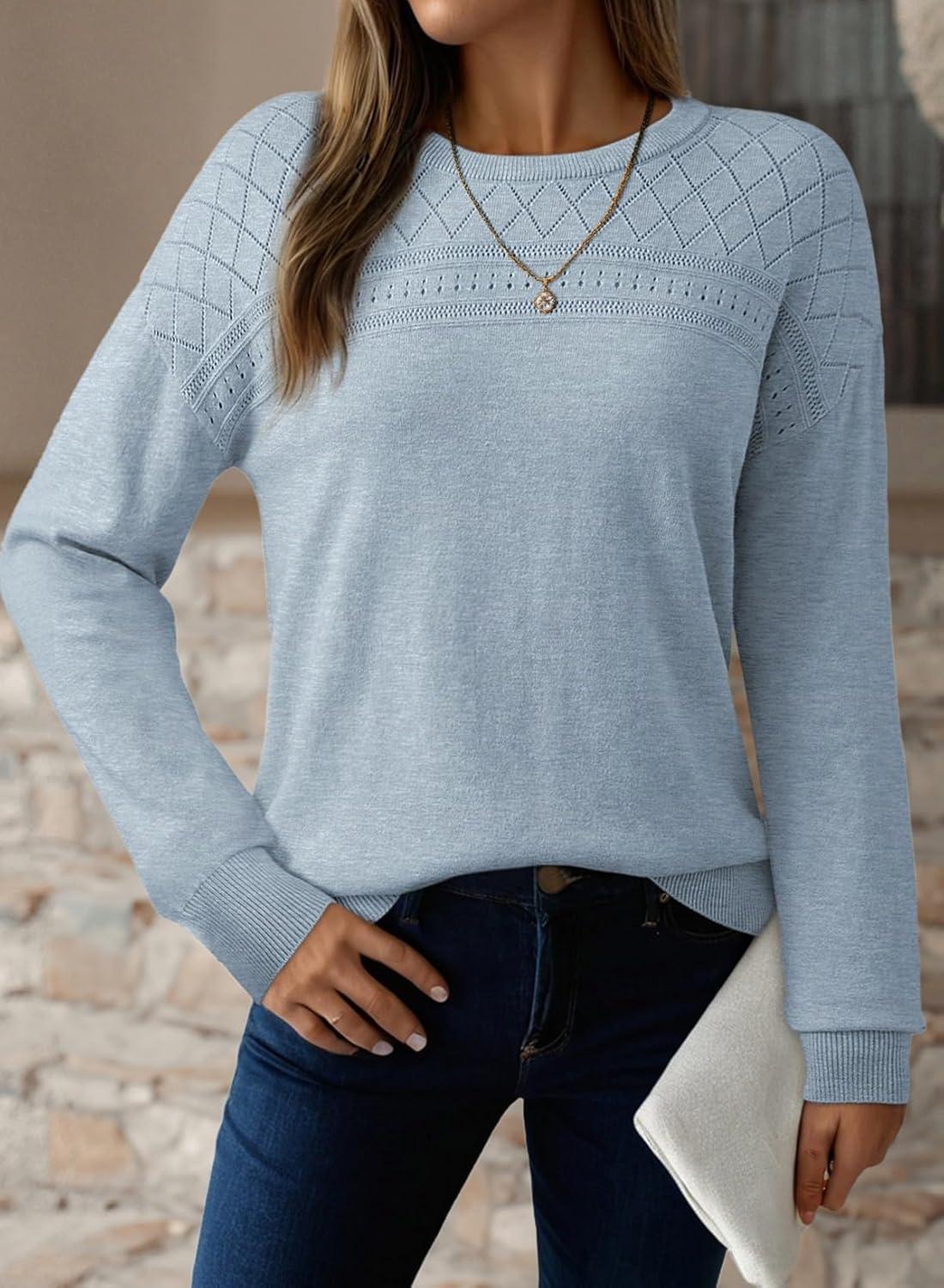 Dokotoo Women’s Casual Long Sleeve Wool Hollow Out Sweaters for Women 2025 Trendy Lightweight Crochet Pullover Tops(Beau Blue)