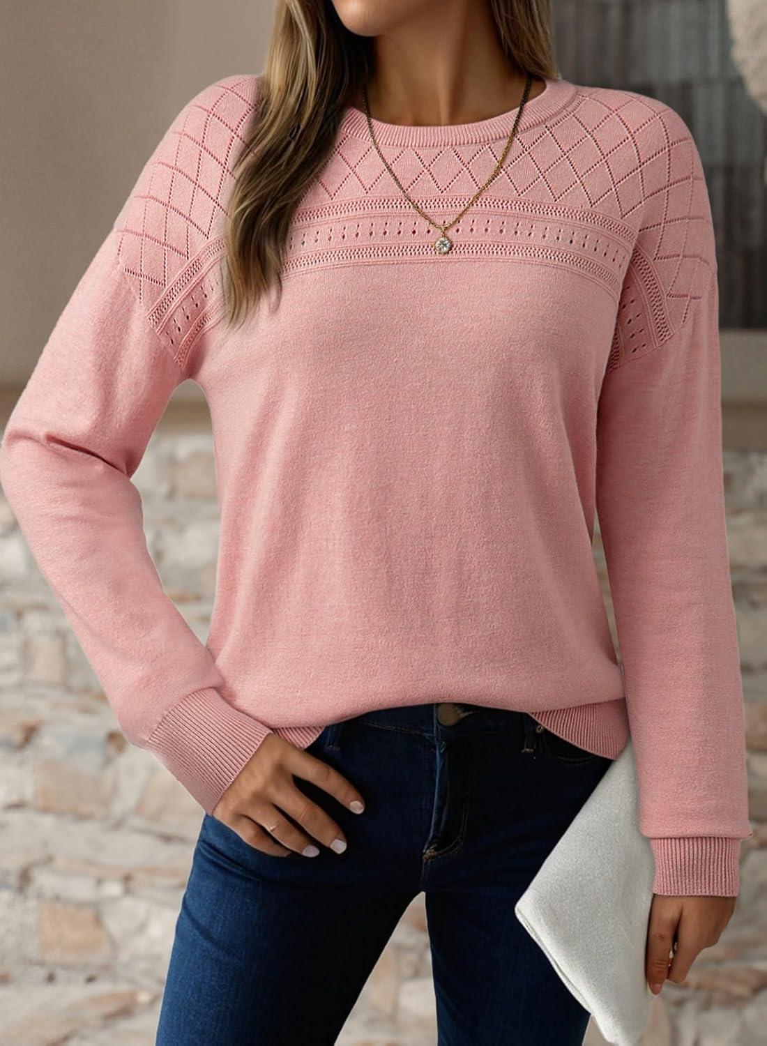 Dokotoo Women’s Casual Long Sleeve Wool Hollow Out Sweaters for Women 2025 Trendy Lightweight Crochet Pullover Tops(Gossamer Pink)